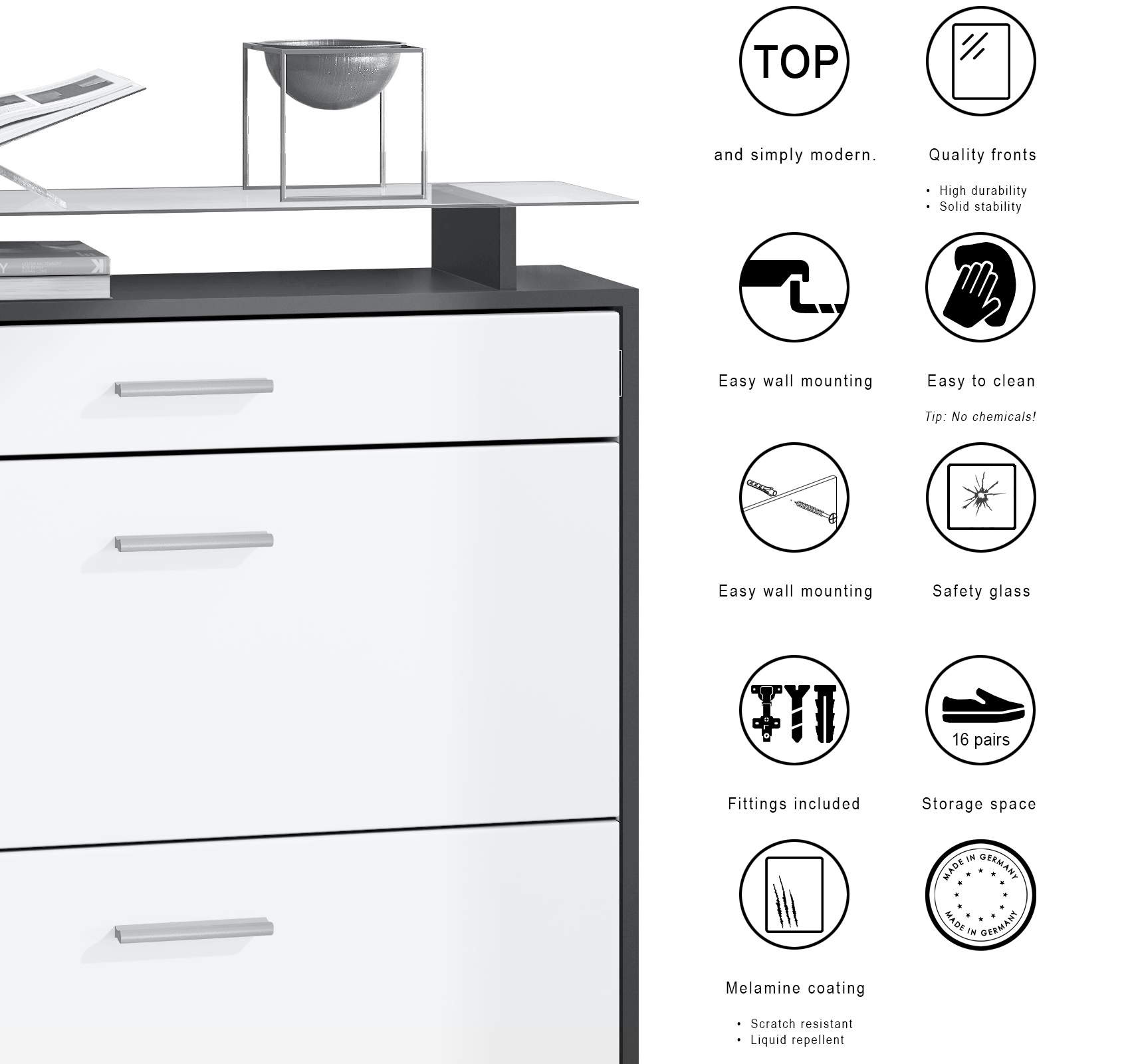 Für eine besondere Eleganz sorgen die Fronten des Garderobensets, die Ihnen eine Vielzahl an Kombinationsmöglichkeiten bieten. Durch die Oberflächenbeschichtung der einzelnen Möbelstücke erhalten Sie besonders pflegeleichte Produkte. Für die Reinigung können Sie auf Chemie verzichten - es reicht ein leicht angefeuchtetes Tuch, um die wasserfesten Oberflächen angemessen zu reinigen.
