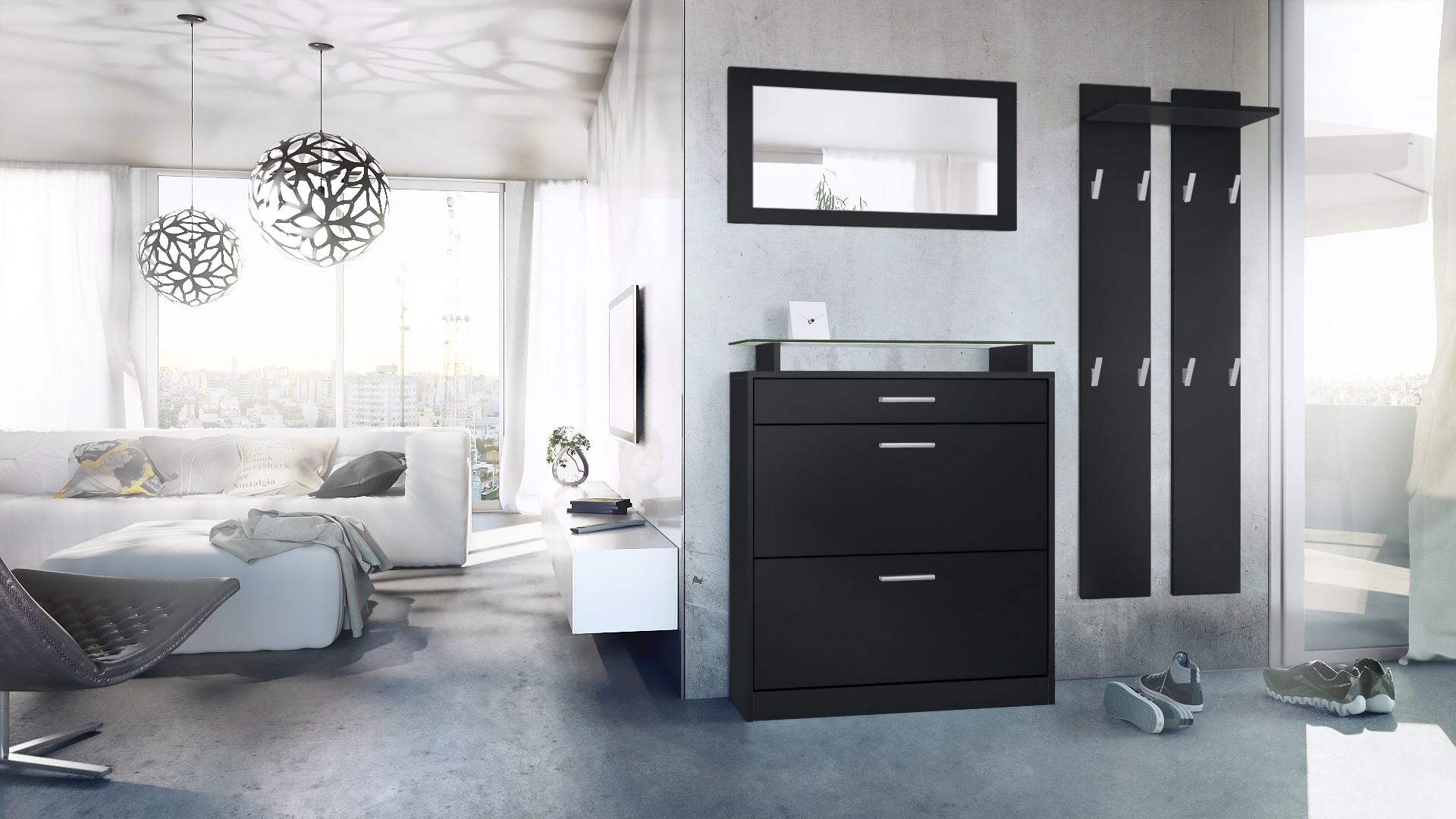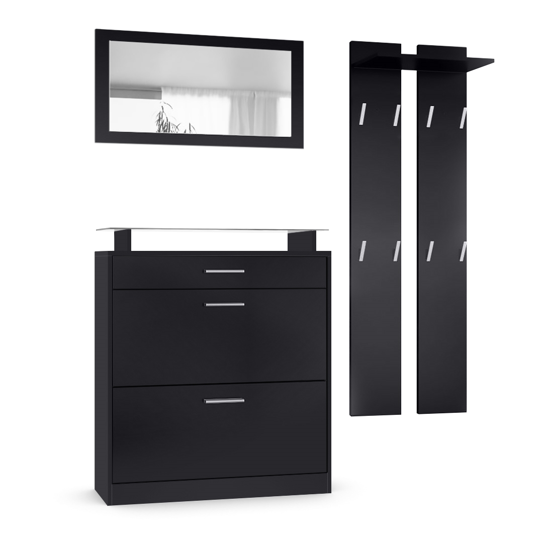 Produktinformationen "Garderobenset Loret mini 1 Wandspiegel, 2 Garderobenpaneele Schwarz matt/Schwarz matt (Schuhschrank 89 x 104 x 23 cm)"