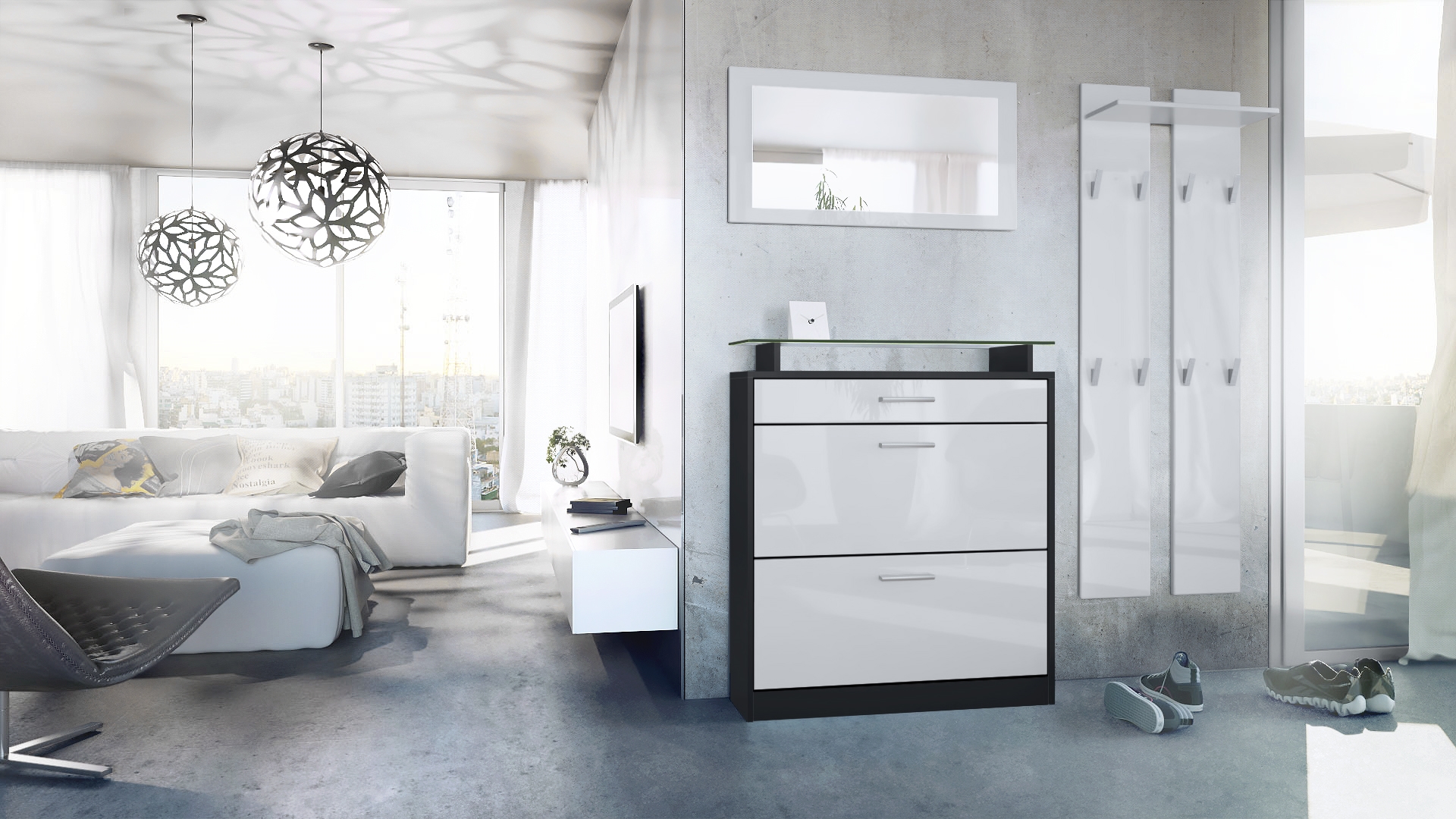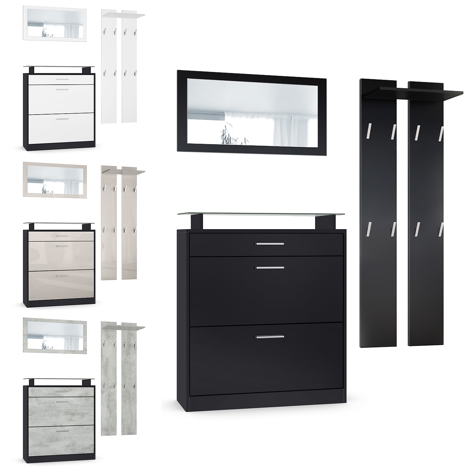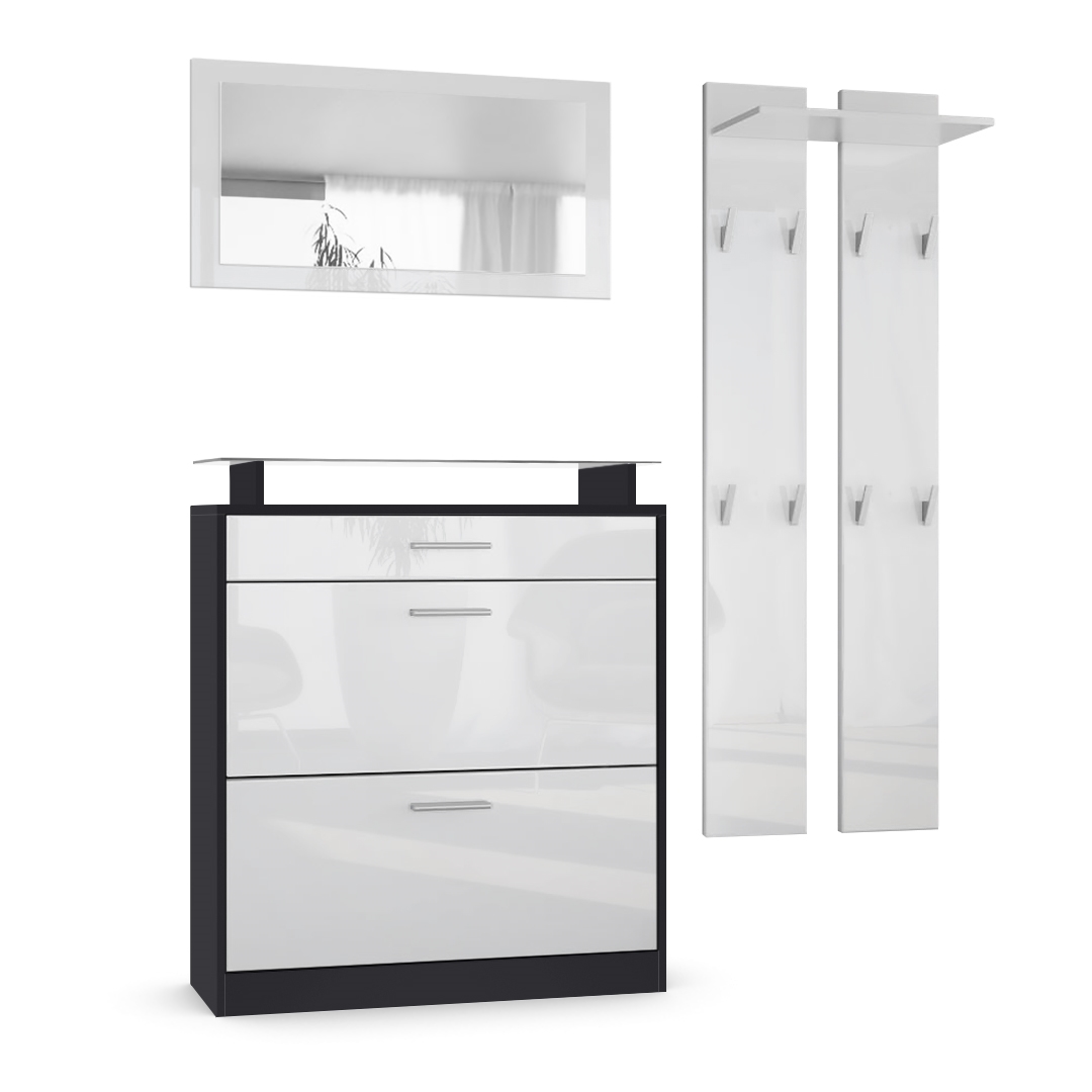 Produktinformationen "Garderobenset Loret mini 1 Wandspiegel, 2 Garderobenpaneele Schwarz matt/Weiß Hochglanz (Schuhschrank 89 x 104 x 23 cm)"
