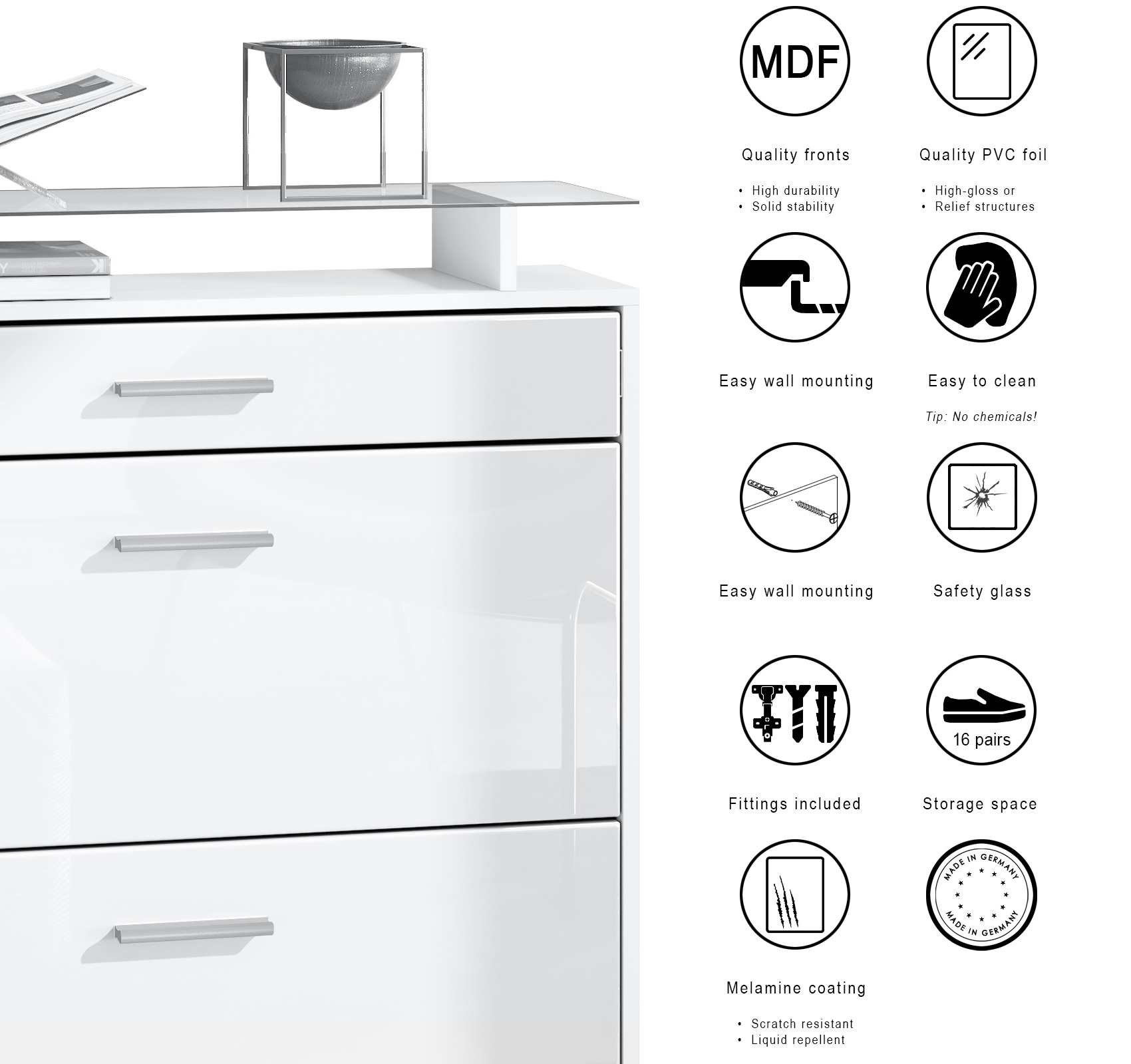 Für eine besondere Eleganz sorgen die Fronten des Garderobensets, die Ihnen eine Vielzahl an Kombinationsmöglichkeiten bieten. Durch die Oberflächenbeschichtung der einzelnen Möbelstücke erhalten Sie besonders pflegeleichte Produkte. Für die Reinigung können Sie auf Chemie verzichten - es reicht ein leicht angefeuchtetes Tuch, um die wasserfesten Oberflächen angemessen zu reinigen.