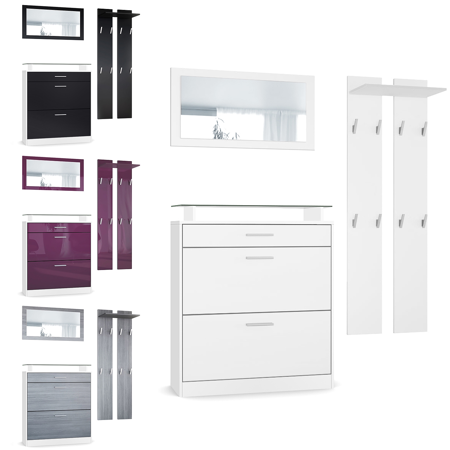 Die moderne Garderobe Loret mini besteht aus einem Schuhschrank, zwei Wandpaneelen mit jeweils vier Garderobenhaken, einem Ablagefach und einem zusätzlich dekorativen Wandspiegel, hergestellt in Deutschland. Alle vier Flurmöbel lassen sich individuell zusammenstellen und bieten grenzenlose Gestaltungsmöglichkeiten für Ihren Flur oder die Diele. Der Schuhschrank bietet mit zwei Schuhkippern, einer Schublade und einer Glasablage genug Platz für bis zu 16 Paar Schuhe und weitere Accessoires. Der Schuhschrank enthält keine Rückwand.
