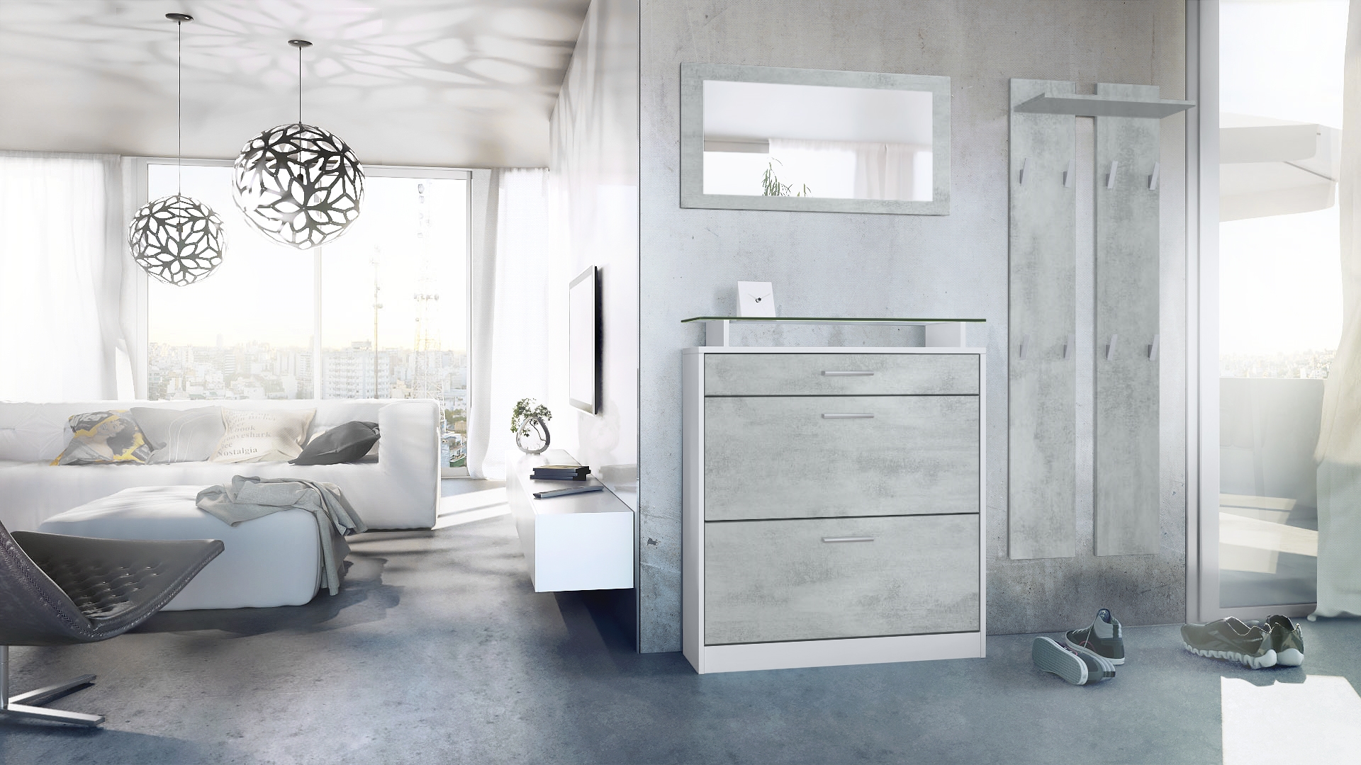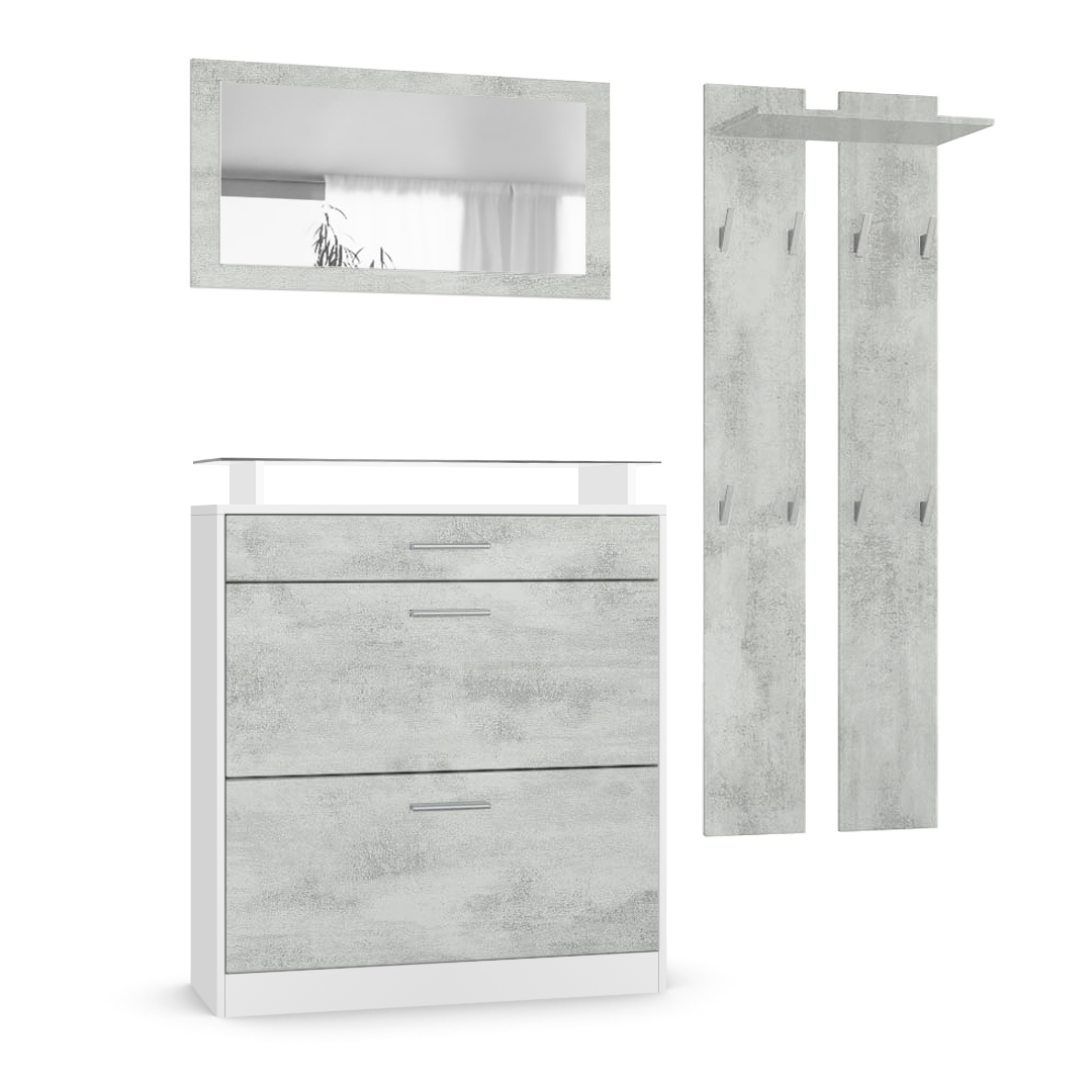Produktinformationen "Garderobenset Loret mini 1 Wandspiegel, 2 Garderobenpaneele Weiß matt/Beton Oxid Optik (Schuhschrank 89 x 104 x 23 cm)"