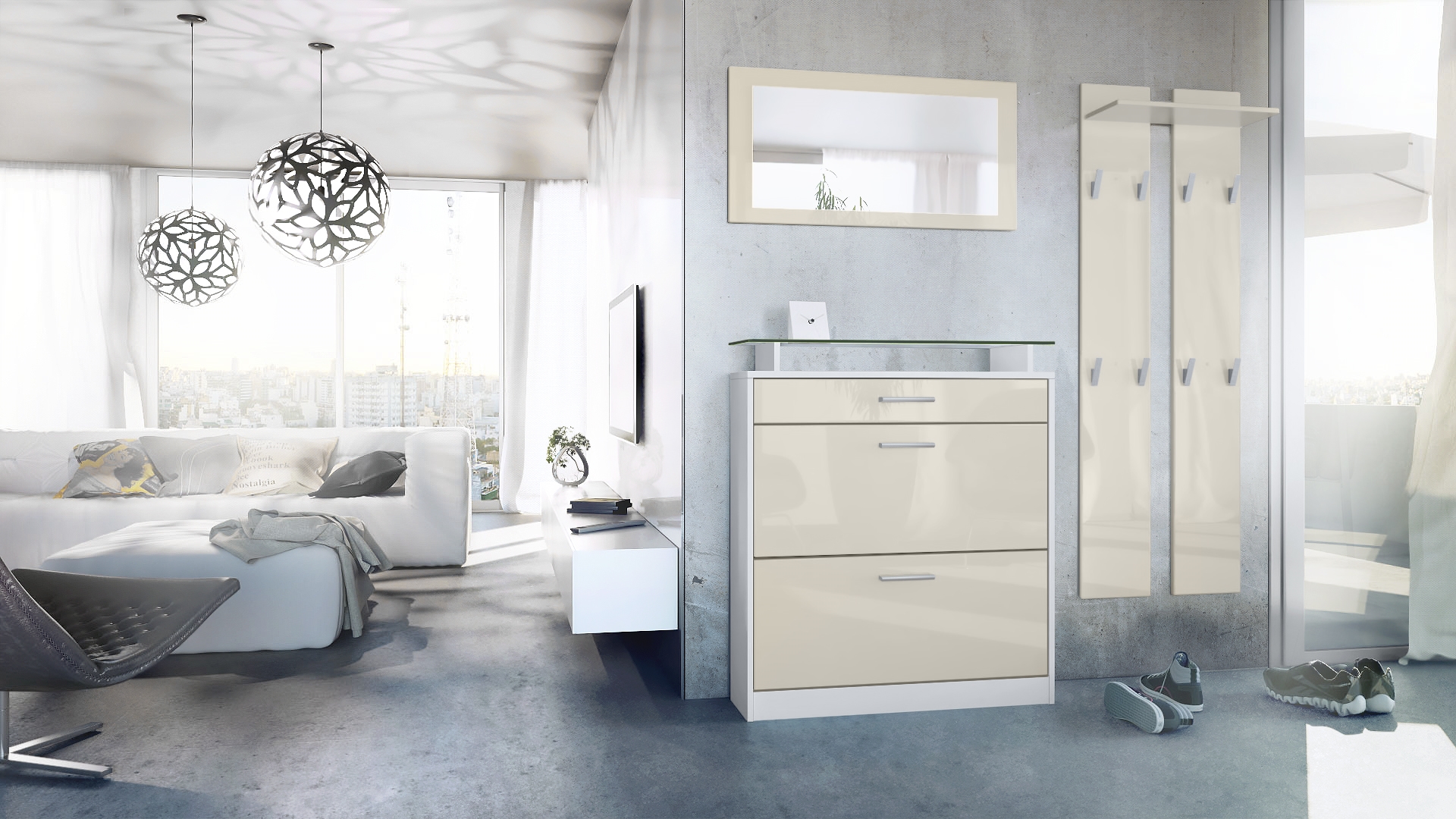 Produktinformationen "Garderobenset Loret mini 1 Wandspiegel, 2 Garderobenpaneele Weiß matt/Creme Hochglanz (Schuhschrank 89 x 104 x 23 cm)"
