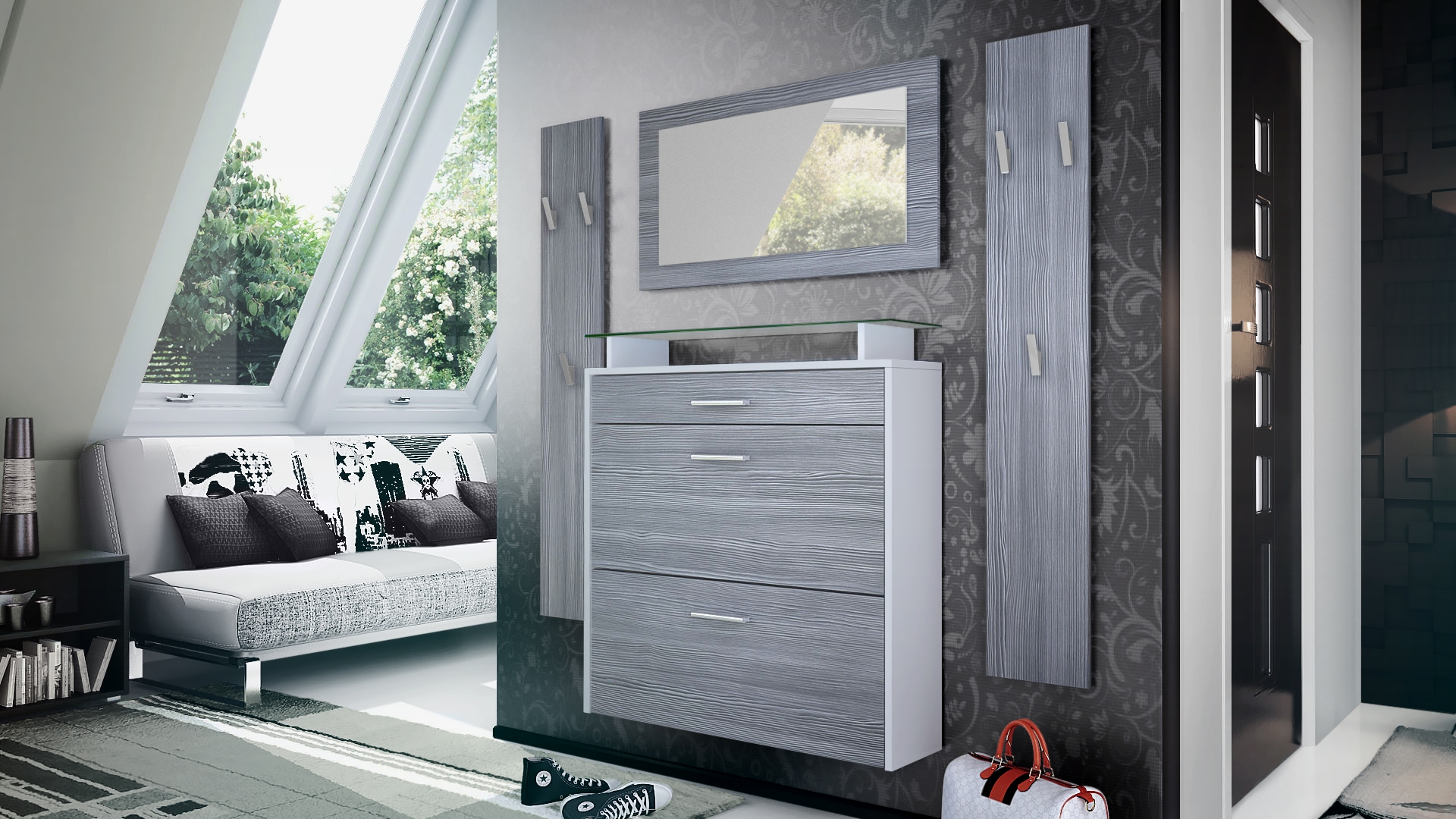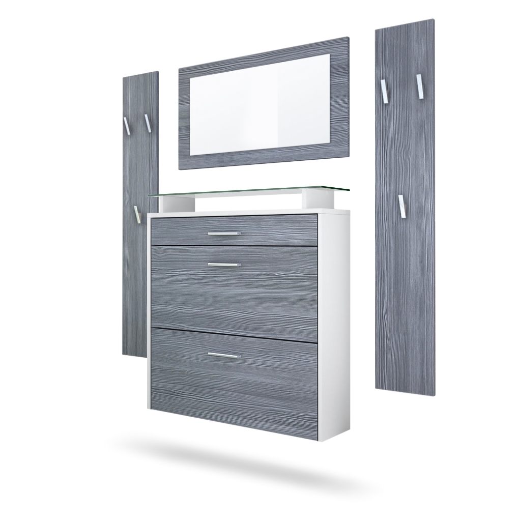 Die moderne Wandgarderobe Malea besteht aus einem Schuhschrank, zwei Garderobenpaneelen mit insgesamt sechs Garderobenhaken und einem zusätzlichen dekorativen Wandspiegel, hergestellt in Deutschland. Alle vier Flurmöbel lassen sich individuell zusammenstellen und bieten grenzenlose Gestaltungsmöglichkeiten für Ihren Flur oder die Diele. Der Schuhschrank bietet mit zwei Schuhkippern, einer Schublade und einer Glasablage genug Platz für bis zu 16 Paar Schuhe. Die beiden Wandpaneele bieten für bis zu sechs Jacken und Mäntel ausreichend Platz. Das Garderobenset kann nur hängend platziert werden, Material für die Wandaufhängung ist im Lieferumfang enthalten. Der Schuhschrank enthält keine Rückwand.