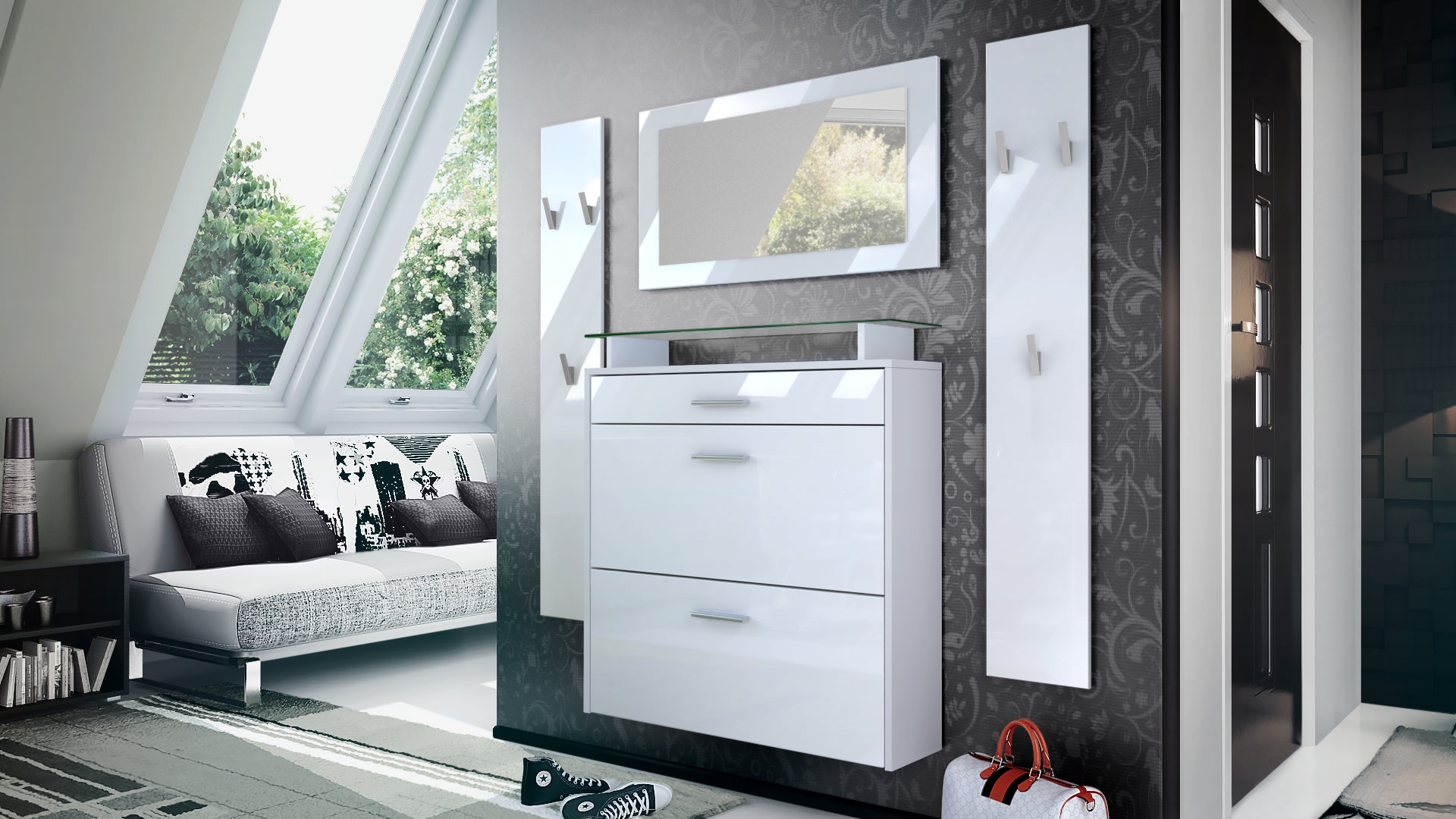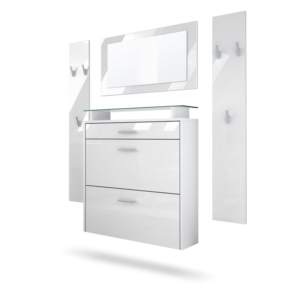 Die moderne Wandgarderobe Malea besteht aus einem Schuhschrank, zwei Garderobenpaneelen mit insgesamt sechs Garderobenhaken und einem zusätzlichen dekorativen Wandspiegel, hergestellt in Deutschland. Alle vier Flurmöbel lassen sich individuell zusammenstellen und bieten grenzenlose Gestaltungsmöglichkeiten für Ihren Flur oder die Diele. Der Schuhschrank bietet mit zwei Schuhkippern, einer Schublade und einer Glasablage genug Platz für bis zu 16 Paar Schuhe. Die beiden Wandpaneele bieten für bis zu sechs Jacken und Mäntel ausreichend Platz. Das Garderobenset kann nur hängend platziert werden, Material für die Wandaufhängung ist im Lieferumfang enthalten. Der Schuhschrank enthält keine Rückwand.