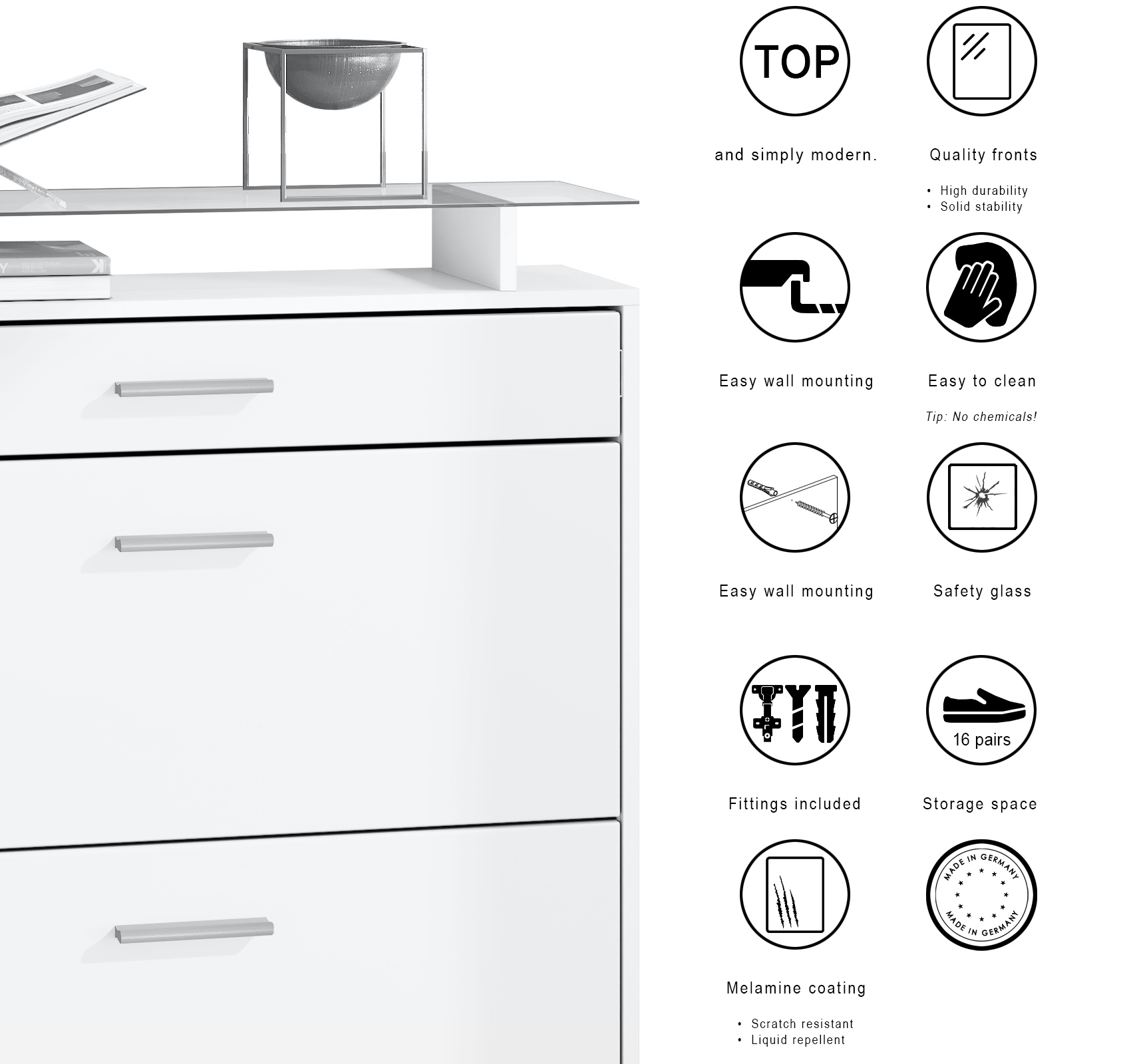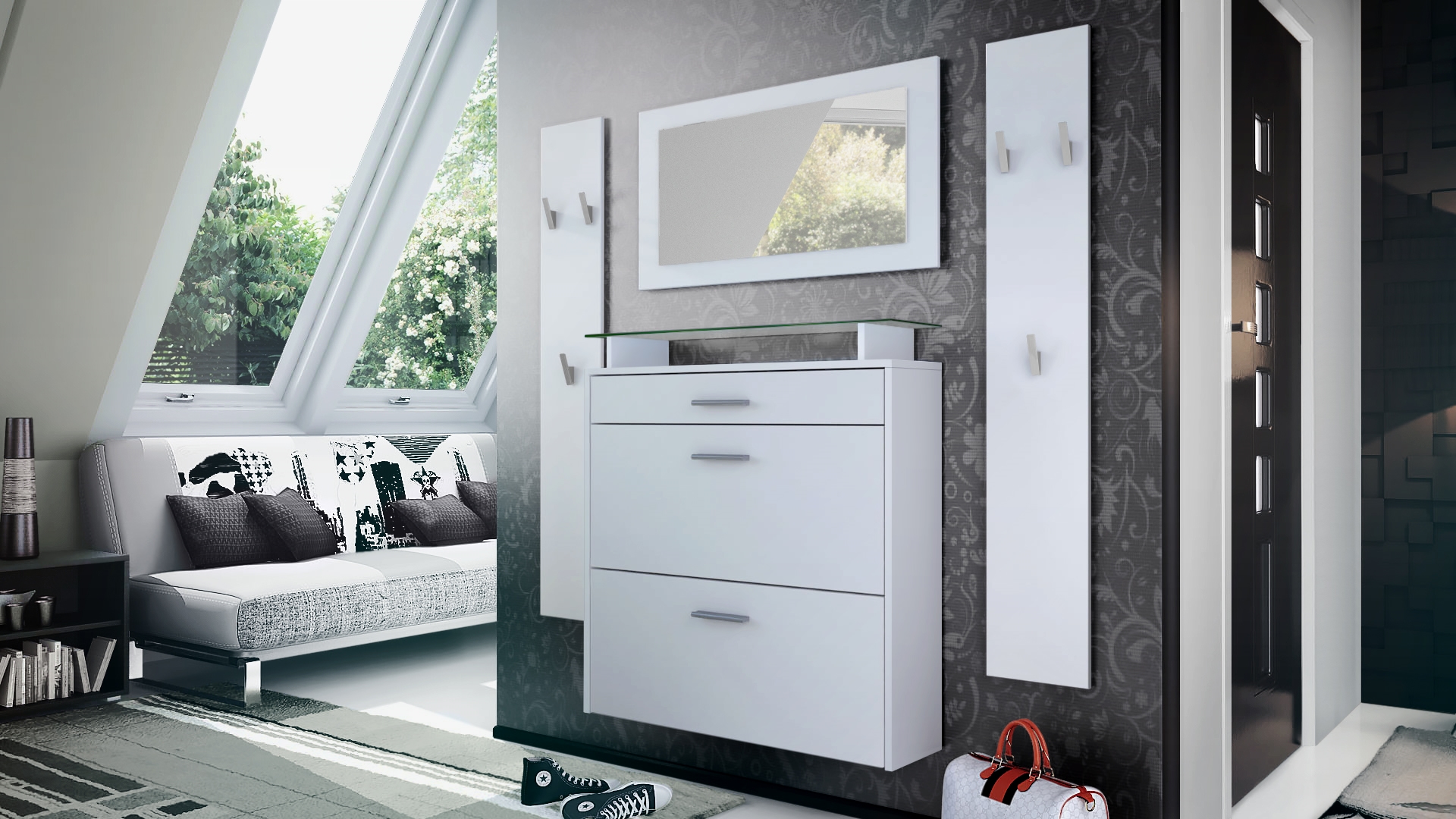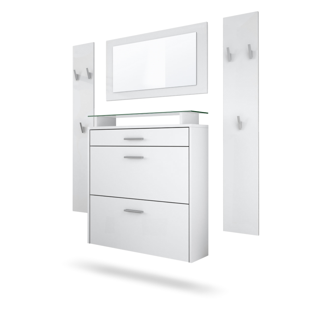 Die moderne Wandgarderobe Malea besteht aus einem Schuhschrank, zwei Garderobenpaneelen mit insgesamt sechs Garderobenhaken und einem zusätzlichen dekorativen Wandspiegel, hergestellt in Deutschland. Alle vier Flurmöbel lassen sich individuell zusammenstellen und bieten grenzenlose Gestaltungsmöglichkeiten für Ihren Flur oder die Diele. Der Schuhschrank bietet mit zwei Schuhkippern, einer Schublade und einer Glasablage genug Platz für bis zu 16 Paar Schuhe. Die beiden Wandpaneele bieten für bis zu sechs Jacken und Mäntel ausreichend Platz. Das Garderobenset kann nur hängend platziert werden, Material für die Wandaufhängung ist im Lieferumfang enthalten. Der Schuhschrank enthält keine Rückwand.