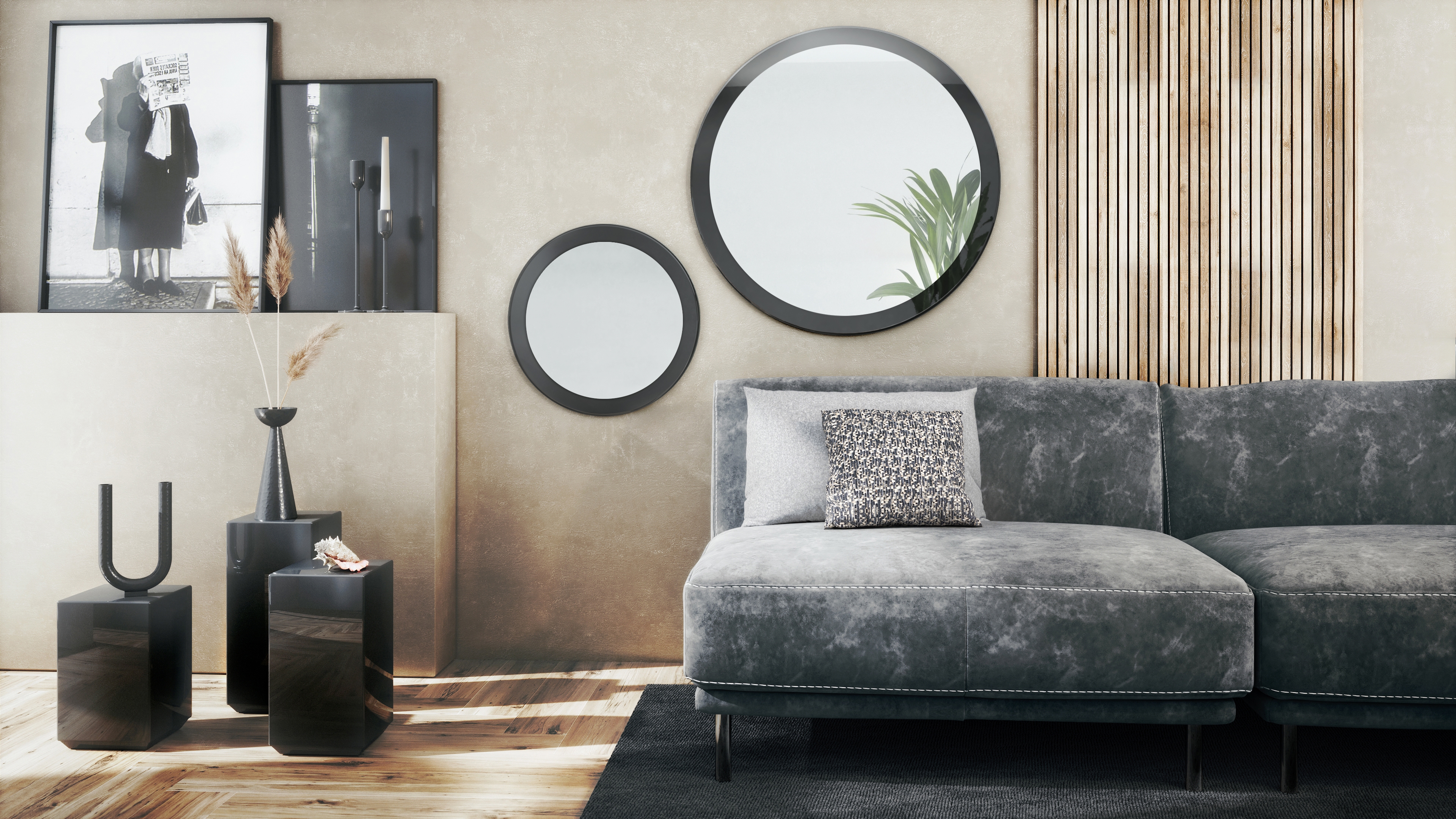 Produktinformationen "Globe Spiegel 2er-Set (Typ 50+80) für Flur und Wohnzimmer mit MDF-Rahmen in Schwarz Hochglanz (50 und 80 cm Durchmesser)"