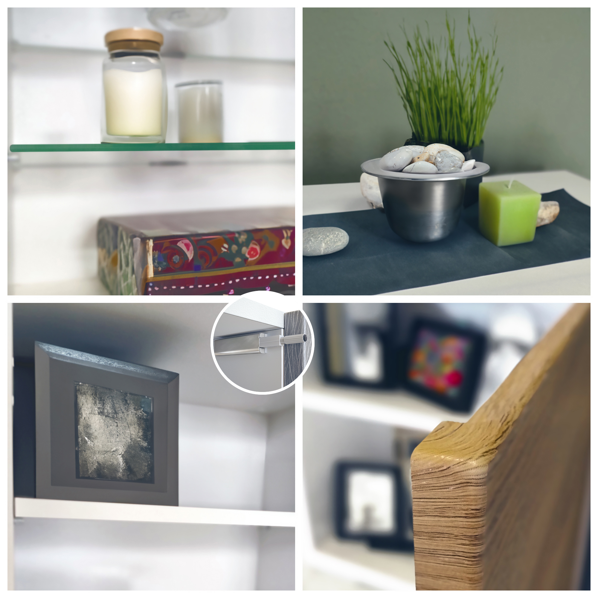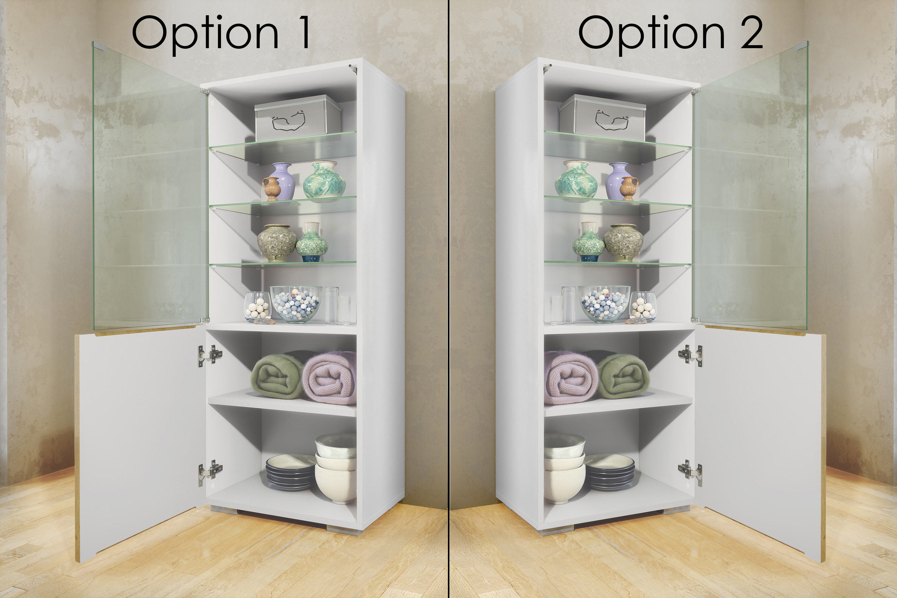 Hinter der Glastür finden Ihre Schätze in vier geräumigen Fächern und auf drei Glaseinlegeböden den perfekten Platz. Und hinter der unteren Tür stehen zwei zusätzliche Fächer für persönliche Gegenstände zur Verfügung.