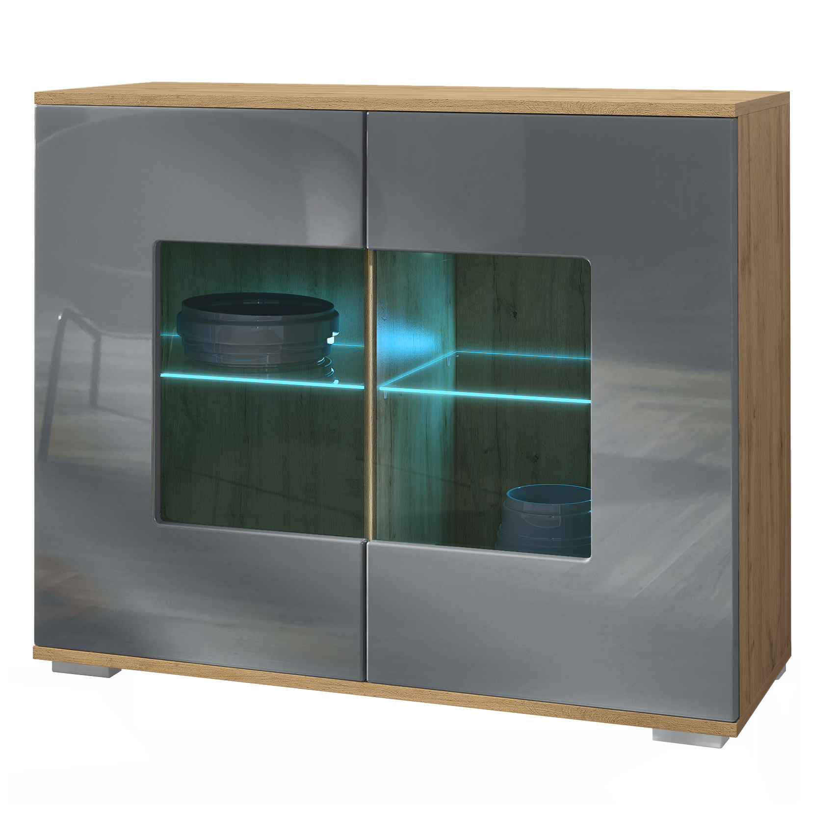 Produktinformationen "Grömitz V3 Kommode Eiche Evoke + LED mit 2 großen Glastüren inkl. RGB Beleuchtung Eiche Evoke / Grau Hochglanz (92,5 x 75.5 x 35)"