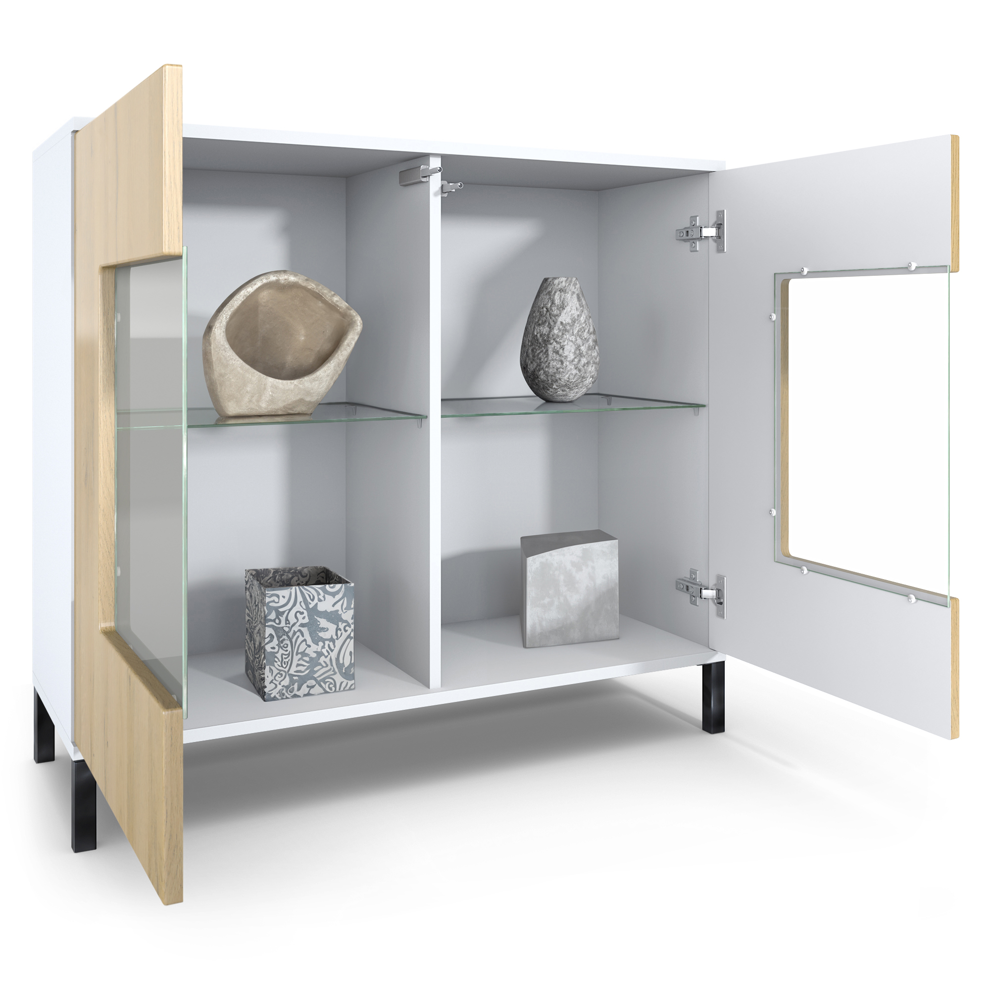 Ob als modernes Sideboard im Wohnzimmer, Kommodenschrank für‘s Schlafzimmer, Anrichte im Flur oder als Küchenschrank in der Küche - die geräumige Kommode Grömitz V3 präsentiert sich als praktisches Möbelstück mit modernem Design, hergestellt in Deutschland. Der Beistellschrank ist mit zwei großen Türen ausgerüstet. Hinter den Türen befinden sich jeweils zwei geräumige Fächer mit Glaseinlegeboden. Die Türen sind mit unserem Push-to-Open-System ausgestattet. Eine Rückwand in Holzoptik aus Hartfaserplatten ist im Lieferumfang enthalten.