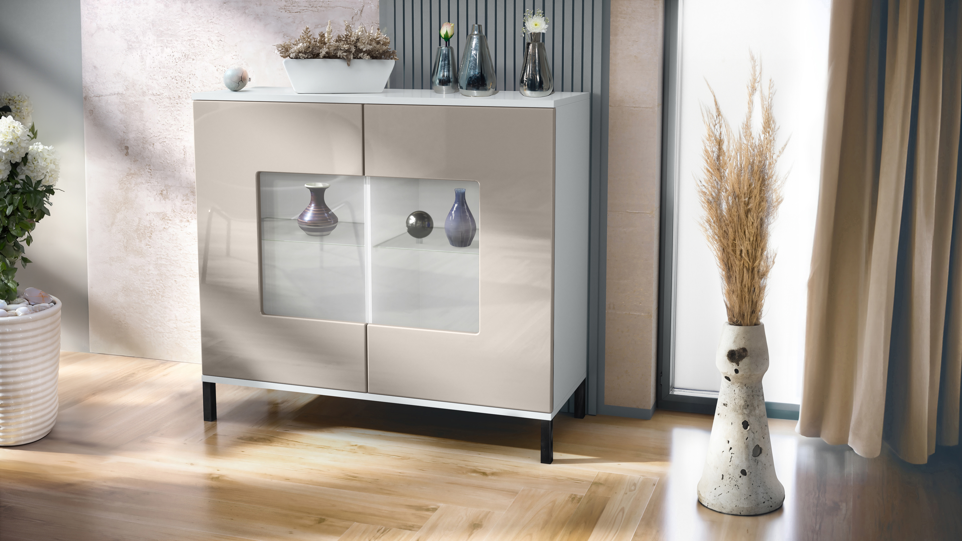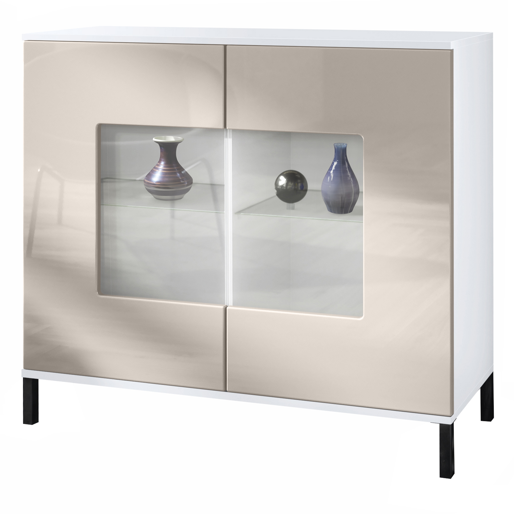 Produktinformationen "Grömitz V3 Kommode Weiß mit 2 großen Glastüren Weiß matt / Sandgrau Hochglanz (92,5 x 83.5 x 35)"