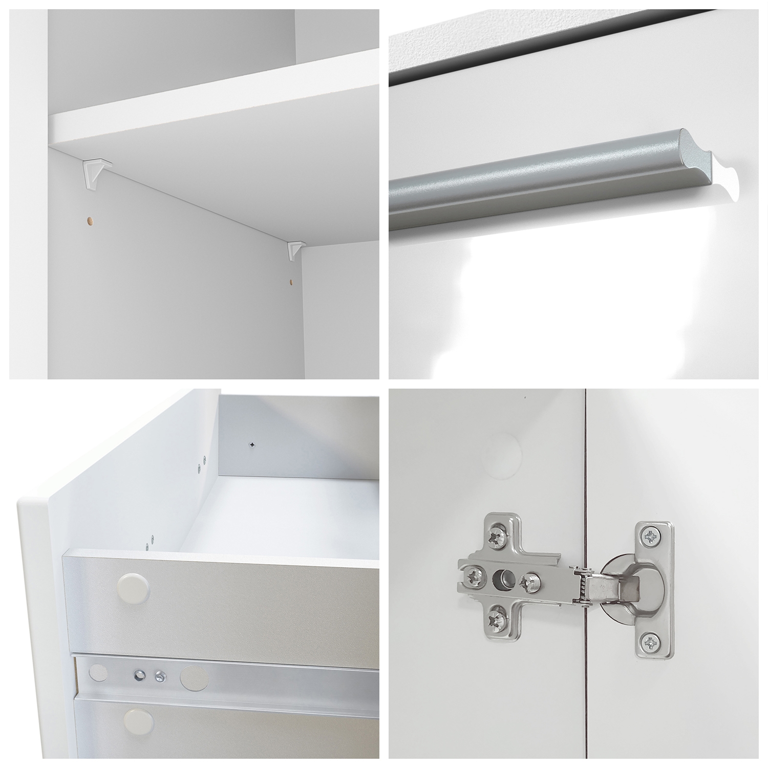 Das Highboard hat einen matt weißen Korpus, während die Fronten in unterschiedlichen Farben erhältlich sind, entweder in Hochglanz, matt oder mit naturrealistischer Maserung. Die Fronten in Hochglanz und in naturrealistischer Maserung haben abgerundeten Kanten, um eventuellen Verletzungen vorzubeugen.
