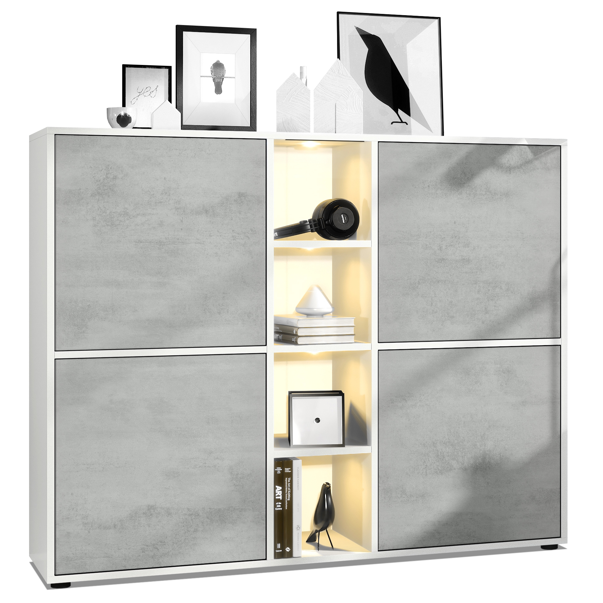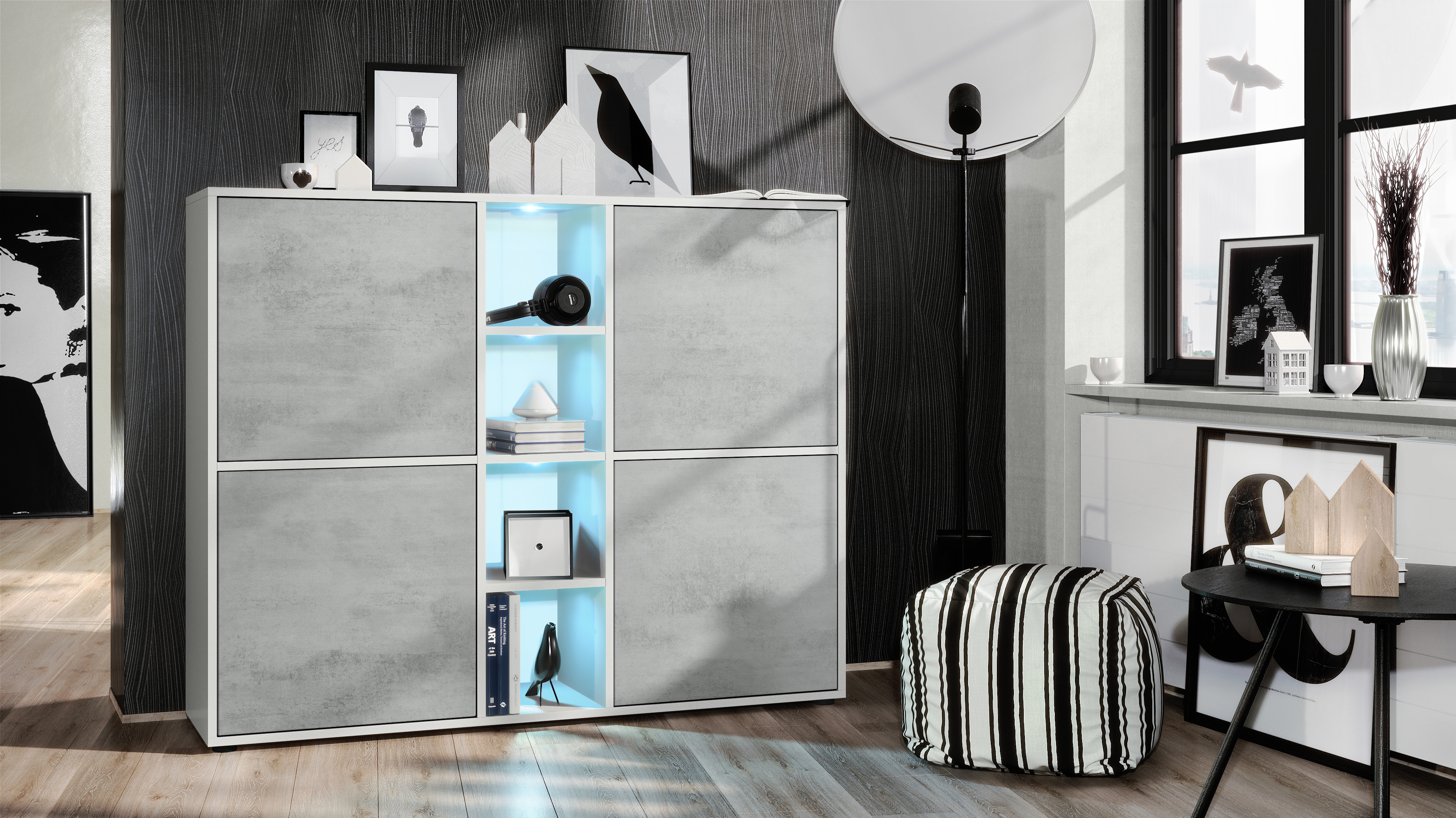 Produktinformationen "Highboard Cuba V3 mit 12 Fächern, inkl. RGB LED Beleuchtung Korpus in Weiß matt / in Beton Oxid Optik (130,5x105,5x35,5 cm)"