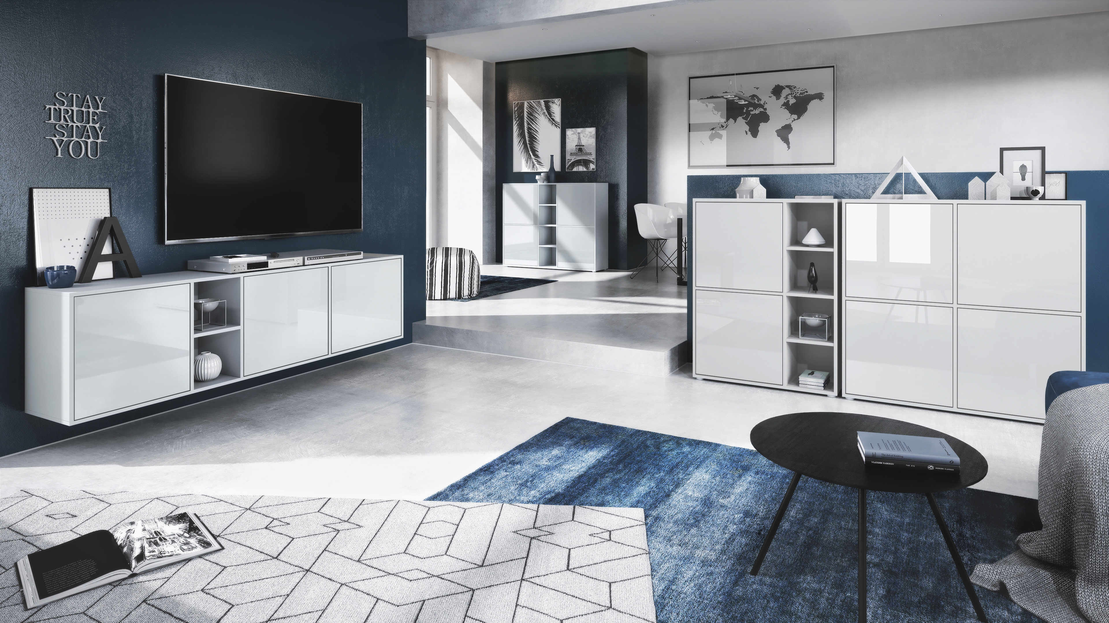 Der Korpus des Highboards hat die Farbe Weiß matt, die Fronten sind in zahlreichen verschiedenen Trendfarben erhältlich.