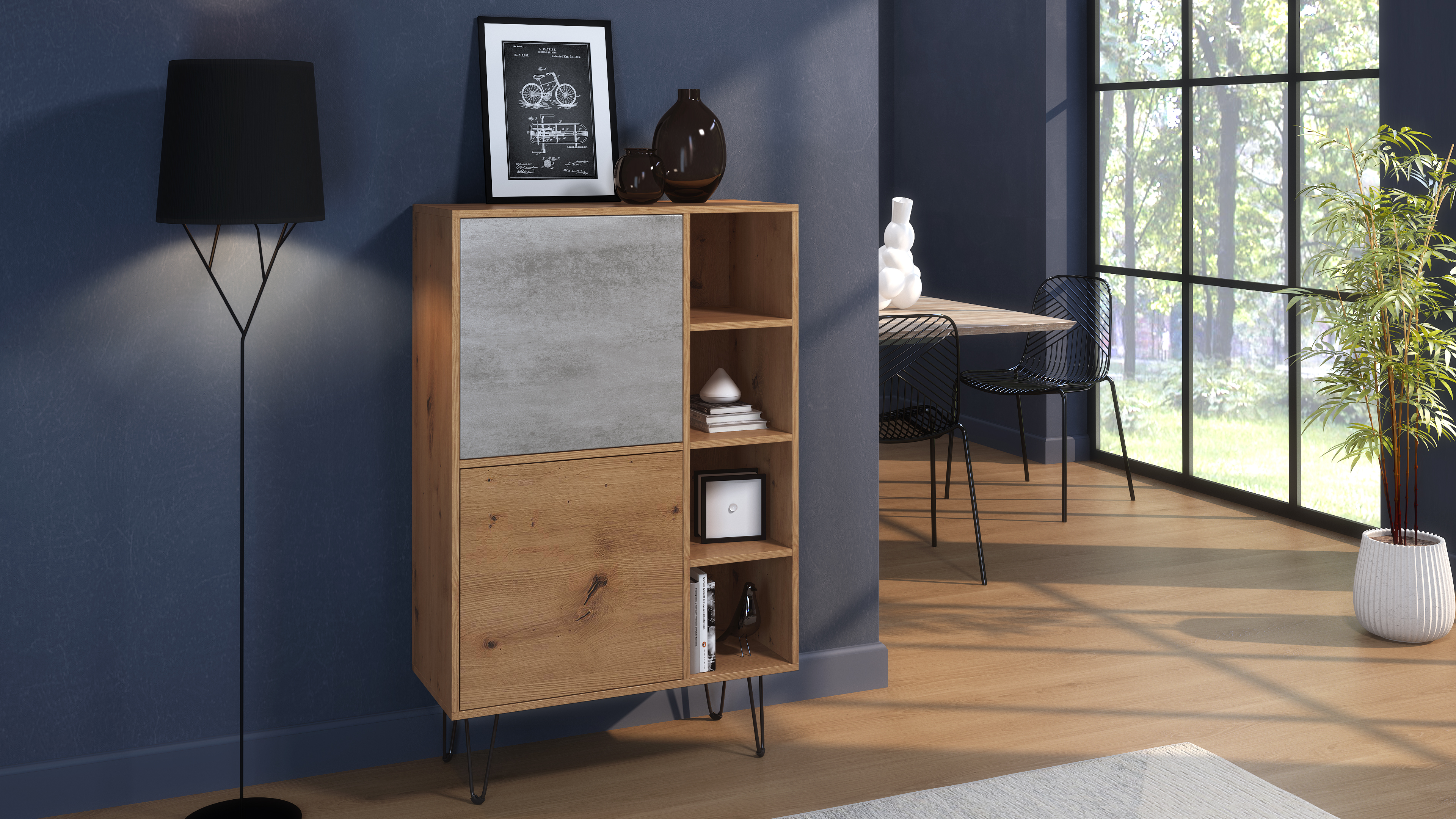 Das Havana Highboard V1 vereint minimalistisches Design mit cleverem Stauraum. Der Korpus in Eiche Evoke sorgt für eine zeitlose Optik und elegante Ausstrahlung. Schwarze Füße setzen stilvolle Akzente und geben Stabilität. Die Fronten sind wählbar in verschiedenen Varianten – ideal für Wohnzimmer, Esszimmer, Schlafzimmer oder Flur.