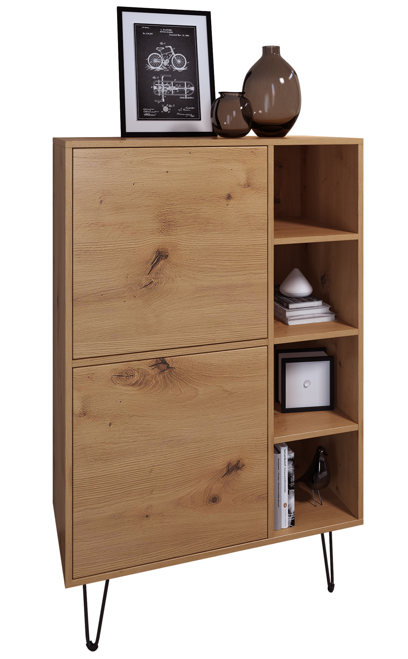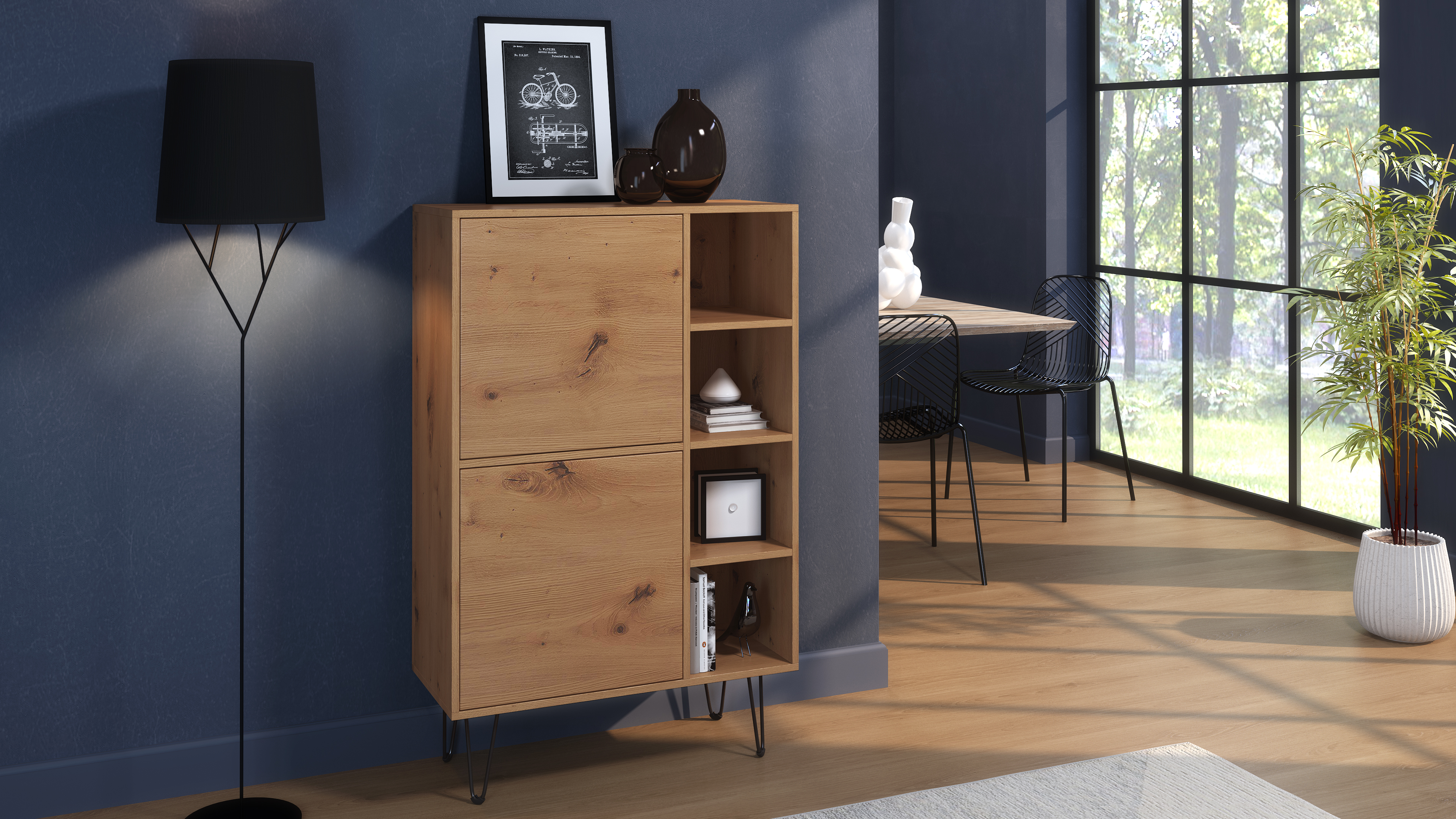 Das Havana Highboard V1 vereint minimalistisches Design mit cleverem Stauraum. Der Korpus in Eiche Evoke sorgt für eine zeitlose Optik und elegante Ausstrahlung. Schwarze Füße setzen stilvolle Akzente und geben Stabilität. Die Fronten sind wählbar in verschiedenen Varianten – ideal für Wohnzimmer, Esszimmer, Schlafzimmer oder Flur.