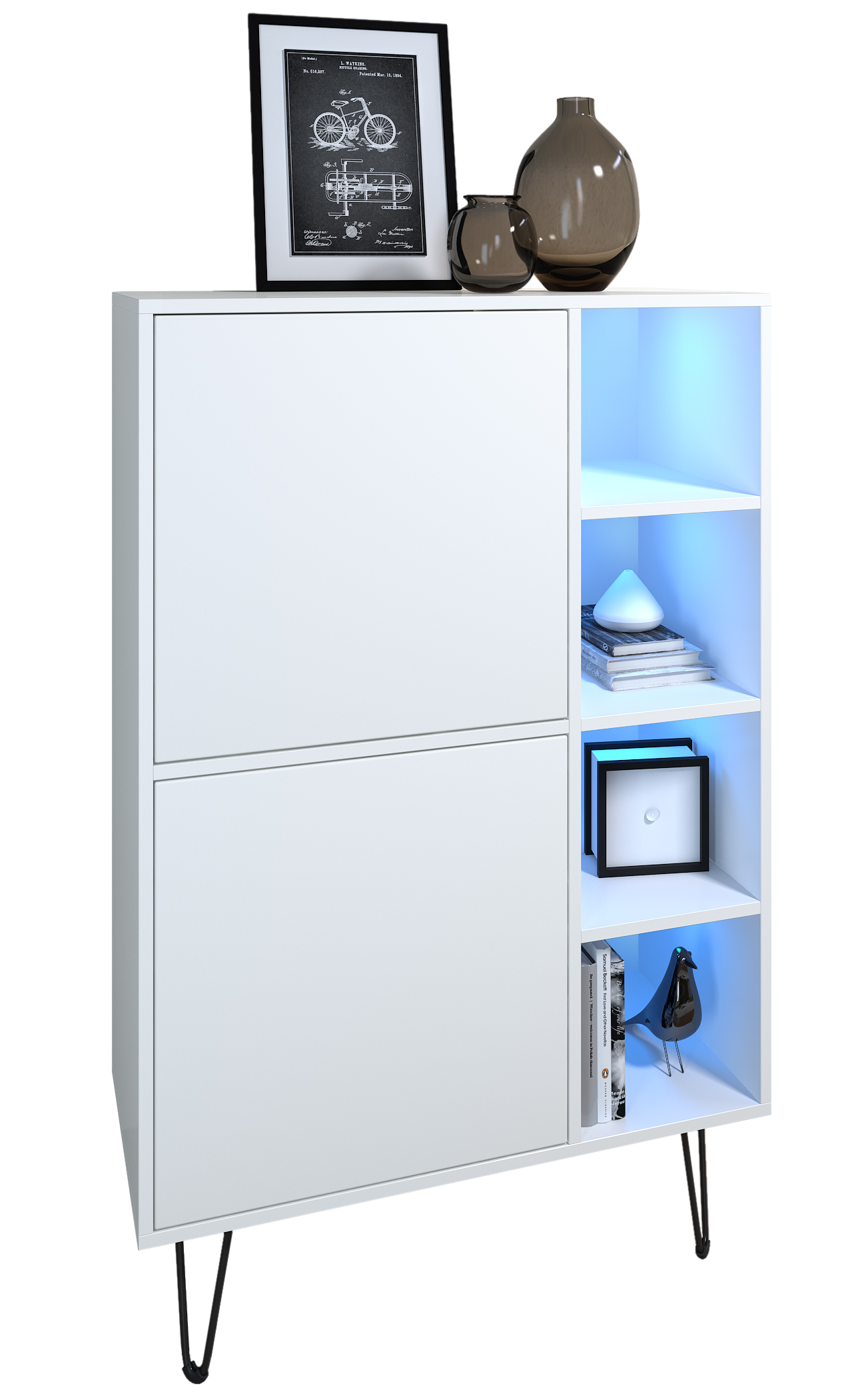 Die Türen mit Push-to-Open-Funktion verbergen großzügige Innenfächer – perfekt als Kommode, Schrank oder Aufbewahrungsschrank für Geschirr, Bücher oder Deko. Die 4 offenen Fächer bieten zusätzlichen Stauraum für Dekoration, Technik oder Pflanzen und werden durch die inklusive LED-Beleuchtung stilvoll in Szene gesetzt. Dank der grifflosen Front wirkt das Möbelstück besonders modern und harmonisch.