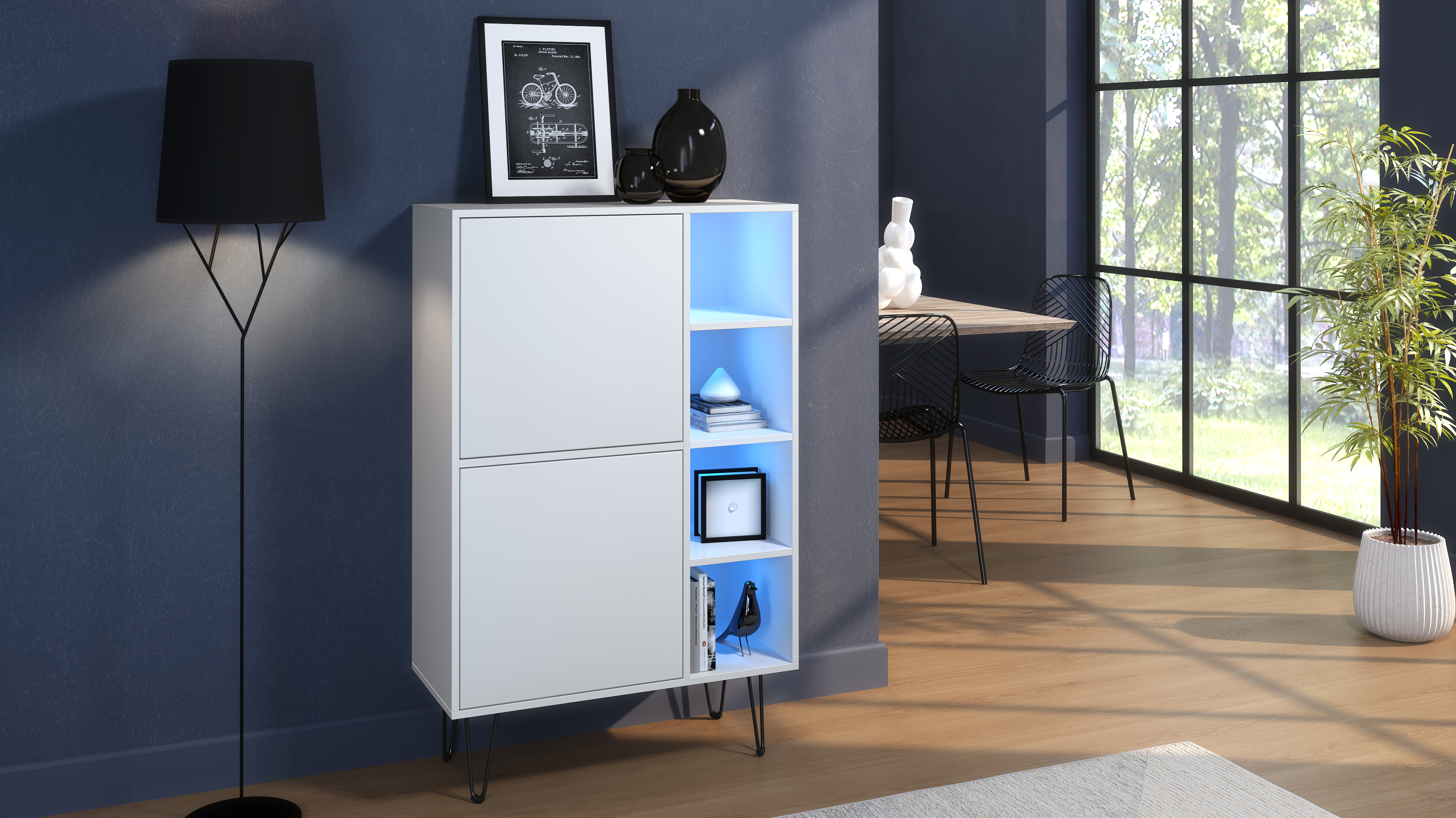 Lieferumfang: 1x Highboard mit LED-Beleuchtung, Montagematerial & bebilderte Aufbauanleitung