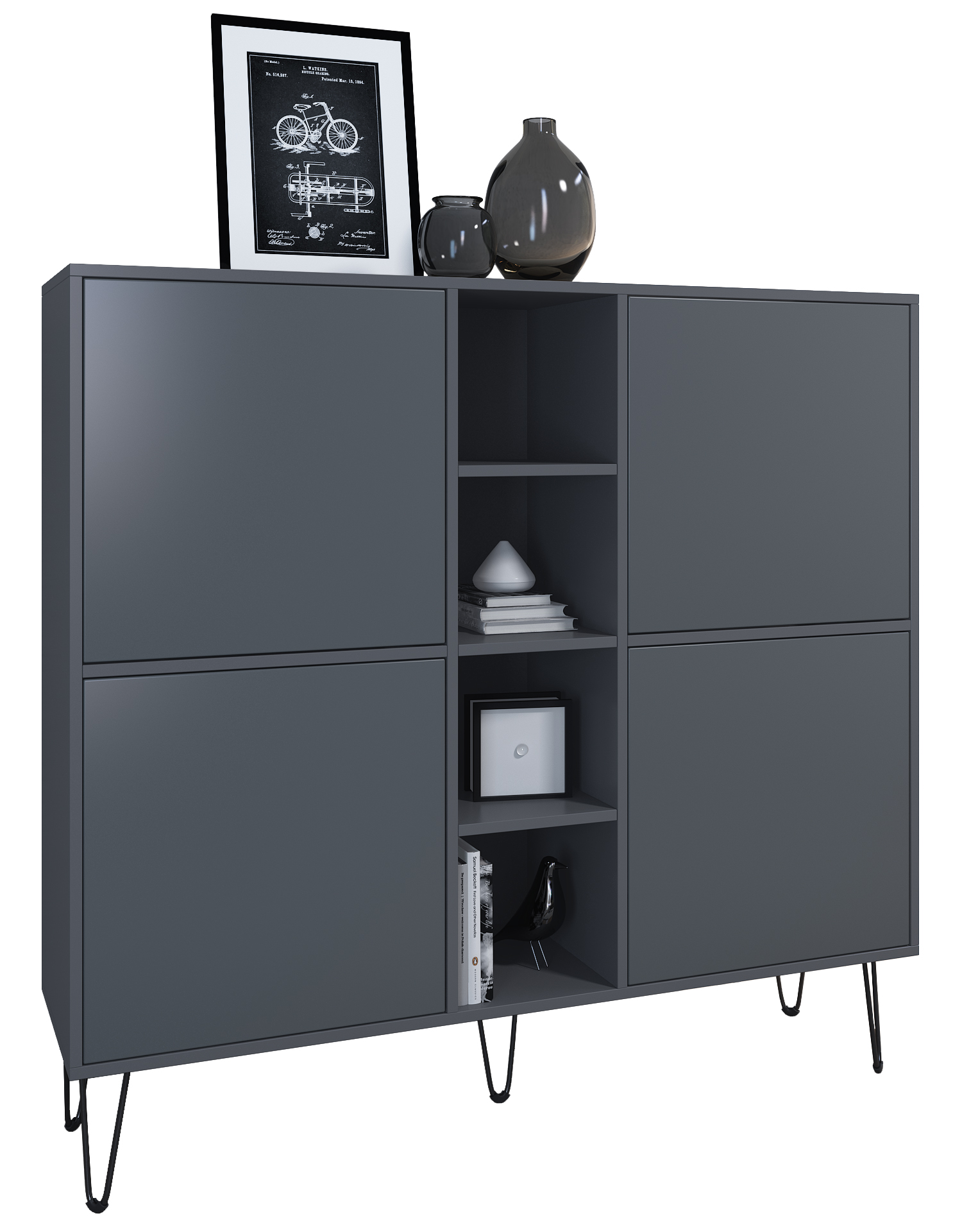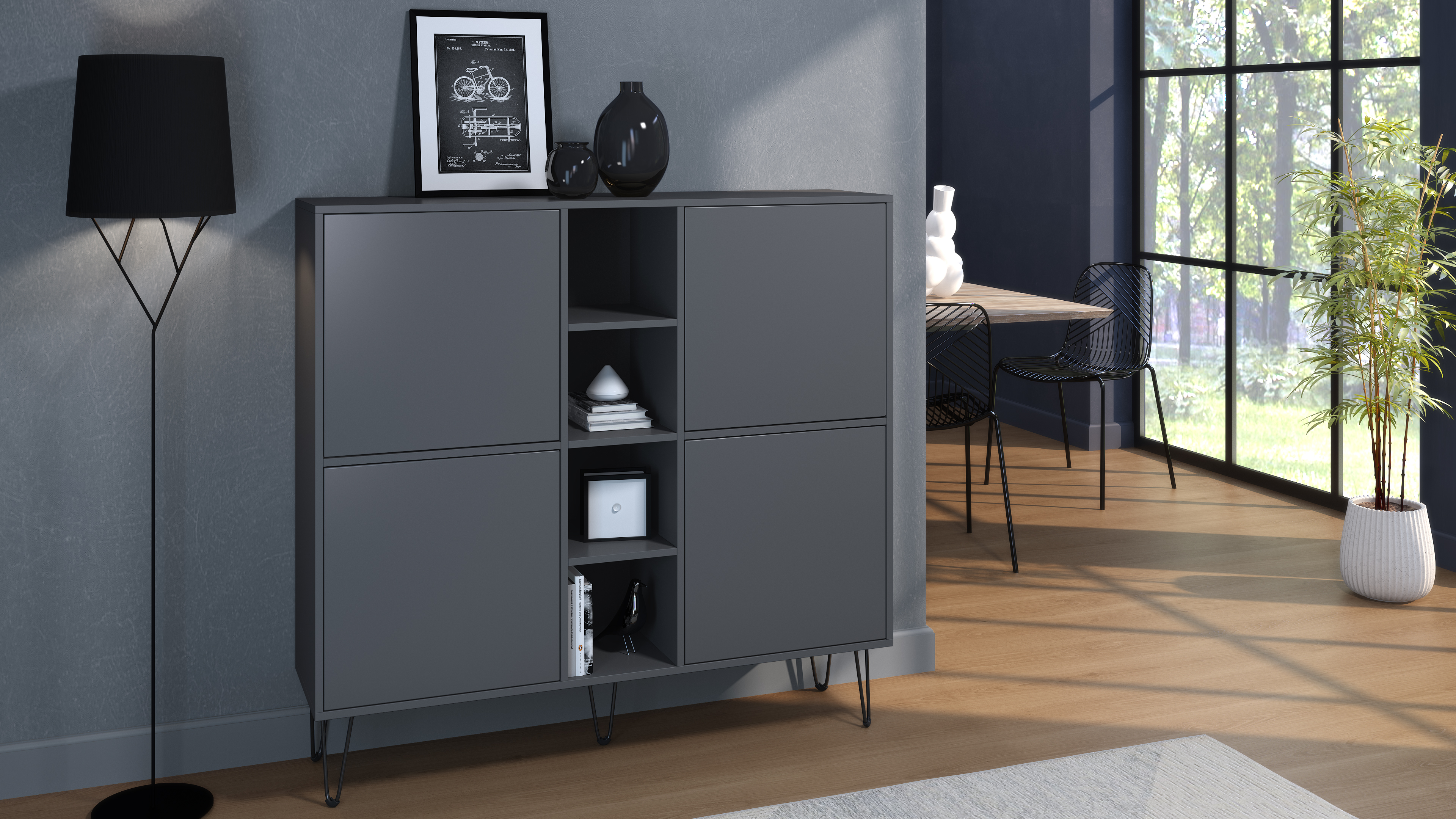 Das Havana Highboard V3 vereint minimalistisches Design mit cleverem Stauraum. Der Korpus in Anthrazit matt sorgt für eine zeitlose Optik und elegante Ausstrahlung. Schwarze Füße setzen stilvolle Akzente und geben Stabilität. Die Fronten sind wählbar in verschiedenen Varianten – ideal für Wohnzimmer, Esszimmer, Schlafzimmer oder Flur.