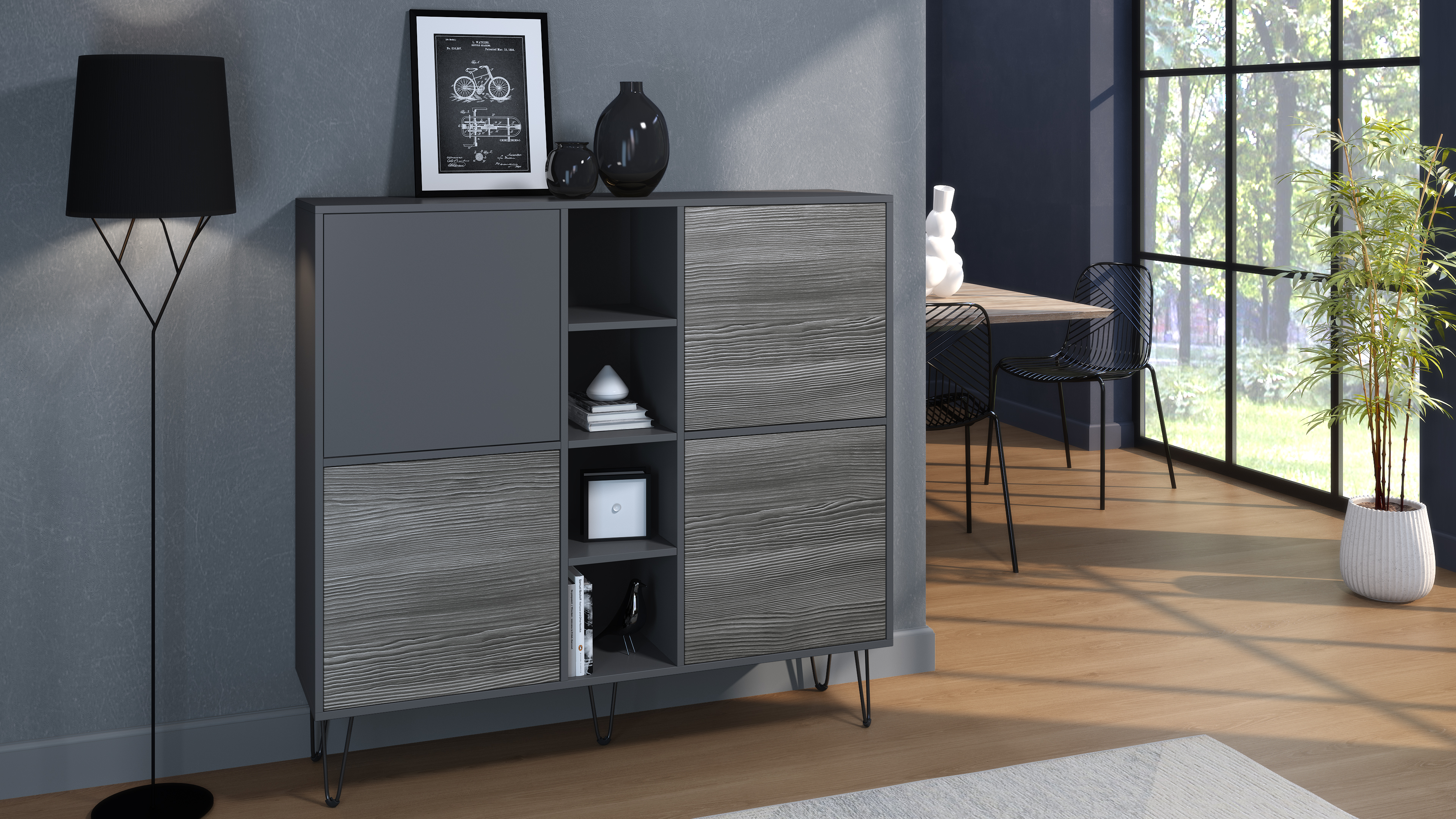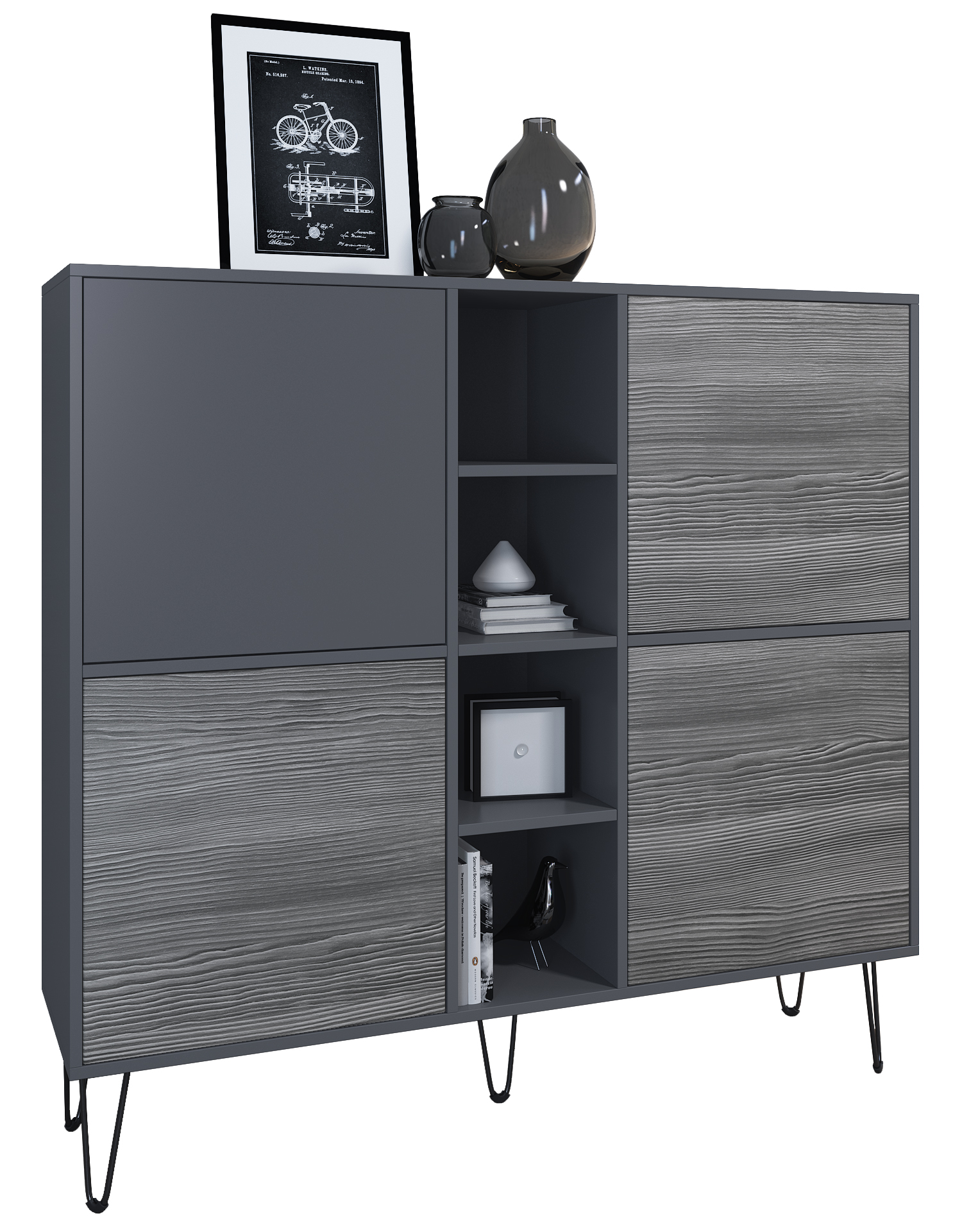 Das Havana Highboard V3 vereint minimalistisches Design mit cleverem Stauraum. Der Korpus in Anthrazit matt sorgt für eine zeitlose Optik und elegante Ausstrahlung. Schwarze Füße setzen stilvolle Akzente und geben Stabilität. Die Fronten sind wählbar in verschiedenen Varianten – ideal für Wohnzimmer, Esszimmer, Schlafzimmer oder Flur.