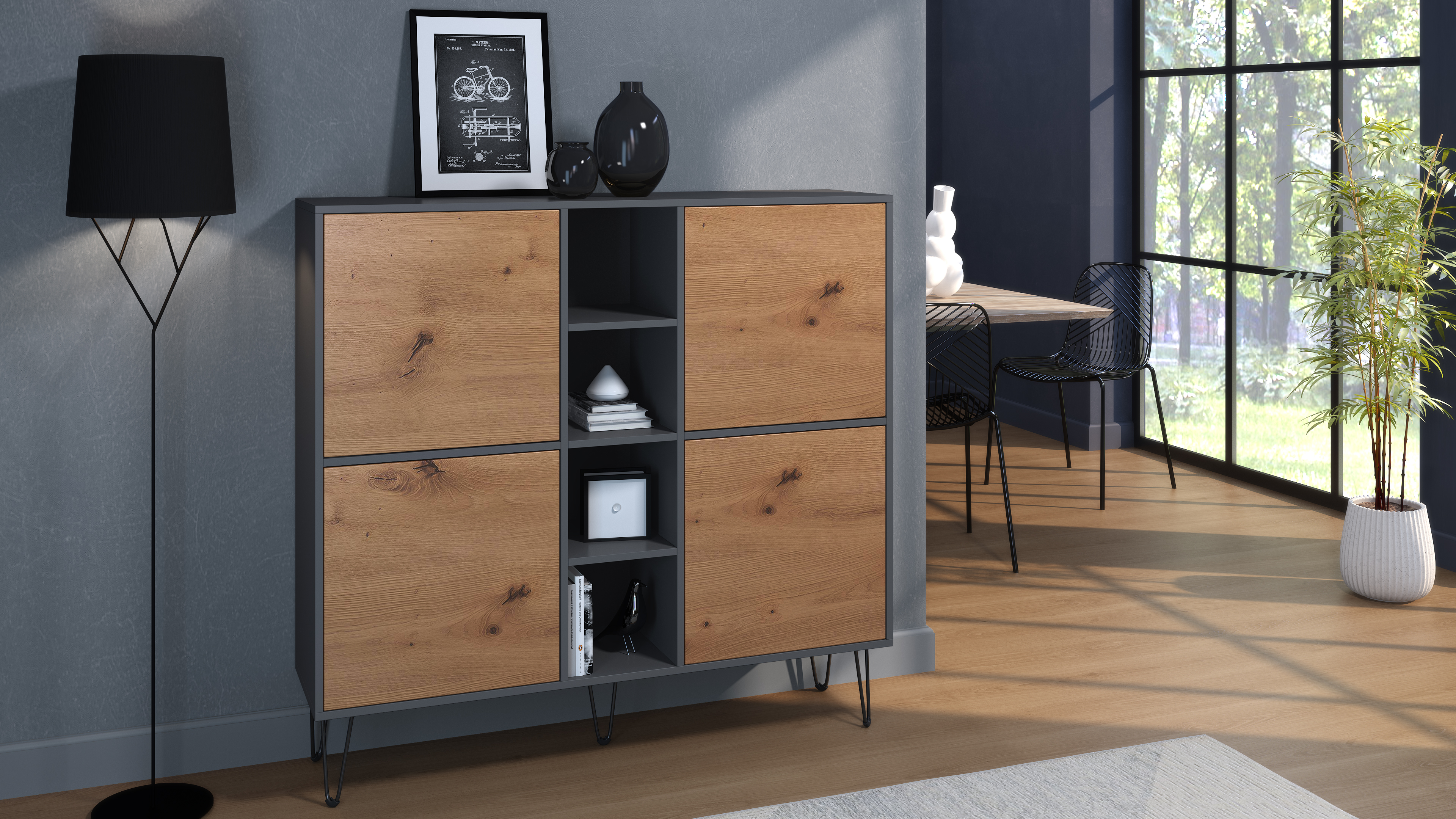 Die vier Türen mit Push-to-Open-Funktion verbergen großzügige Innenfächer – perfekt als Kommode, Schrank oder Aufbewahrungsschrank für Geschirr, Bücher oder Deko. Die vier offenen Fächer bieten zusätzlichen Stauraum für Dekoration, Technik oder Pflanzen. Dank der grifflosen Front wirkt das Möbelstück besonders modern und harmonisch.