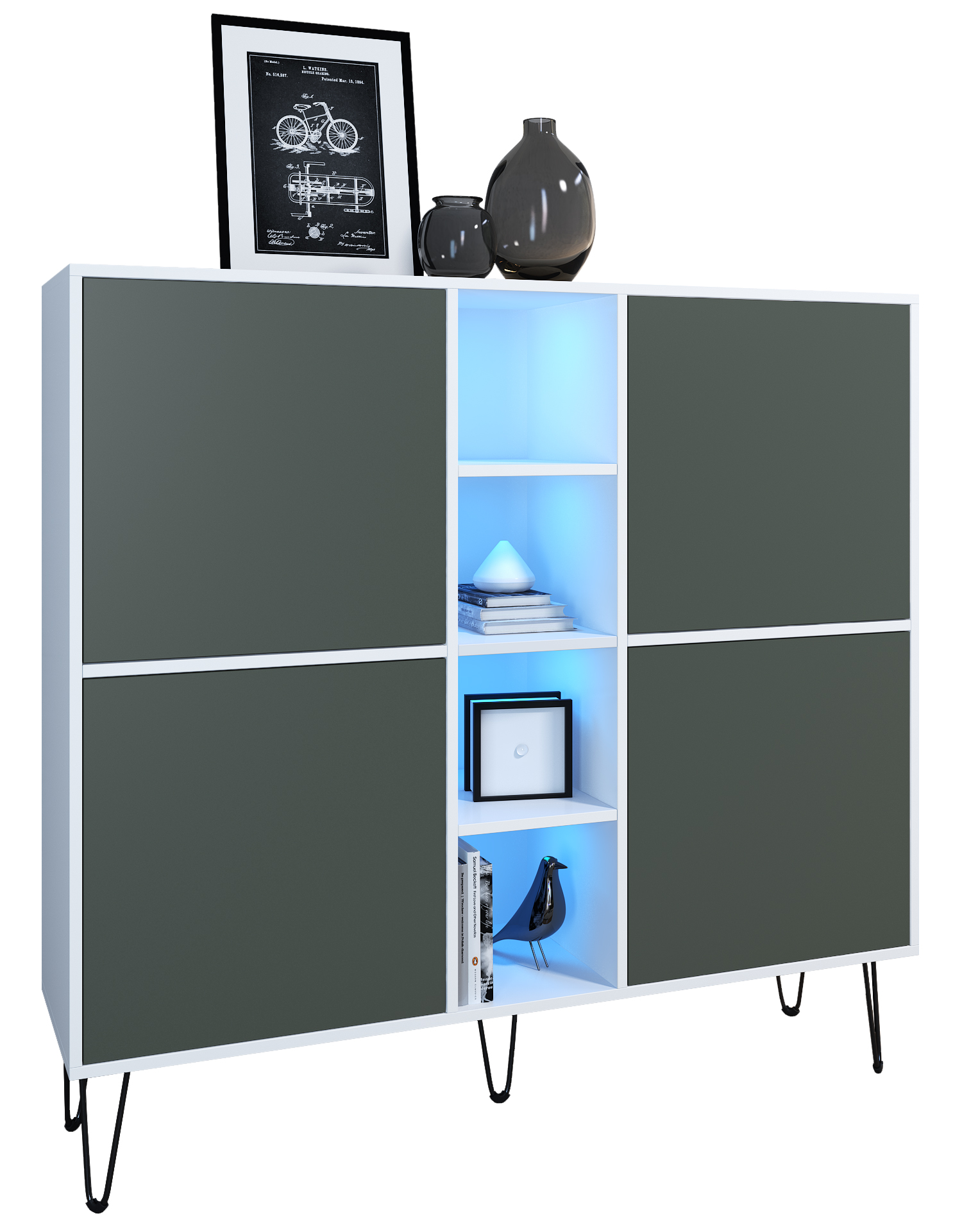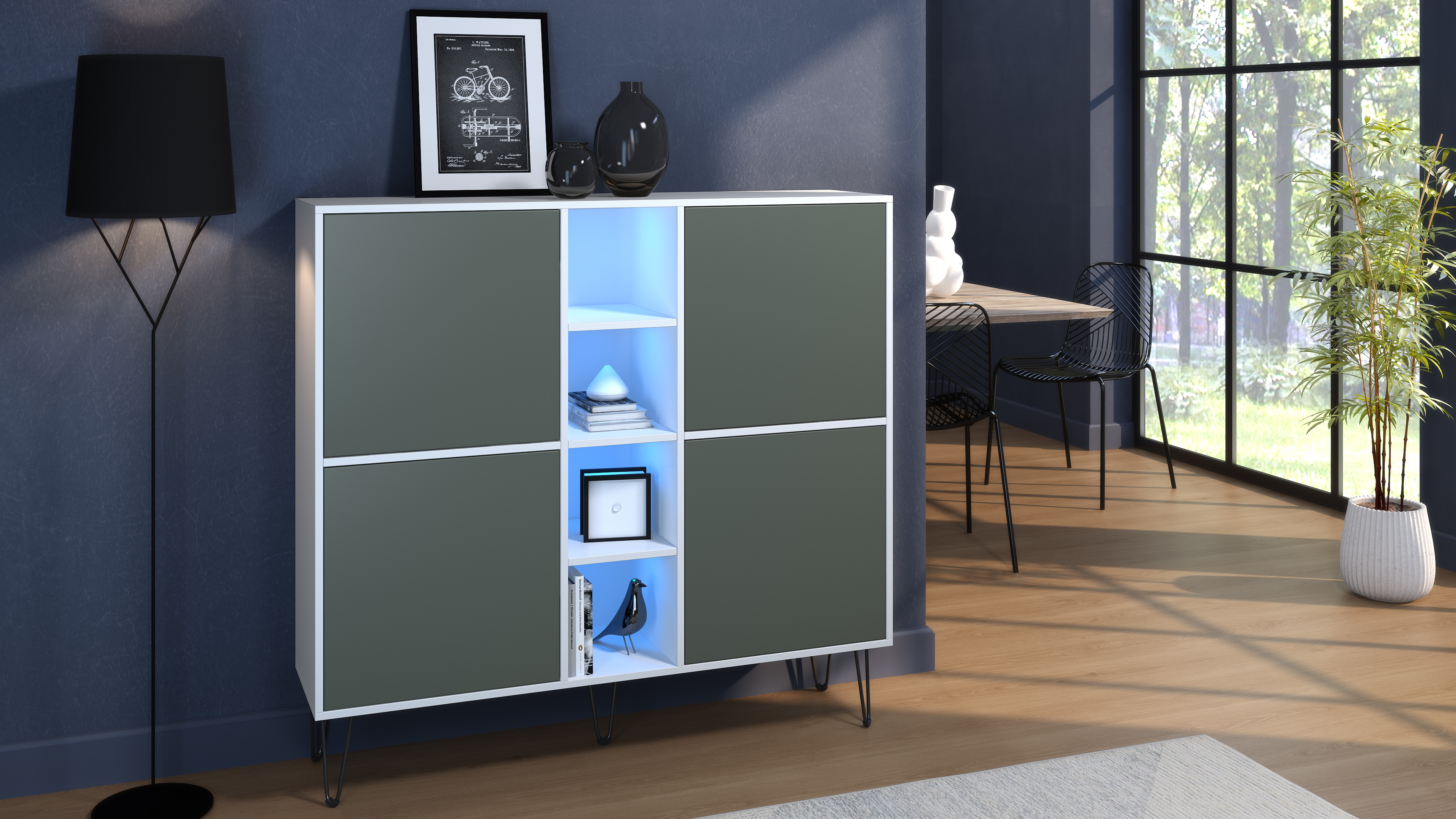 Die vier Türen mit Push-to-Open-Funktion verbergen großzügige Innenfächer – perfekt als Kommode, Schrank oder Aufbewahrungsschrank für Geschirr, Bücher oder Deko. Die vier offenen Fächer bieten zusätzlichen Stauraum für Dekoration, Technik oder Pflanzen. Dank der grifflosen Front wirkt das Möbelstück besonders modern und harmonisch. Für ein stimmungsvolles Ambiente sorgt die inklusive LED-Beleuchtung.