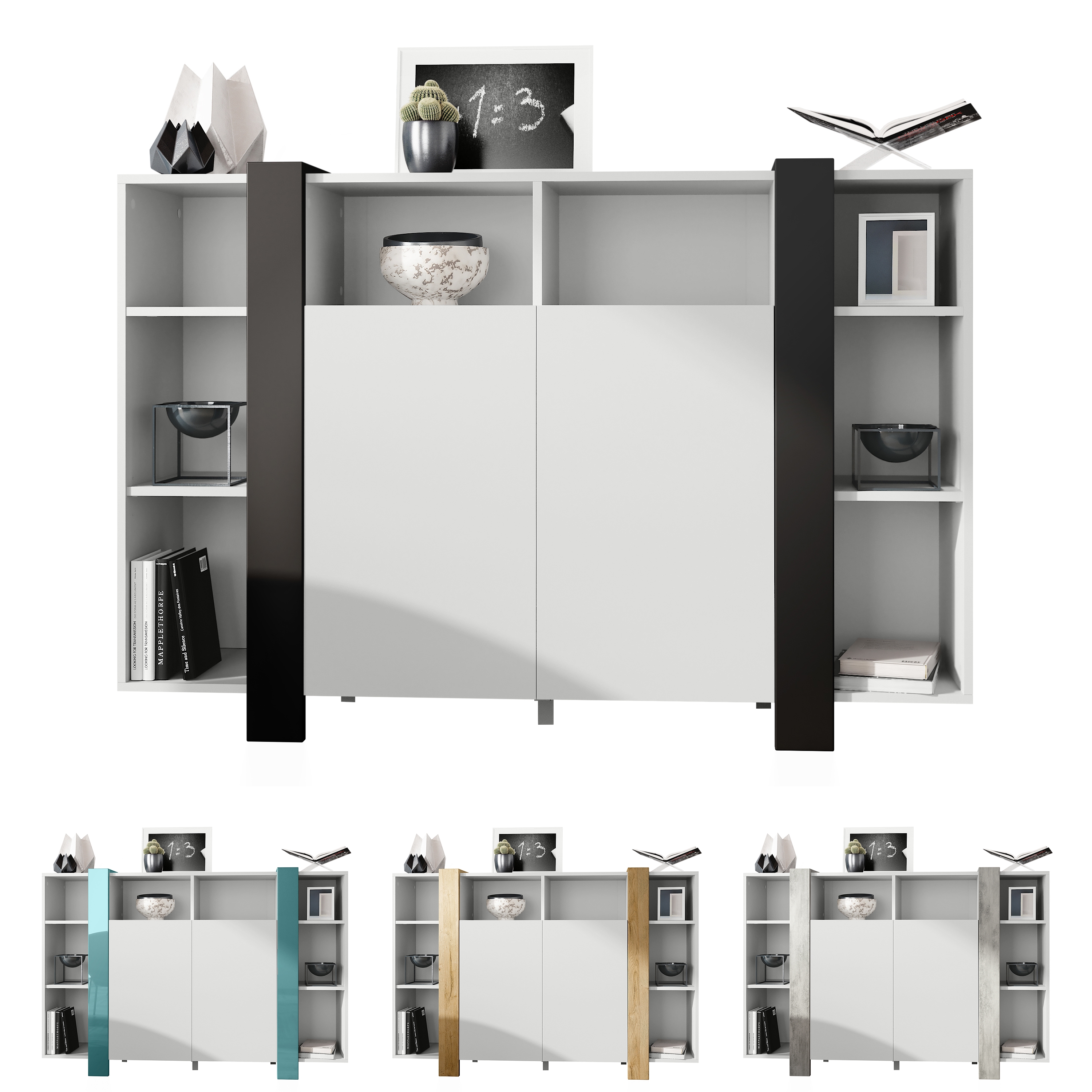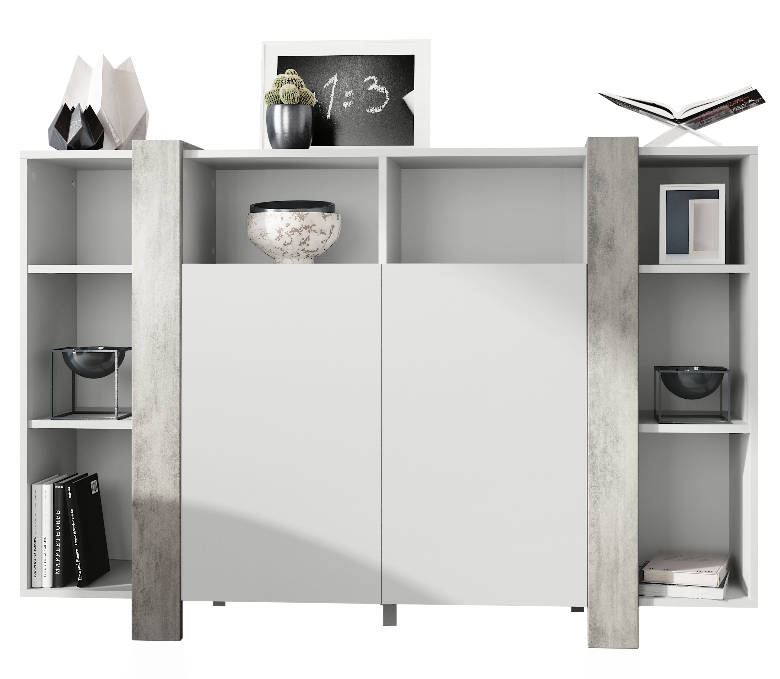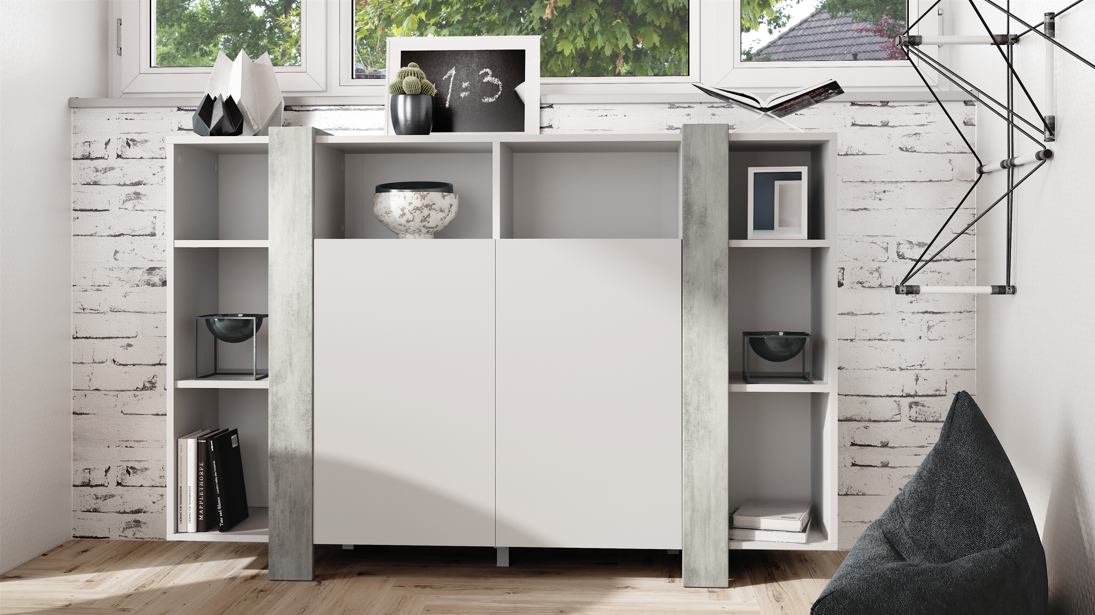 Produktinformationen "Highboard Ida V1 Weiß mit 2 Türen und 8 offene Fächer Weiß matt/Beton Oxid Optik (149 x 101 x 34 cm)"