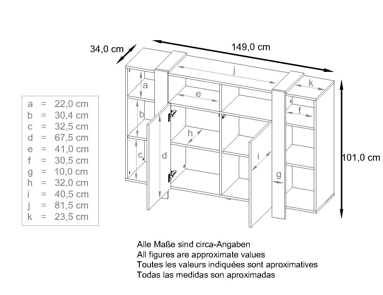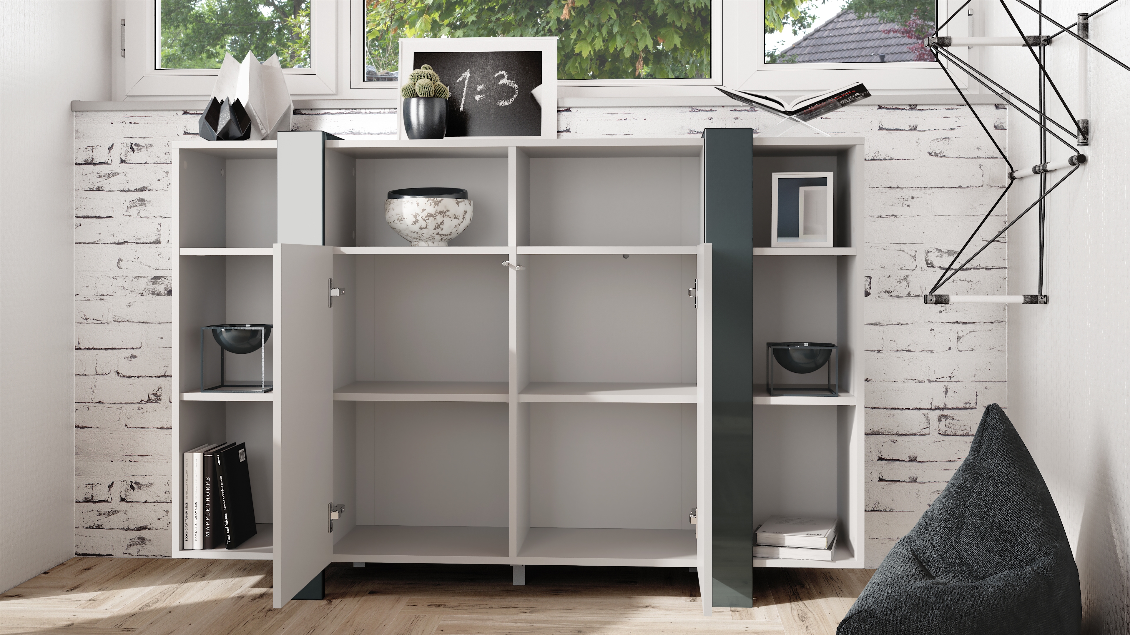Das hohe Sideboard hat ein kastenförmiges Design mit diversen Ablageflächen für allerlei Gegenstände. Es hat insgesamt 12 Fächer: 4 davon liegen hinter zwei Türen, welche sich mit dem innovativen Push-to-Open-System öffnen lassen, verborgen. Zusätzlich gibt es 8 offene Fächer, in denen all jene Dinge ihren Platz finden, die schnell greifbar sein müssen, oder aber Dekorationen, die sichtbar für alle Augen präsentiert werden sollen. Die 8 offenen Fächer sind dabei so geschickt angeordnet, dass sie die zwei mittigen Türen umrahmen. Dies lässt das Möbelstück harmonisch aufs Auge wirken.