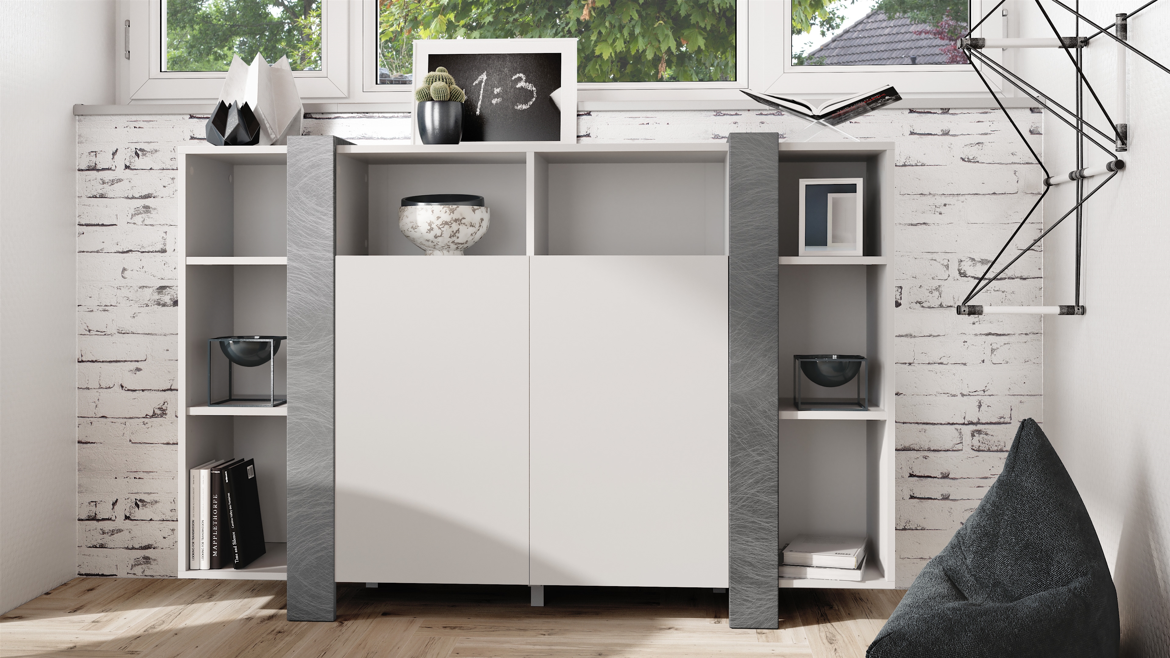 Das hohe Sideboard hat ein kastenförmiges Design mit diversen Ablageflächen für allerlei Gegenstände. Es hat insgesamt 12 Fächer: 4 davon liegen hinter zwei Türen, welche sich mit dem innovativen Push-to-Open-System öffnen lassen, verborgen. Zusätzlich gibt es 8 offene Fächer, in denen all jene Dinge ihren Platz finden, die schnell greifbar sein müssen, oder aber Dekorationen, die sichtbar für alle Augen präsentiert werden sollen. Die 8 offenen Fächer sind dabei so geschickt angeordnet, dass sie die zwei mittigen Türen umrahmen. Dies lässt das Möbelstück harmonisch aufs Auge wirken.