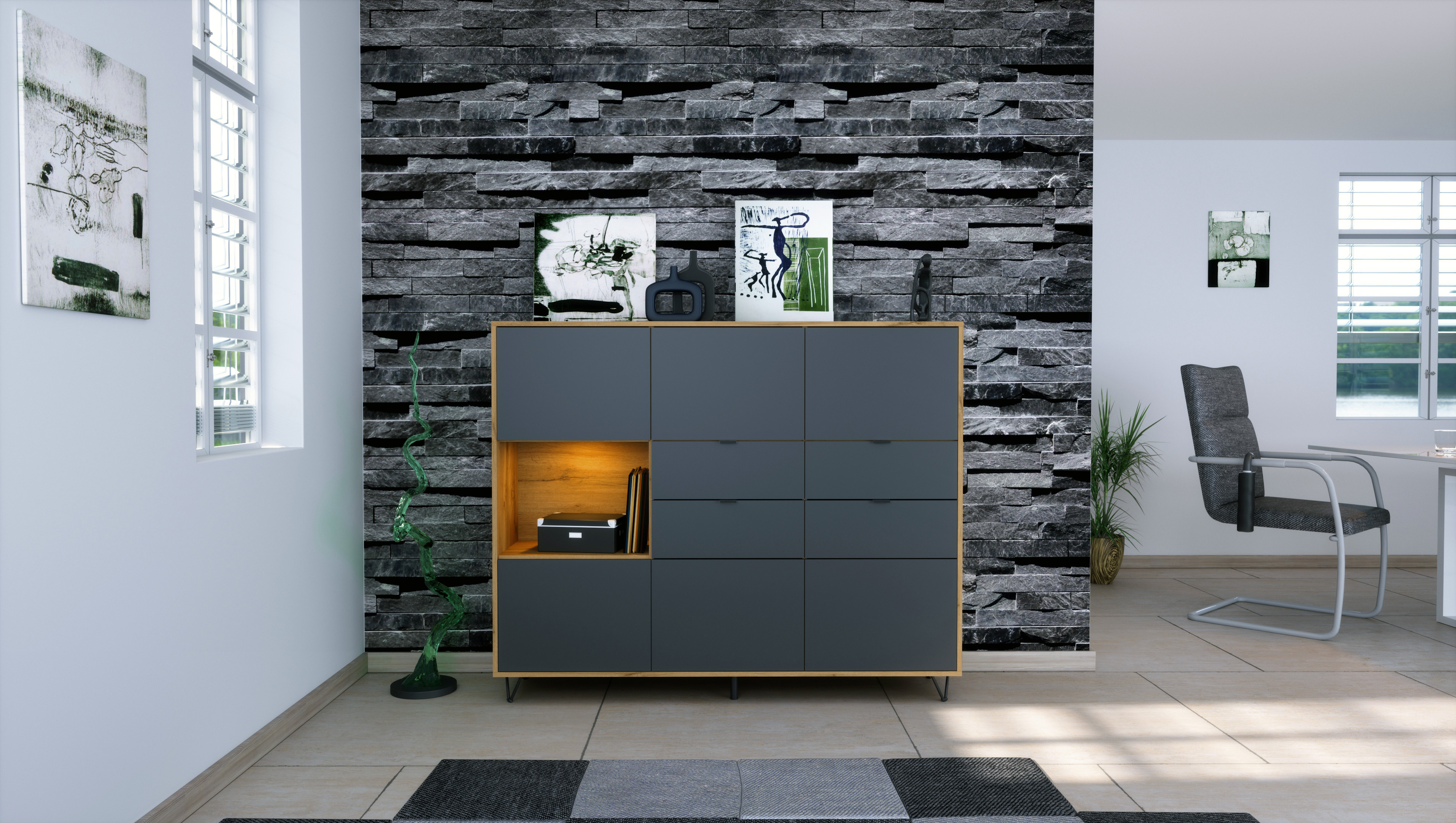 Produktinformationen "Highboard Marino V2 mit LED 4 Schubladen Anthrazit matt, inkl. LED, Made in Germany Korpus Eiche Evoke (152,5 x 125,5 x 37 cm) "