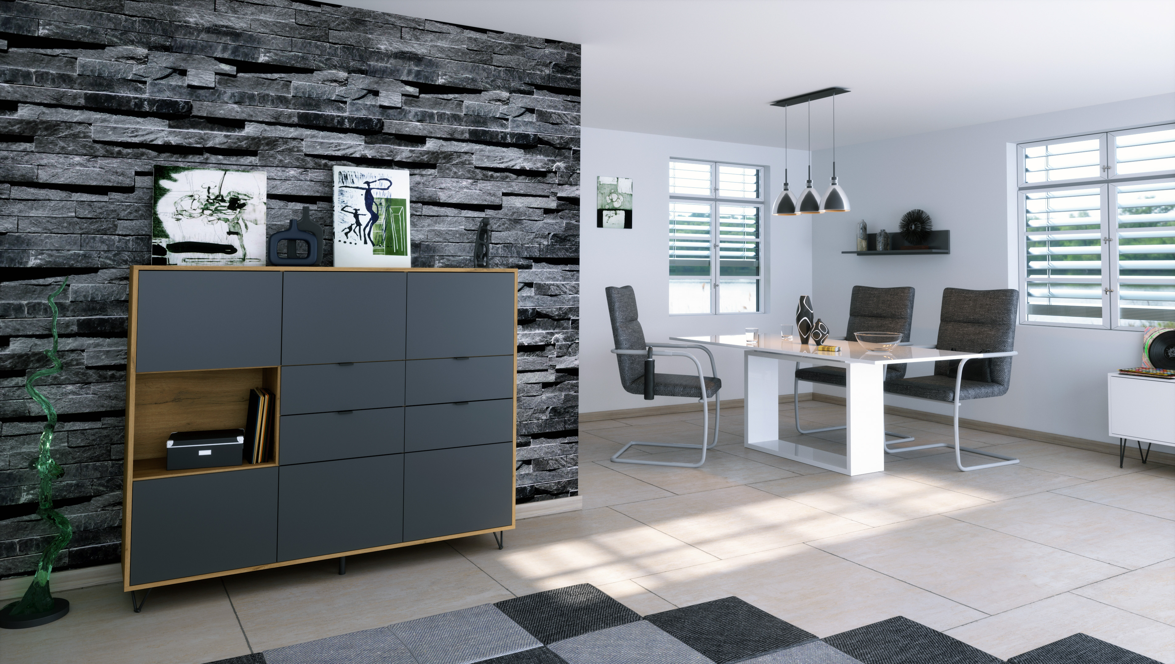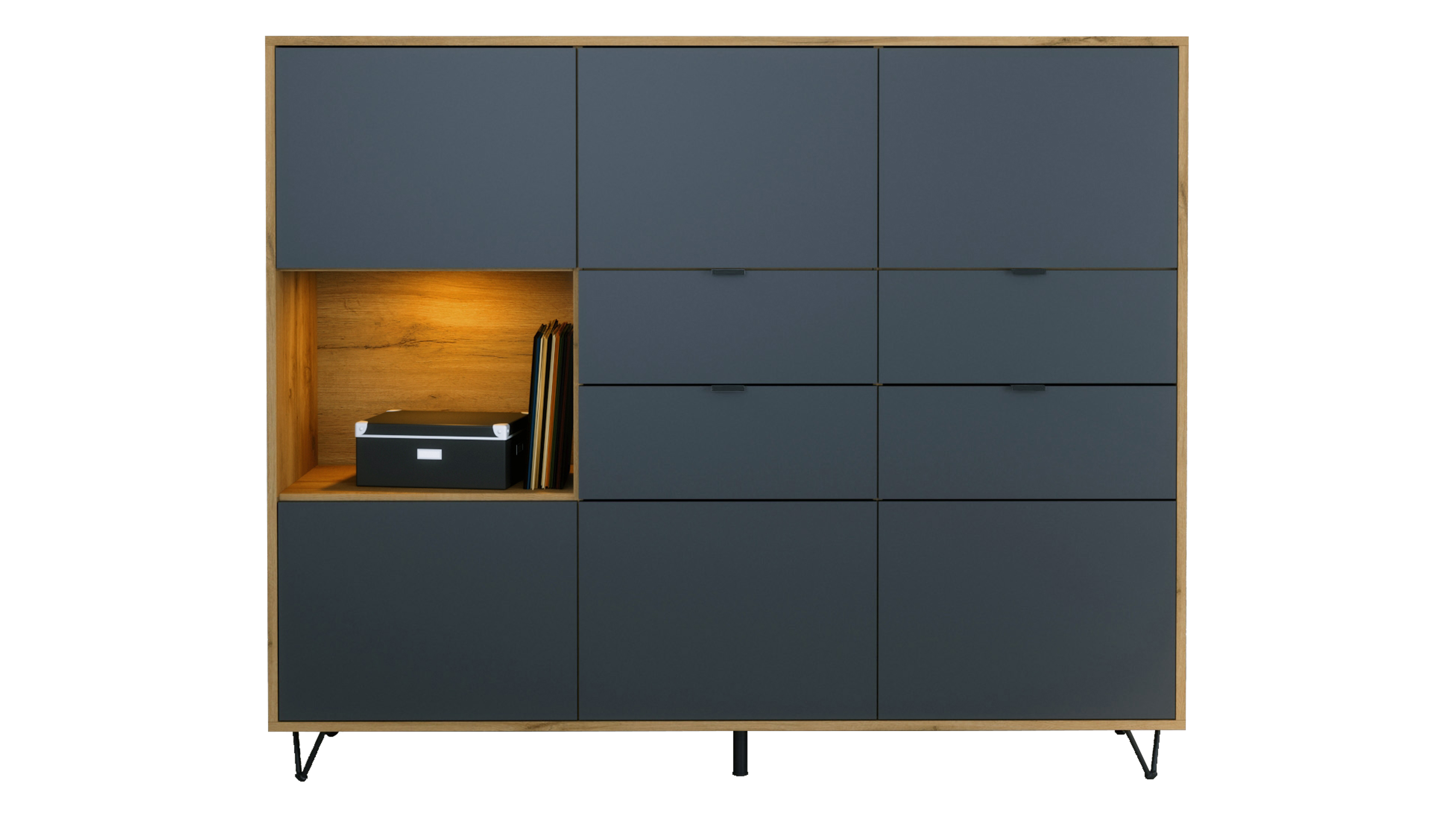 Hinter 6 Türen mit Push-to-Open verbergen sich 6 Fächer für Geschirr, Bücher oder Deko. Ein offenes Fach links mit LED hebt Lieblingsstücke hervor. 4 Schubladen bieten Platz für Besteck, Dokumente oder Kleinteile.