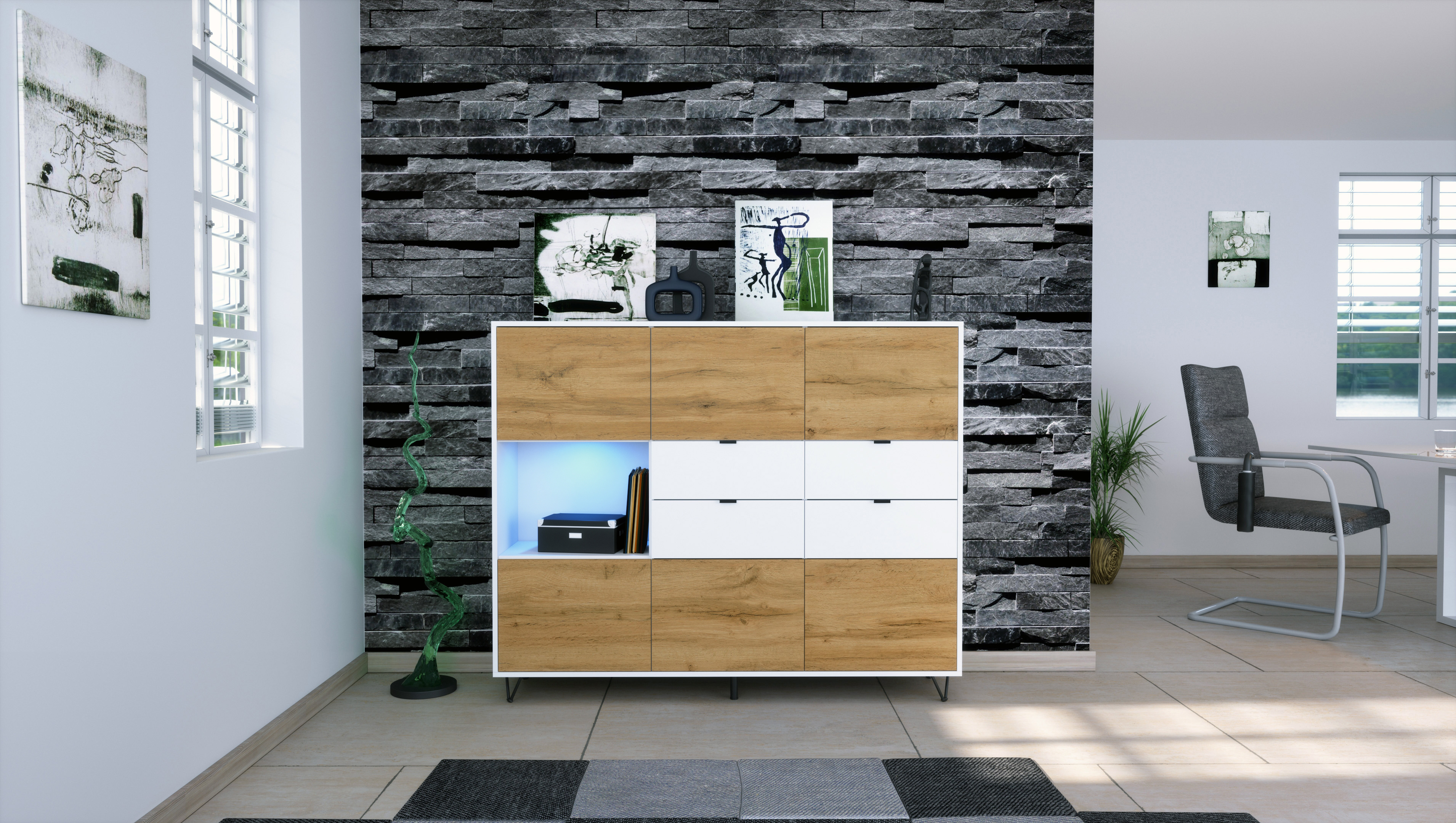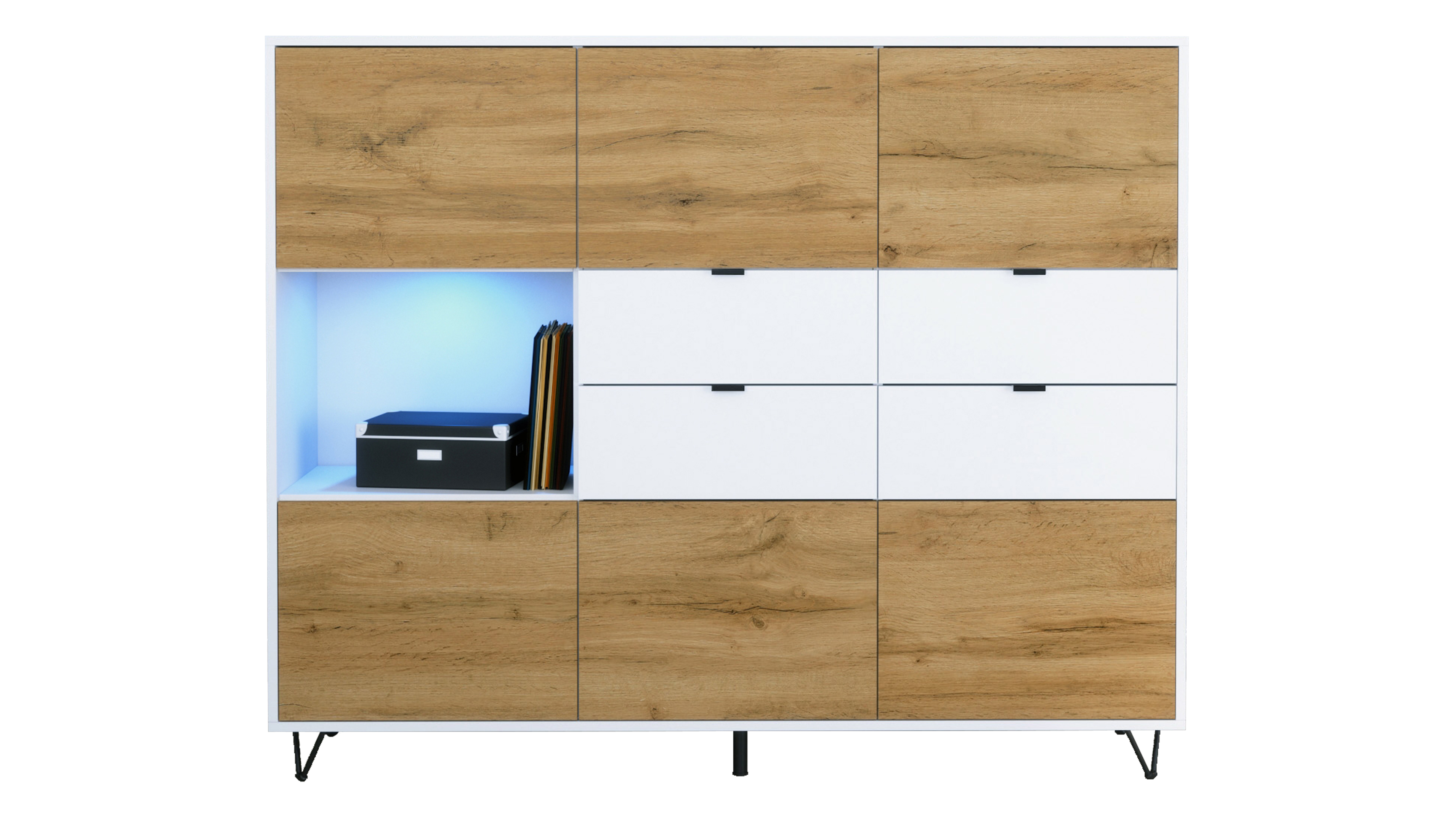 Hinter 6 Türen mit Push-to-Open verbergen sich 6 Fächer für Geschirr, Bücher oder Deko. Ein offenes Fach links mit LED hebt Lieblingsstücke hervor. 4 Schubladen bieten Platz für Besteck, Dokumente oder Kleinteile.