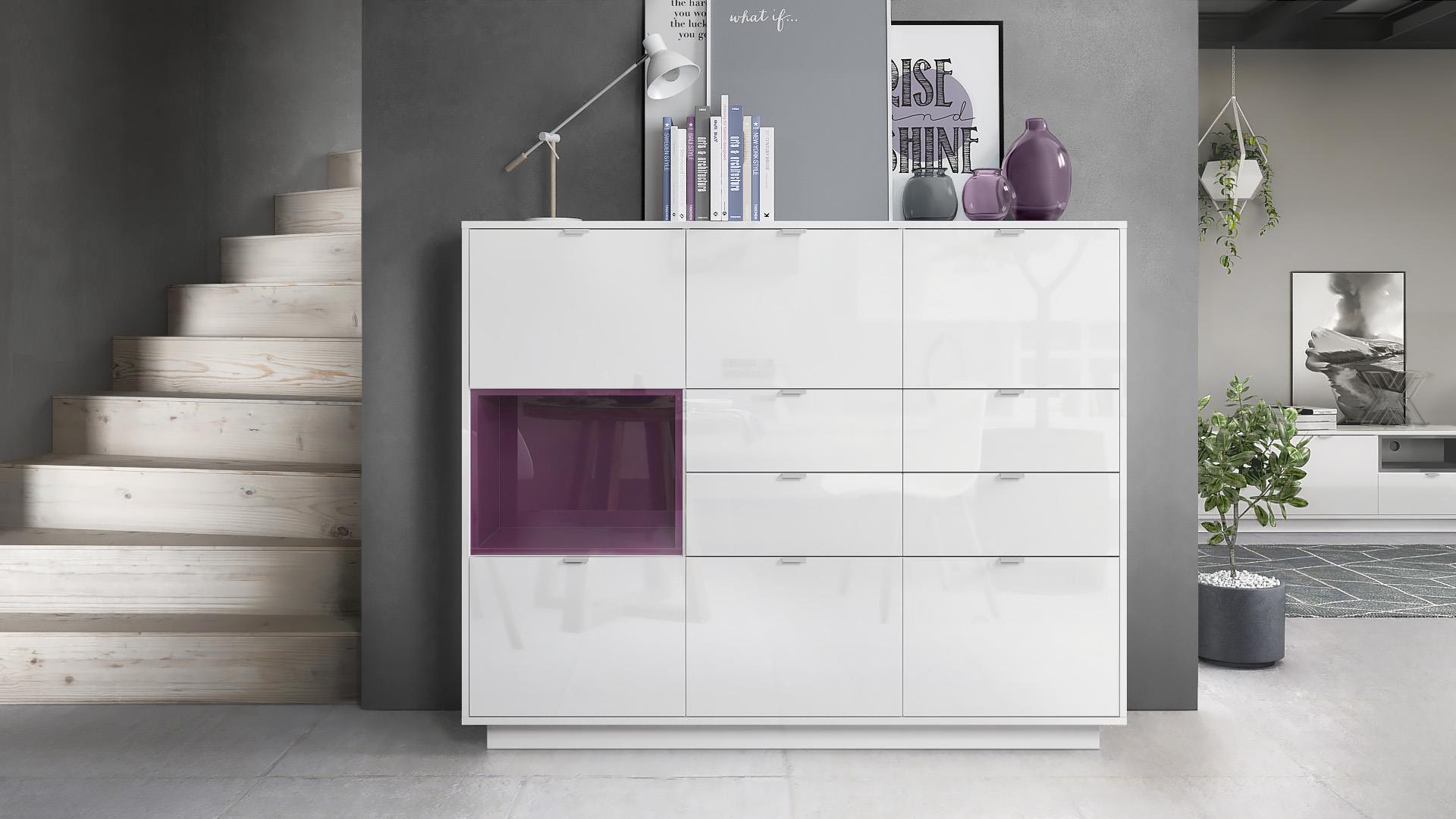 Produktinformationen "Highboard Metro V2 mit 6 Türen, 4 Schubladen und 1 offenem Fach Weiß glänzend/Brombeer glänzend inkl. LED Beleuchtung (153x123x38 cm)"