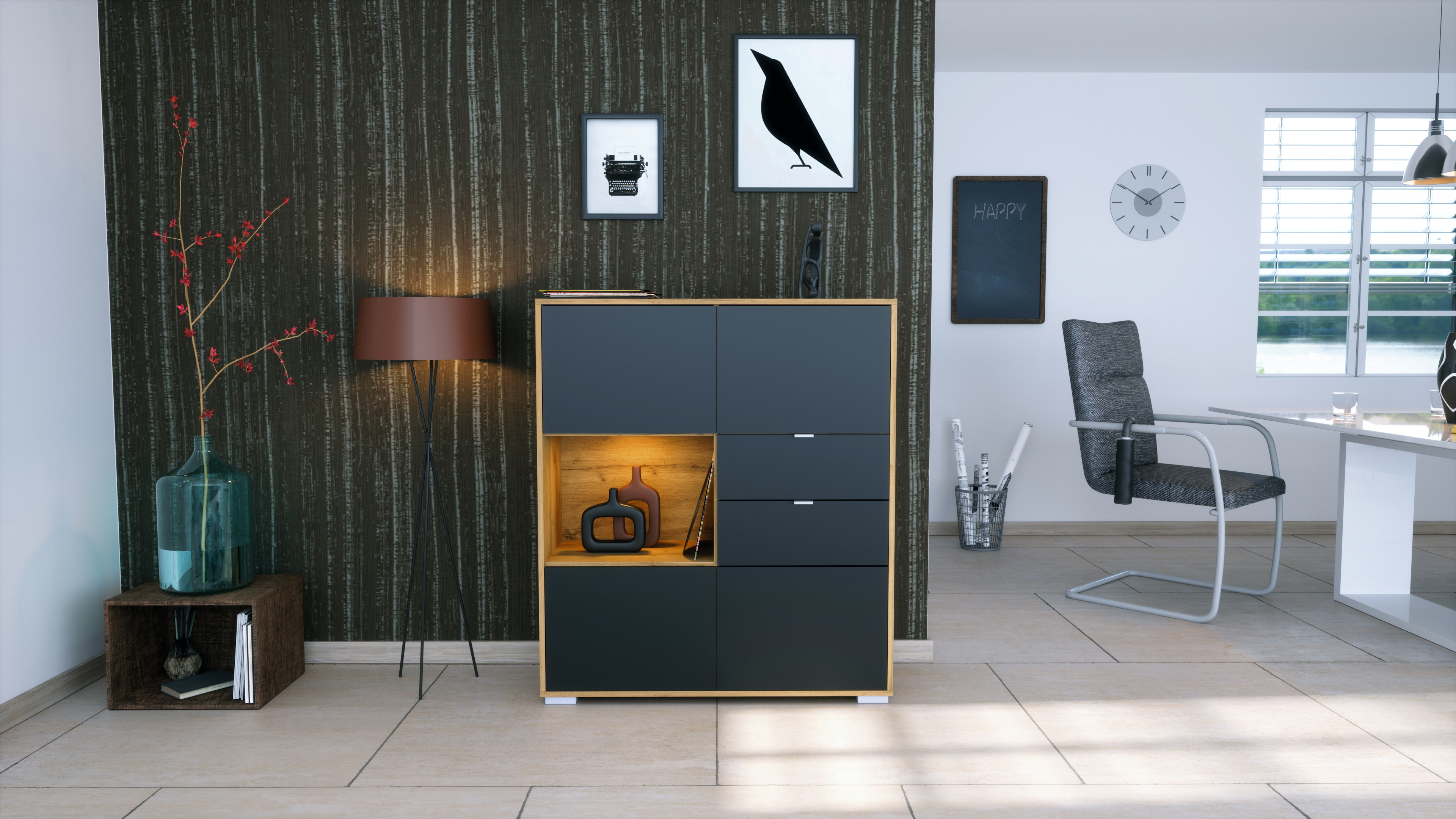 Produktinformationen "Highboard Milano V1 mit LED 2 Schubladen Schwarz matt, inkl. LED, Made in Germany Korpus Eiche Evoke (103 x 118 x 37 cm) "