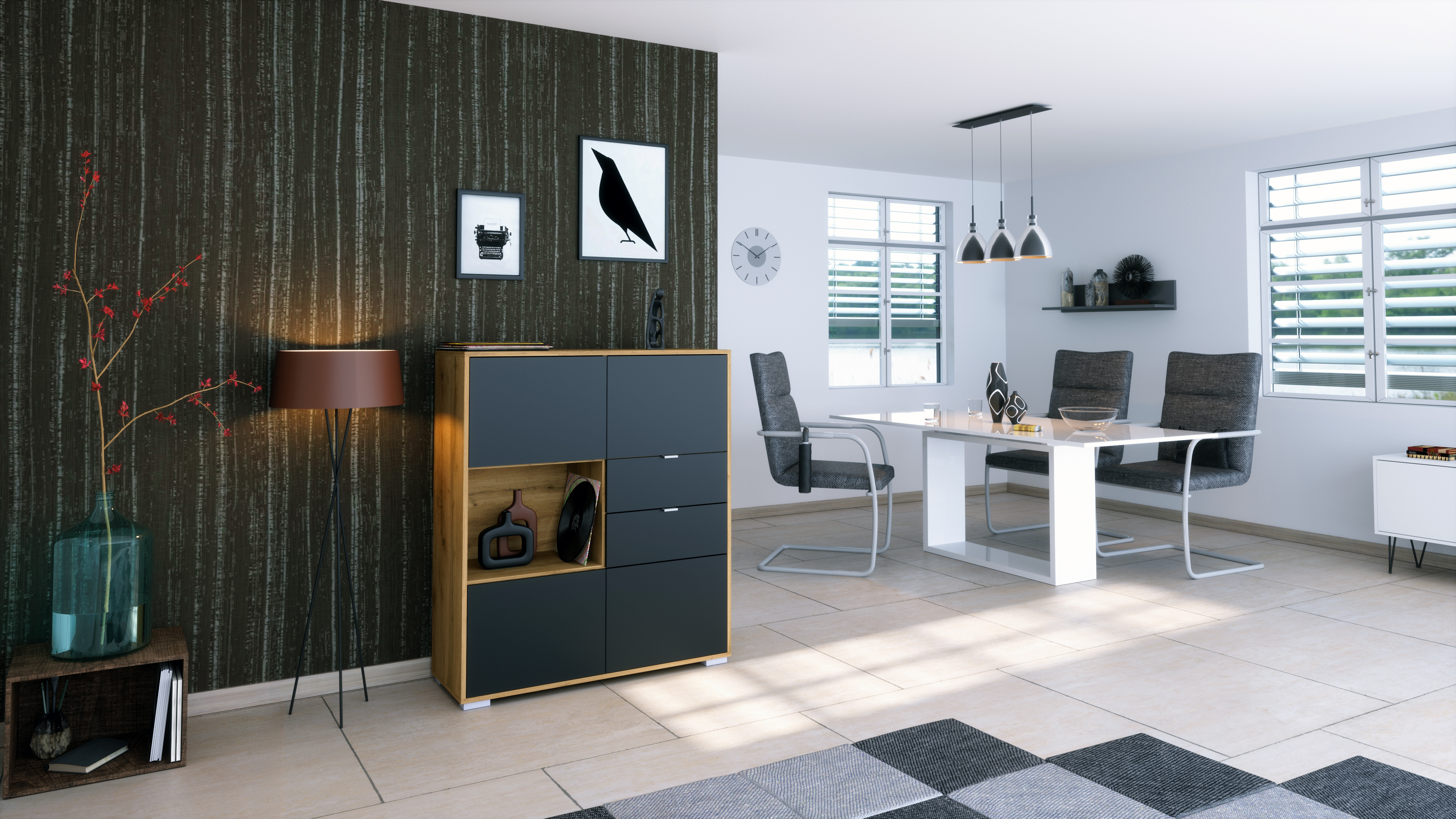 Gefertigt aus melaminbeschichteter Spanplatte überzeugt das Möbelstück durch Stabilität, Pflegeleichtigkeit und Langlebigkeit – Qualität Made in Germany. Ob als Highboard, Sideboard oder modernes Bücherregal – Milano passt in jedes Zuhause.