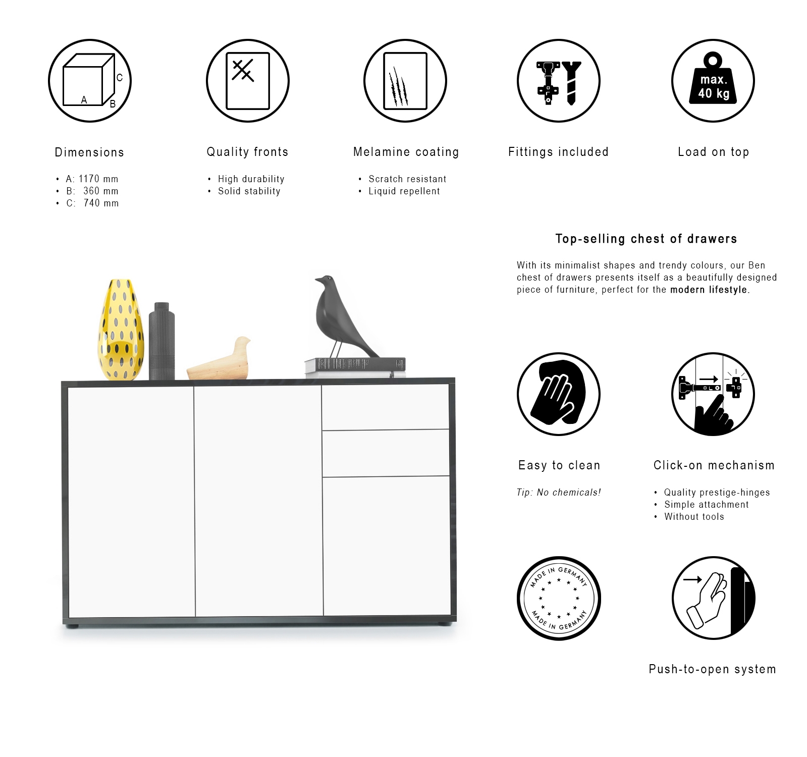 Ob als modernes Sideboard im Wohnzimmer, Kommodenschrank für‘s Schlafzimmer, Anrichte im Flur oder als Kommode im Kinderzimmer - die geräumige Kommode Ben V3 präsentiert sich als praktisches Möbelstück mit modernem Design, hergestellt in Deutschland. Der Beistellschrank ist mit zwei großen Türen, einer kleinen Tür und zwei leichtgängigen Schubladen ausgerüstet. Hinter den Türen befinden sich jeweils zwei geräumige Fächer mit Einlegeboden. Die Türen und Schubladen sind mit unserem Push-to-Open-System ausgestattet. Eine Rückwand in Holzoptik aus Hartfaserplatten ist im Lieferumfang enthalten.