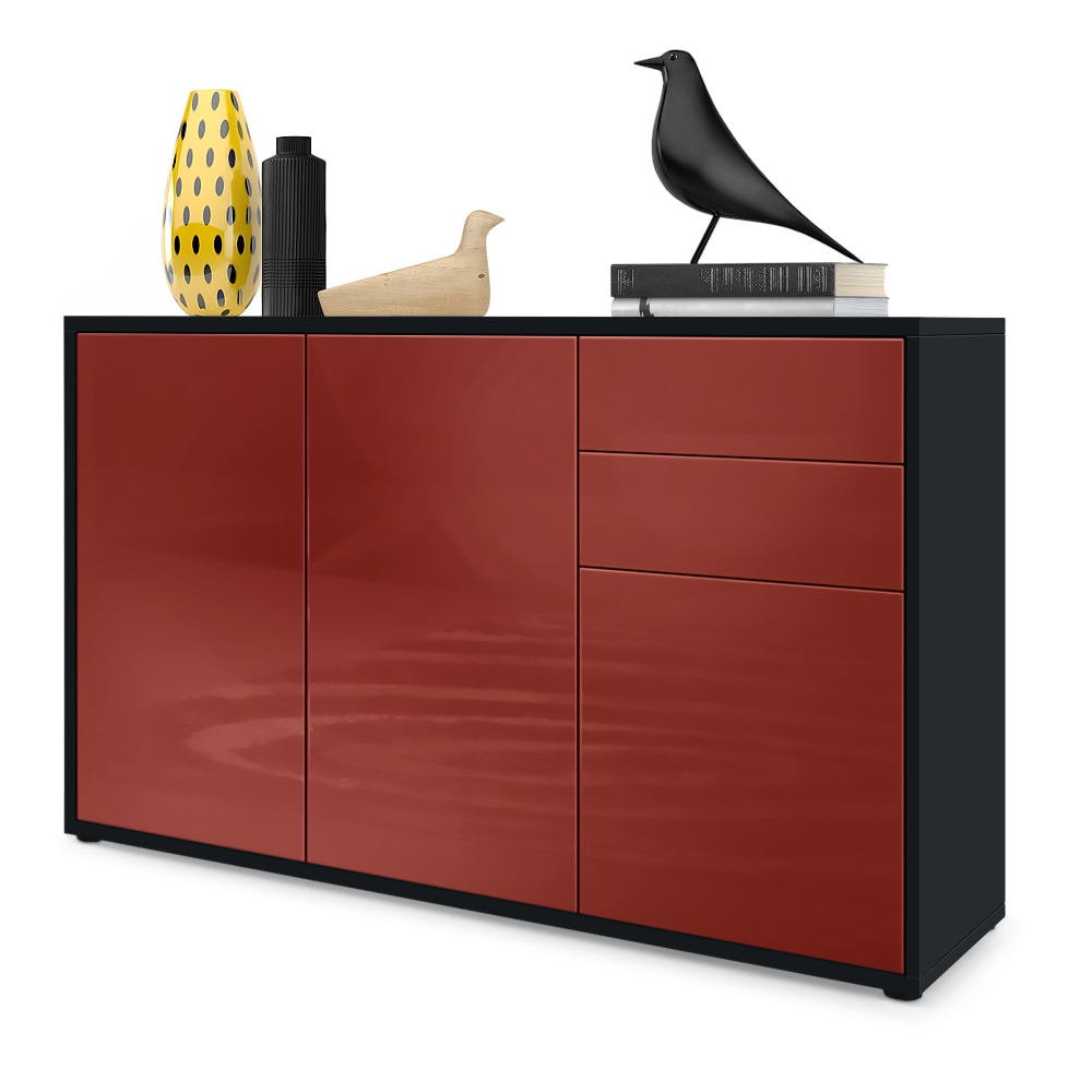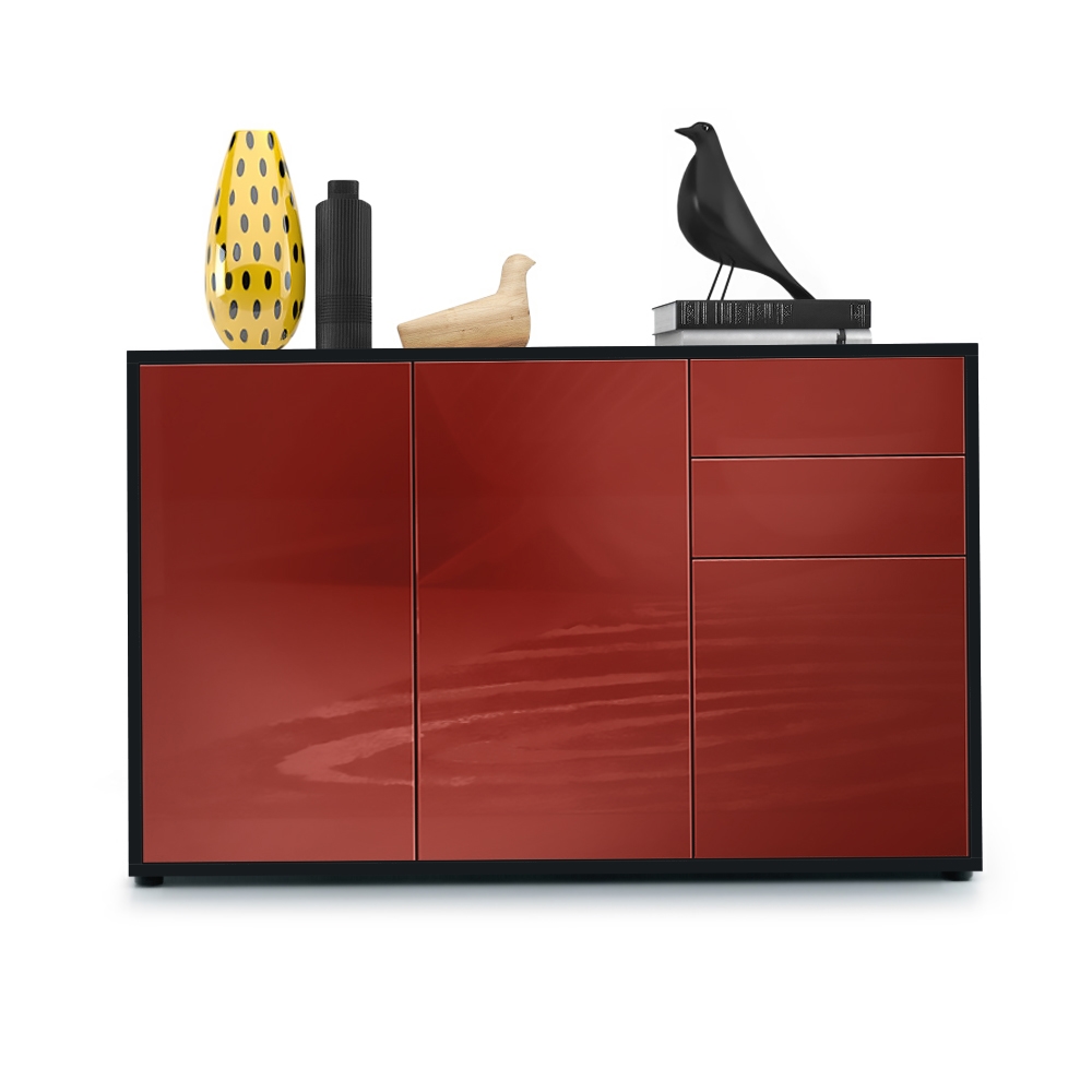 Produktinformationen "Kommode Ben V3 mit 3 Türen und 2 Schubladen Schwarz matt/ Bordeaux Hochglanz (117 x 74 x 36 cm)"