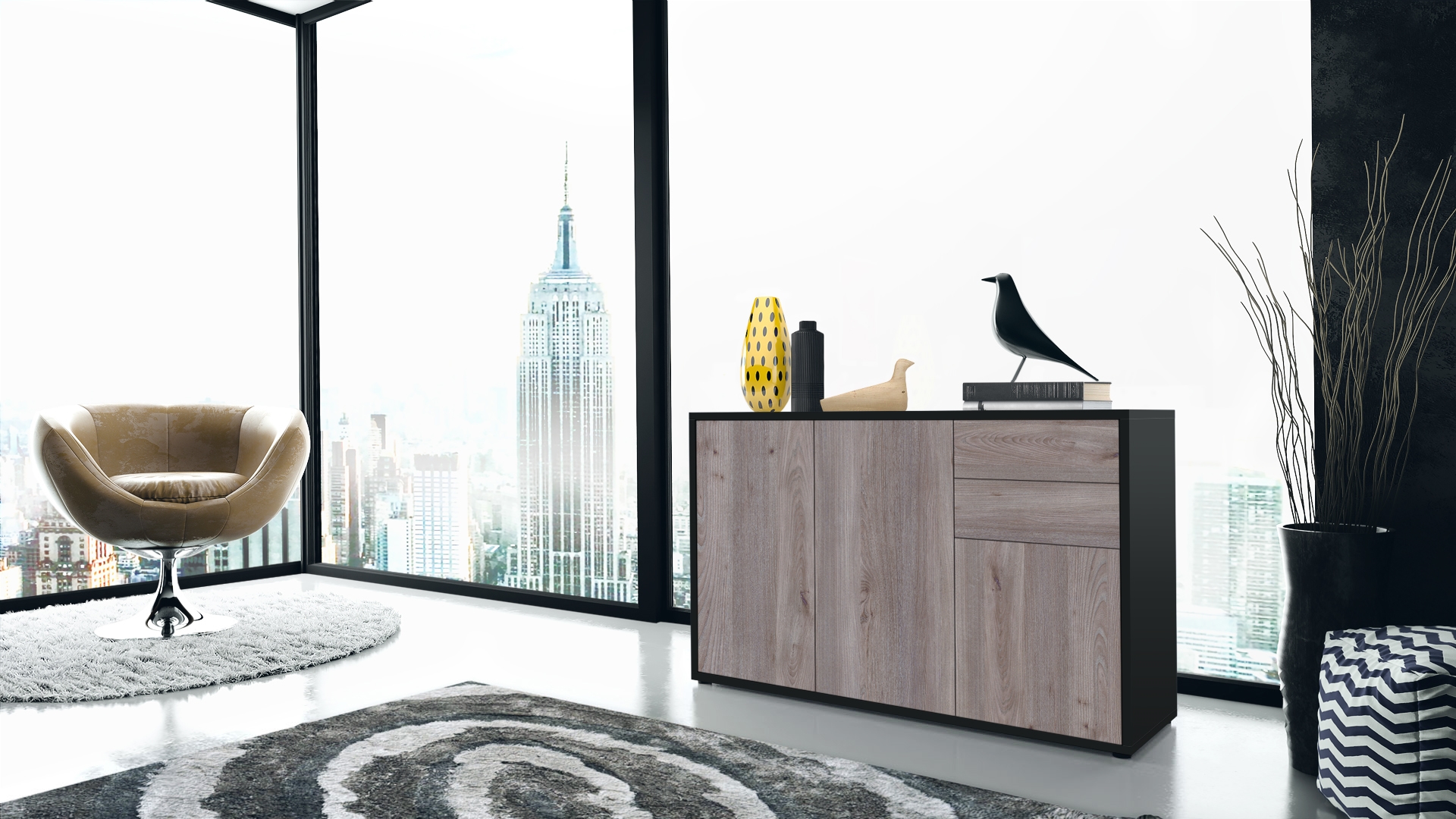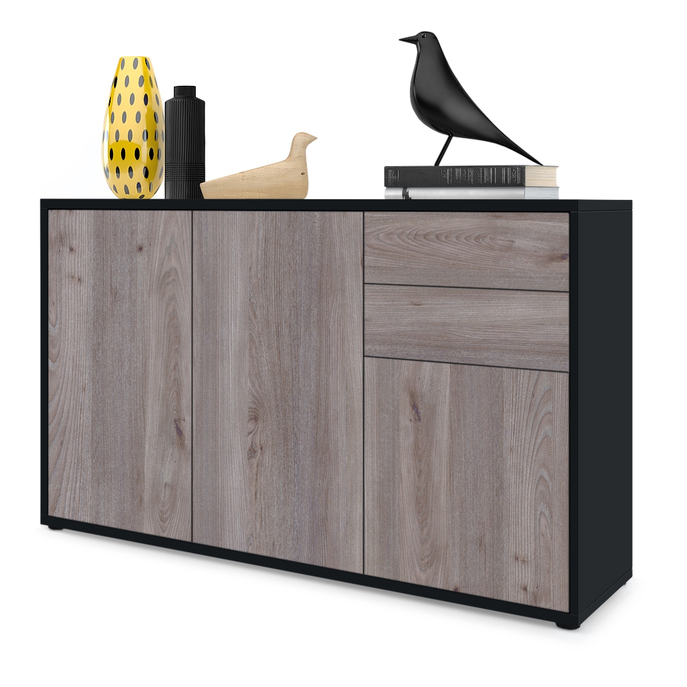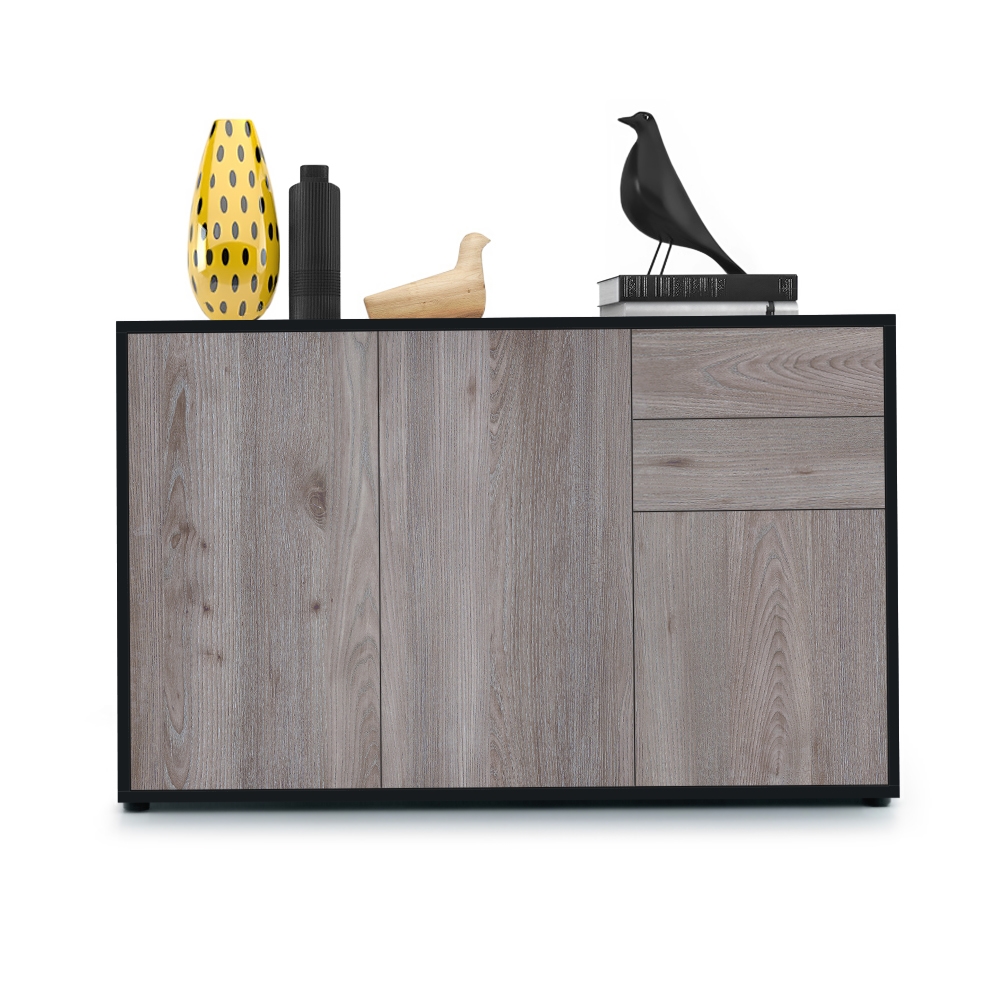 Produktinformationen "Kommode Ben V3 mit 3 Türen und 2 Schubladen Schwarz matt/Eiche Nordic (117 x 74 x 36 cm)"