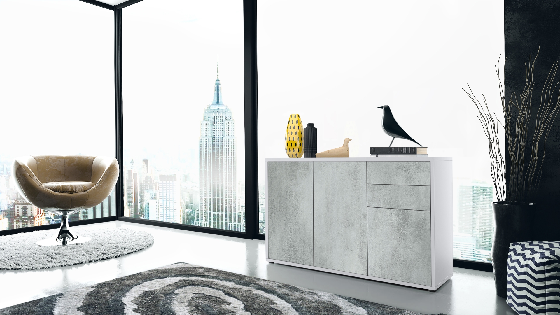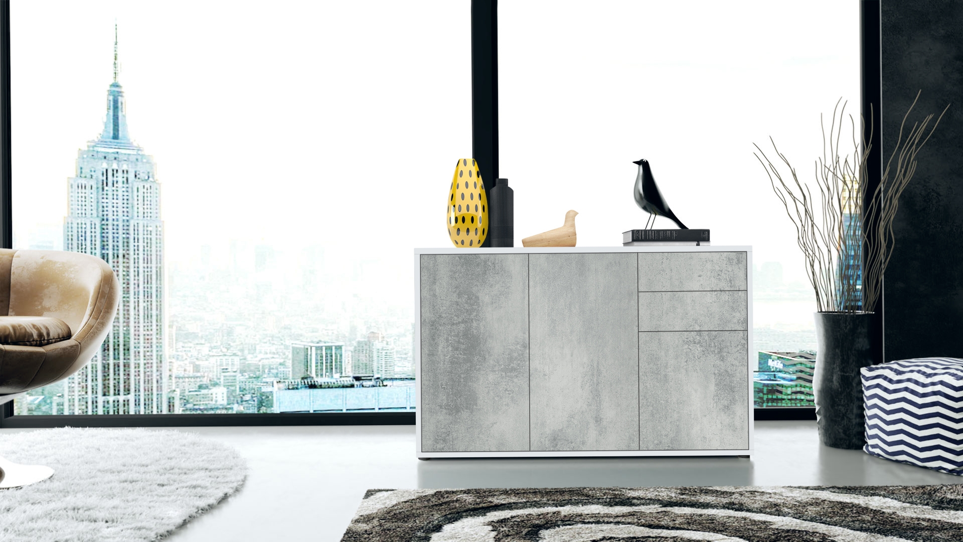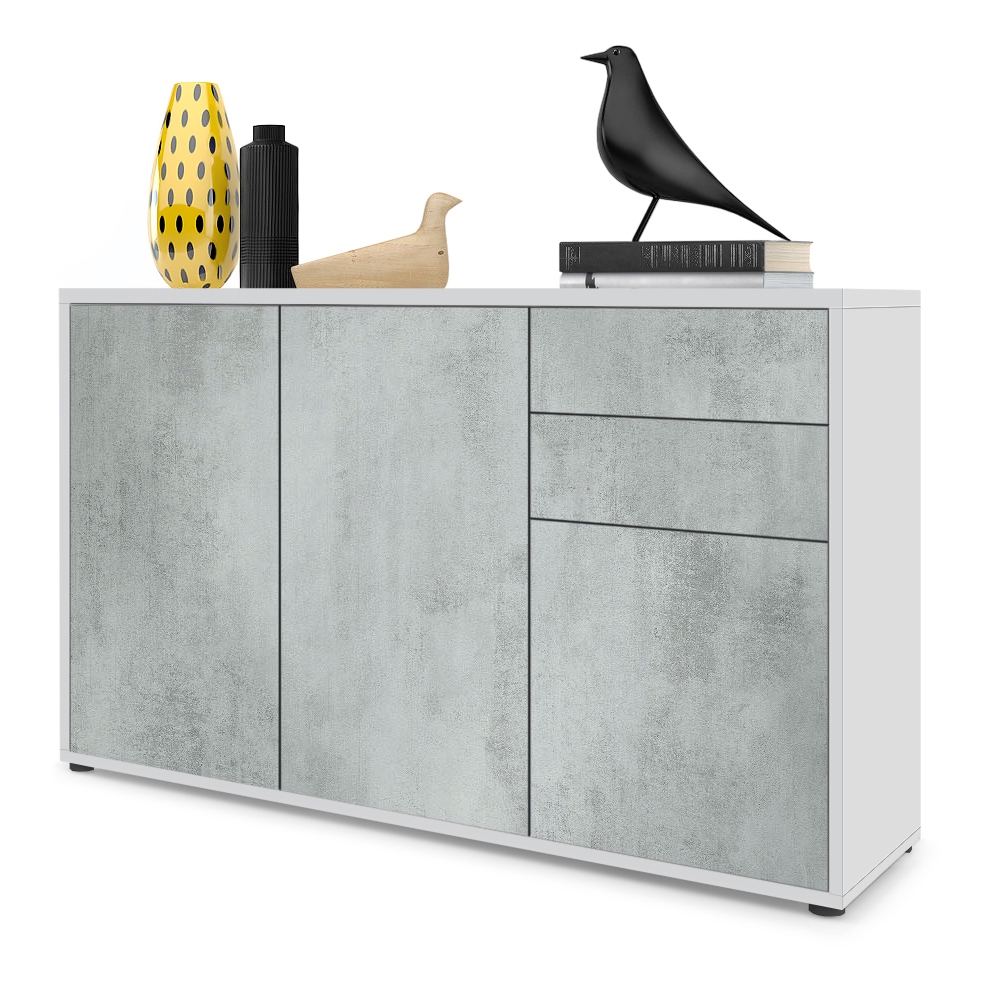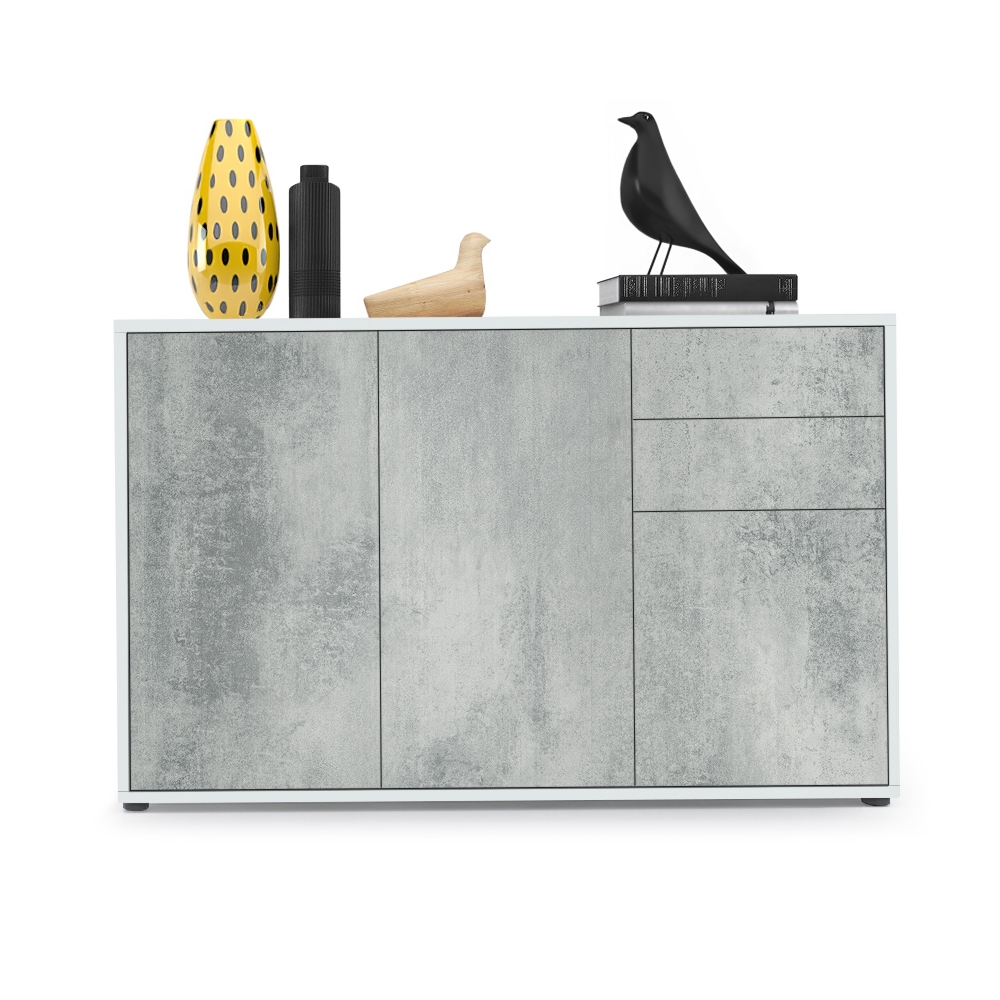 Produktinformationen "Kommode Ben V3 mit 3 Türen und 2 Schubladen Weiß matt/Beton Oxid-Optik (117 x 74 x 36 cm)"