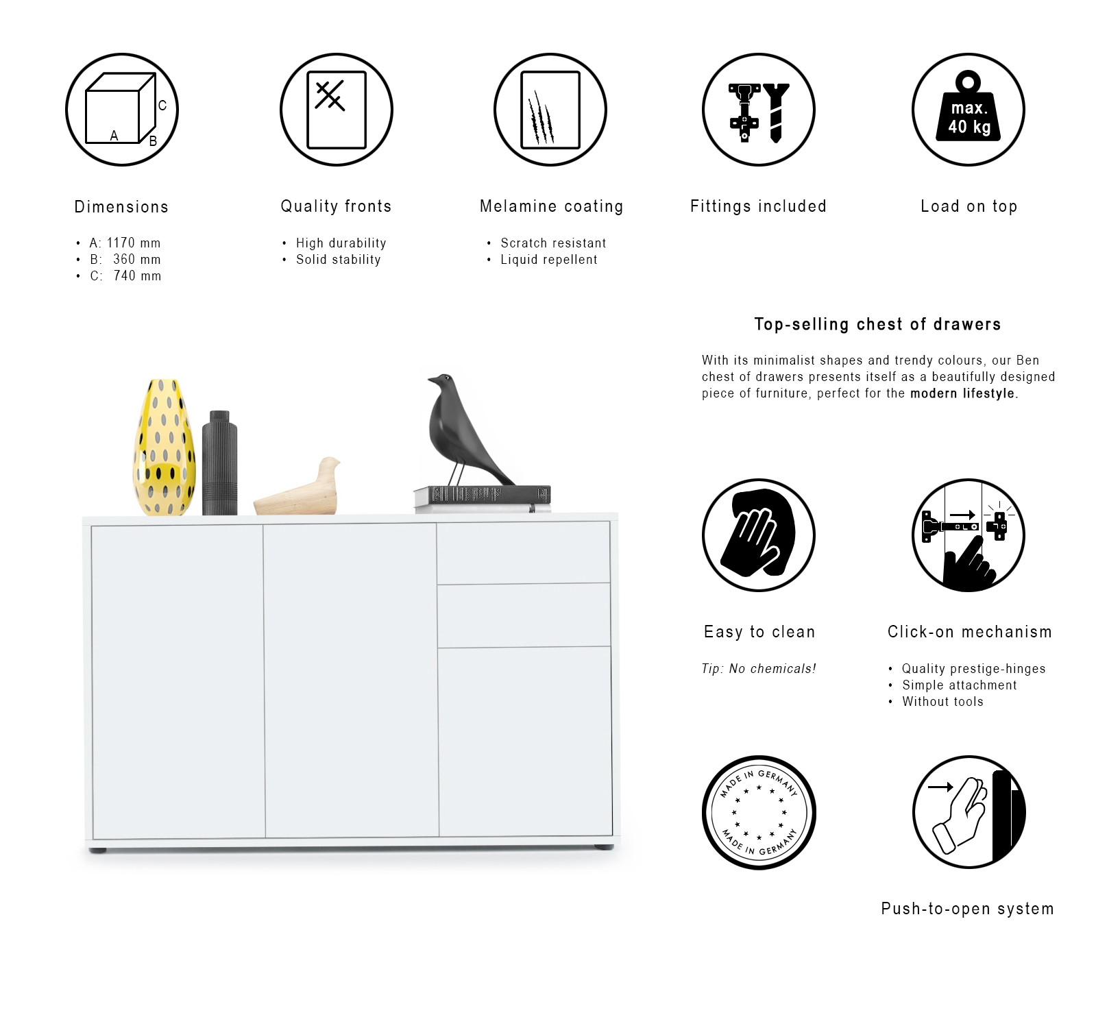 Ob als modernes Sideboard im Wohnzimmer, Kommodenschrank für‘s Schlafzimmer, Anrichte im Flur oder als Kommode im Kinderzimmer - die geräumige Kommode Ben V3 präsentiert sich als praktisches Möbelstück mit modernem Design, hergestellt in Deutschland. Der Beistellschrank ist mit zwei großen Türen, einer kleinen Tür und zwei leichtgängigen Schubladen ausgerüstet. Hinter den Türen befinden sich jeweils zwei geräumige Fächer mit Einlegeboden. Die Türen und Schubladen sind mit unserem Push-to-Open-System ausgestattet. Eine Rückwand in Holzoptik aus Hartfaserplatten ist im Lieferumfang enthalten.