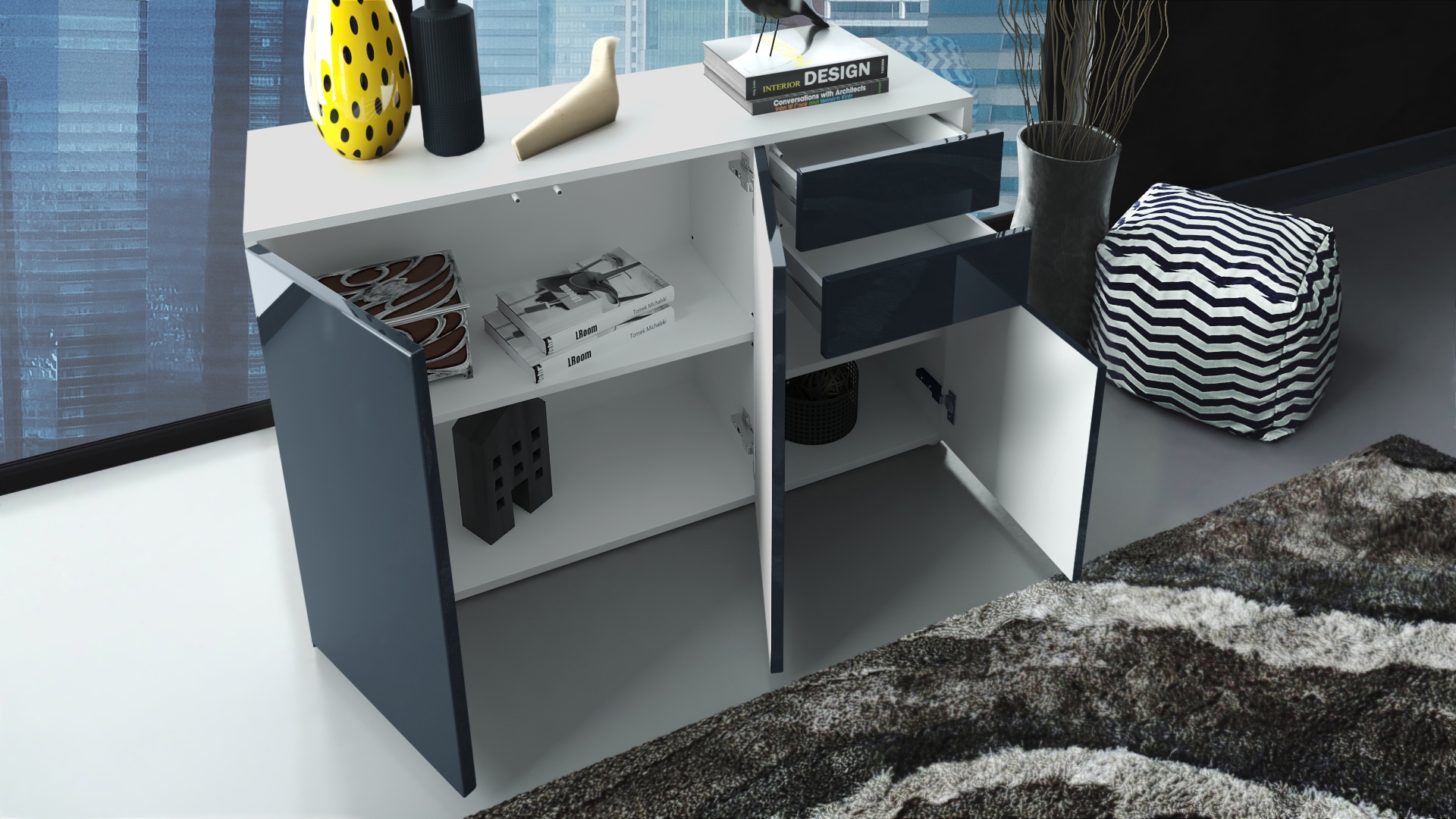 Durch das schlichte, moderne Design lässt sich die Kommode mit vielen verschiedenen Einrichtungsstilen kombinieren und sowohl als Wohnzimmerschrank, Kommode im Schlafzimmer oder als TV-Sideboard einsetzen. Für eine besondere Eleganz sorgen die Fronten der Türen- und Schubladenkommode, erhältlich in vielen verschiedenen Farbvarianten, die Ihnen eine Vielzahl an Kombinationsmöglichkeiten bieten. Durch die Oberflächenbeschichtung erhalten Sie ein besonders pflegeleichtes Produkt. Für die Reinigung können Sie auf Chemie verzichten - es reicht ein leicht angefeuchtetes Tuch, um die wasserfeste Oberfläche angemessen zu reinigen.