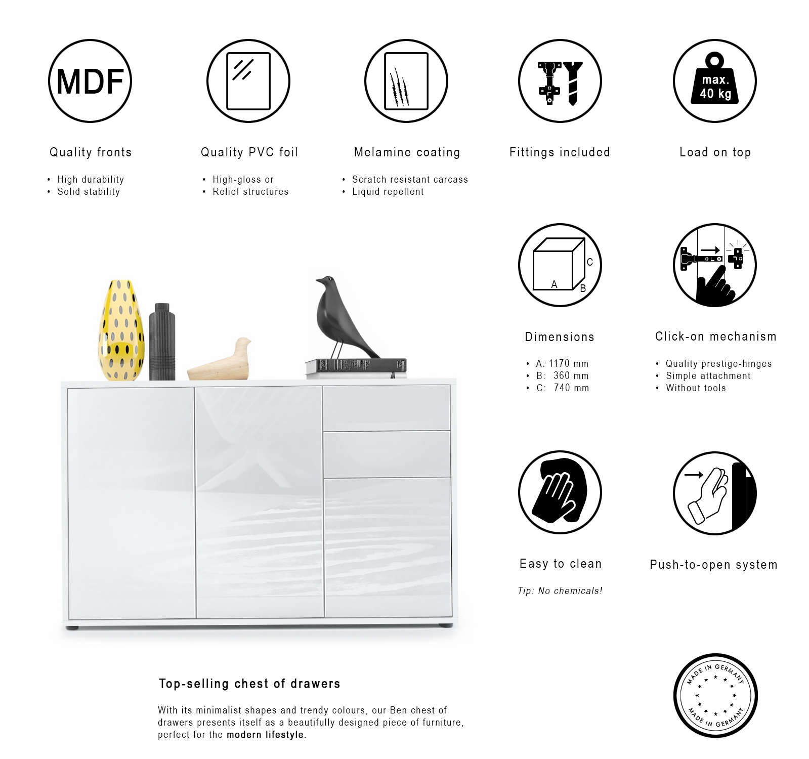 Ob als modernes Sideboard im Wohnzimmer, Kommodenschrank für‘s Schlafzimmer, Anrichte im Flur oder als Kommode im Kinderzimmer - die geräumige Kommode Ben V3 präsentiert sich als praktisches Möbelstück mit modernem Design, hergestellt in Deutschland. Der Beistellschrank ist mit zwei großen Türen, einer kleinen Tür und zwei leichtgängigen Schubladen ausgerüstet. Hinter den Türen befinden sich jeweils zwei geräumige Fächer mit Einlegeboden. Die Türen und Schubladen sind mit unserem Push-to-Open-System ausgestattet. Eine Rückwand in Holzoptik aus Hartfaserplatten ist im Lieferumfang enthalten.
