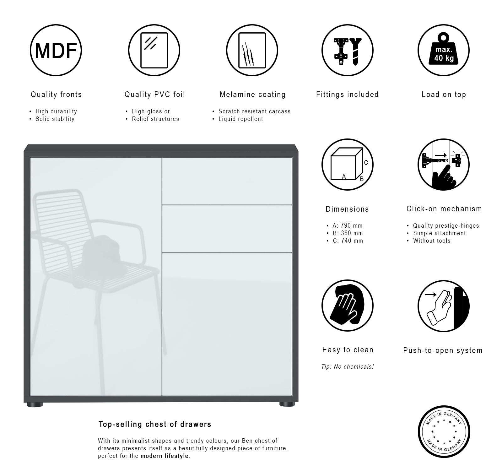 Ob als modernes Sideboard im Wohnzimmer, Kommodenschrank für's Schlafzimmer, Anrichte im Flur oder als Kommode im Kinderzimmer – die geräumige Kommode Ben präsentiert sich als praktisches Möbelstück mit modernem Design, hergestellt in Deutschland. Der Beistellschrank ist mit einer großen Tür, einer kleinen Tür und zwei leichtgängigen Schubladen ausgerüstet. Die Schubkästen verlaufen dank Laufschienen aus Metall nahezu geräuschlos und sorgen für eine leichte Handhabung. Hinter den Türen befinden sich jeweils zwei geräumige Fächer mit Einlegeboden. Die Türen und Schubladen sind mit unserem Push-to-Open-System ausgestattet. Eine Rückwand in Holzoptik aus Hartfaserplatten ist im Lieferumfang enthalten.