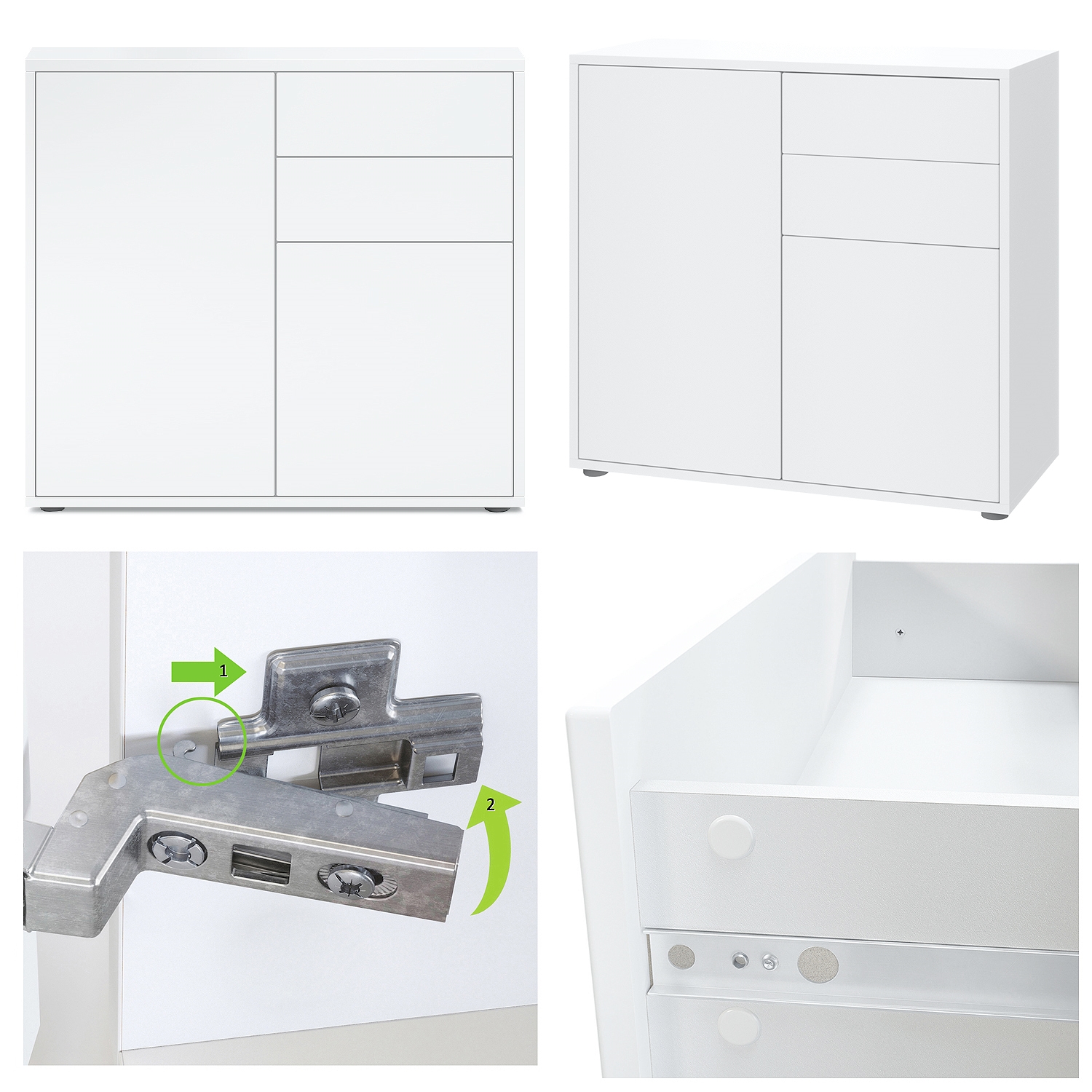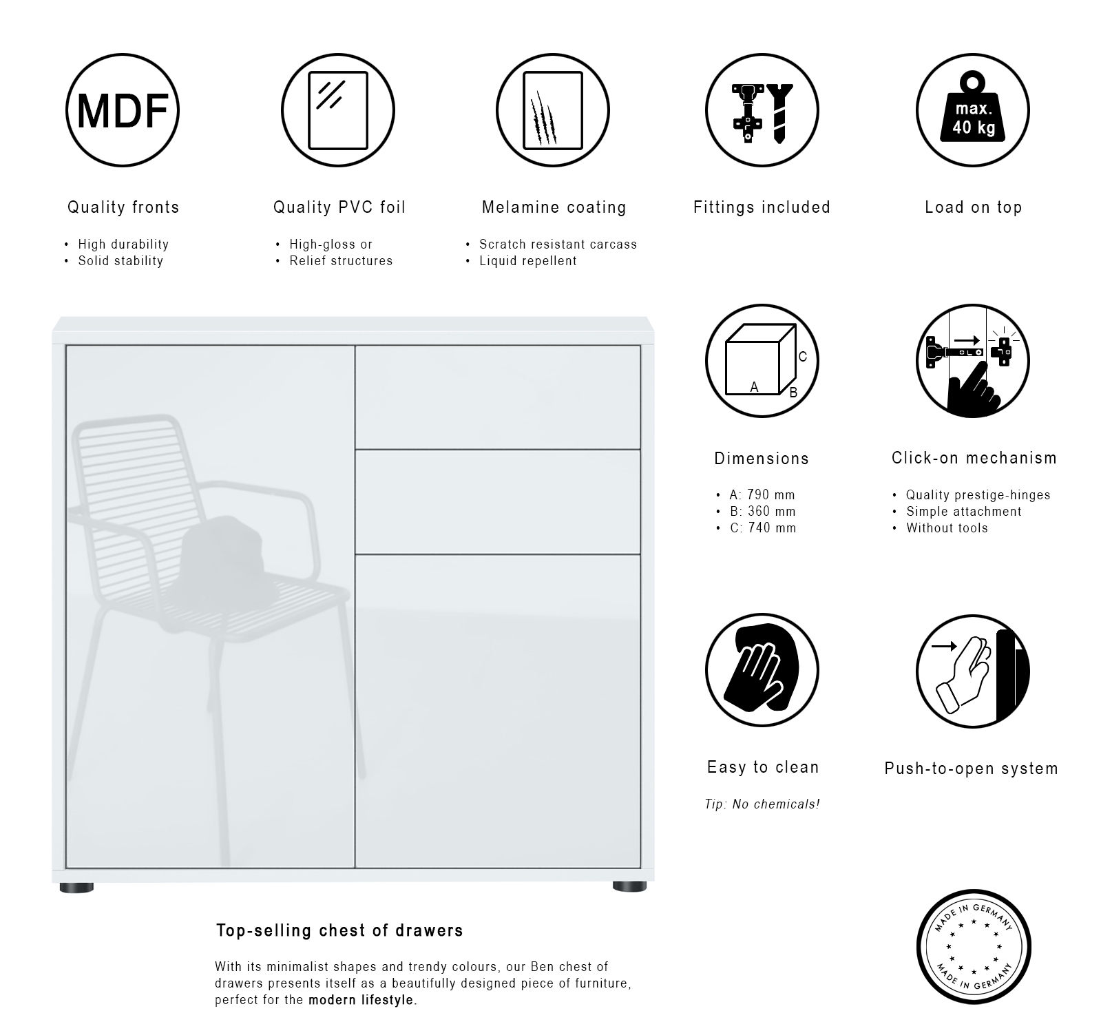 Ob als modernes Sideboard im Wohnzimmer, Kommodenschrank für's Schlafzimmer, Anrichte im Flur oder als Kommode im Kinderzimmer – die geräumige Kommode Ben präsentiert sich als praktisches Möbelstück mit modernem Design, hergestellt in Deutschland. Der Beistellschrank ist mit einer großen Tür, einer kleinen Tür und zwei leichtgängigen Schubladen ausgerüstet. Die Schubkästen verlaufen dank Laufschienen aus Metall nahezu geräuschlos und sorgen für eine leichte Handhabung. Hinter den Türen befinden sich jeweils zwei geräumige Fächer mit Einlegeboden. Die Türen und Schubladen sind mit unserem Push-to-Open-System ausgestattet. Eine Rückwand in Holzoptik aus Hartfaserplatten ist im Lieferumfang enthalten.