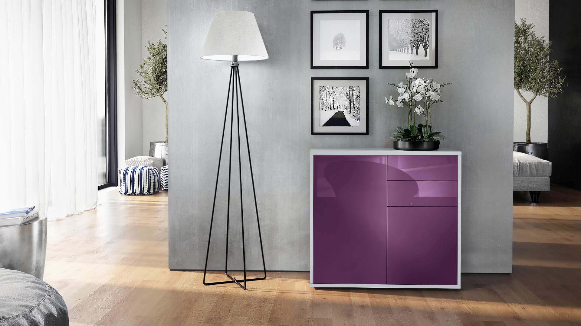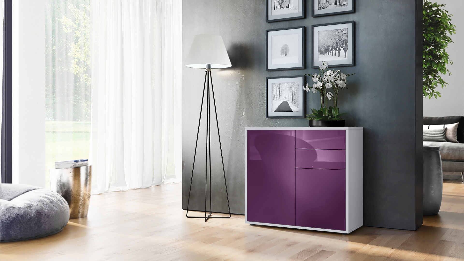 Produktinformationen "Kommode Ben mit 2 Türen und 2 Schubladen Weiß matt/Brombeer Hochglanz(79 x 74 x 36 cm)"