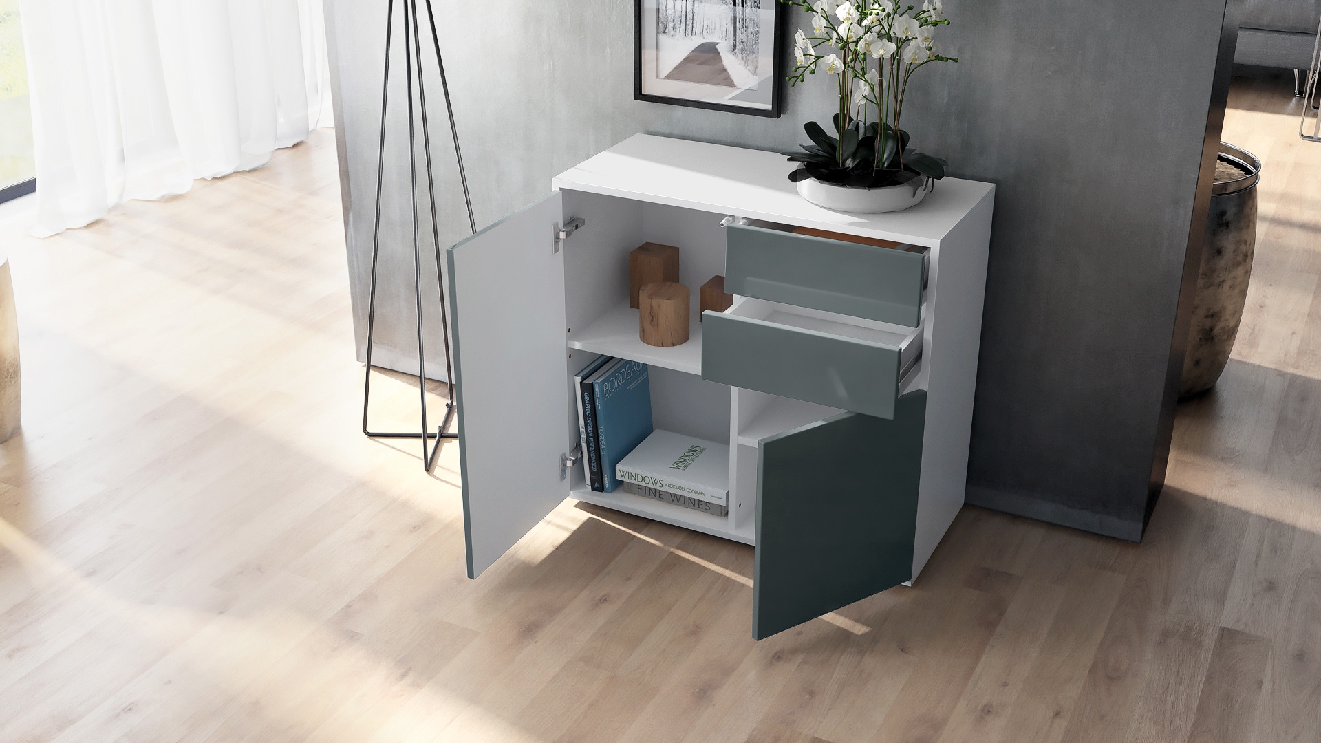 Durch das schlichte, moderne Design lässt sich die Kommode mit vielen verschiedenen Einrichtungsstilen kombinieren und sowohl als Wohnzimmerschrank, Kommode im Schlafzimmer oder als TV-Sideboard einsetzen. Für eine besondere Eleganz sorgen die Fronten der Türen- und Schubladenkommode, erhältlich in vielen verschiedenen Farbvarianten, die Ihnen eine Vielzahl an Kombinationsmöglichkeiten bieten. Durch die Oberflächenbeschichtung erhalten Sie ein besonders pflegeleichtes Produkt. Für die Reinigung können Sie auf Chemie verzichten - es reicht ein leicht angefeuchtetes Tuch, um die wasserfeste Oberfläche angemessen zu reinigen.