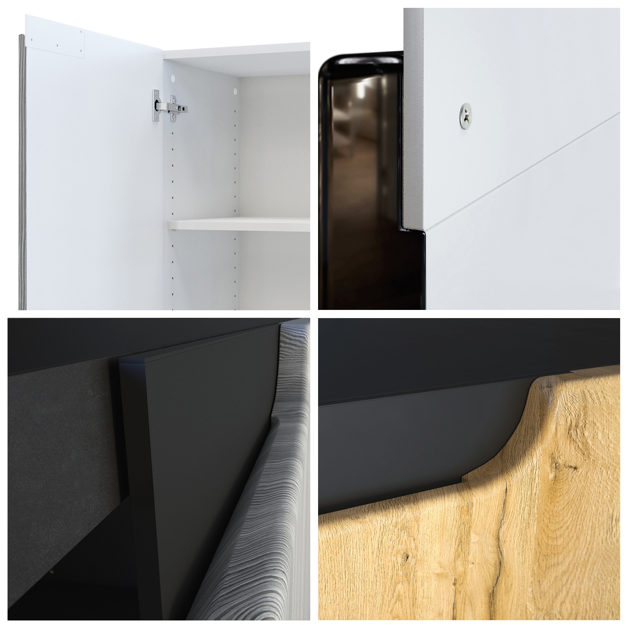 Ob als modernes Sideboard im Wohnzimmer, Kommodenschrank für's Schlafzimmer, Anrichte im Flur oder als Sideboard im Büro oder im Home Office - die geräumige Kommode Logan präsentiert sich als praktisches Möbelstück mit modernem Design, hergestellt in Deutschland. Der Beistellschrank ist mit zwei großen Türen ausgerüstet. Hinter den Türen befinden sich zwei geräumige Fächer mit einem Einlegeboden. Die Türen der Kommode sind mit unserem Soft-Close System ausgestattet und lassen sich ganz bequem durch Griffmulden in Korpusfarbe öffnen. Die Soft-Close-Scharniere sorgen für eine leichte Handhabung des Sideboards. Eine Rückwand in Holzoptik aus Hartfaserplatten ist im Lieferumfang enthalten.