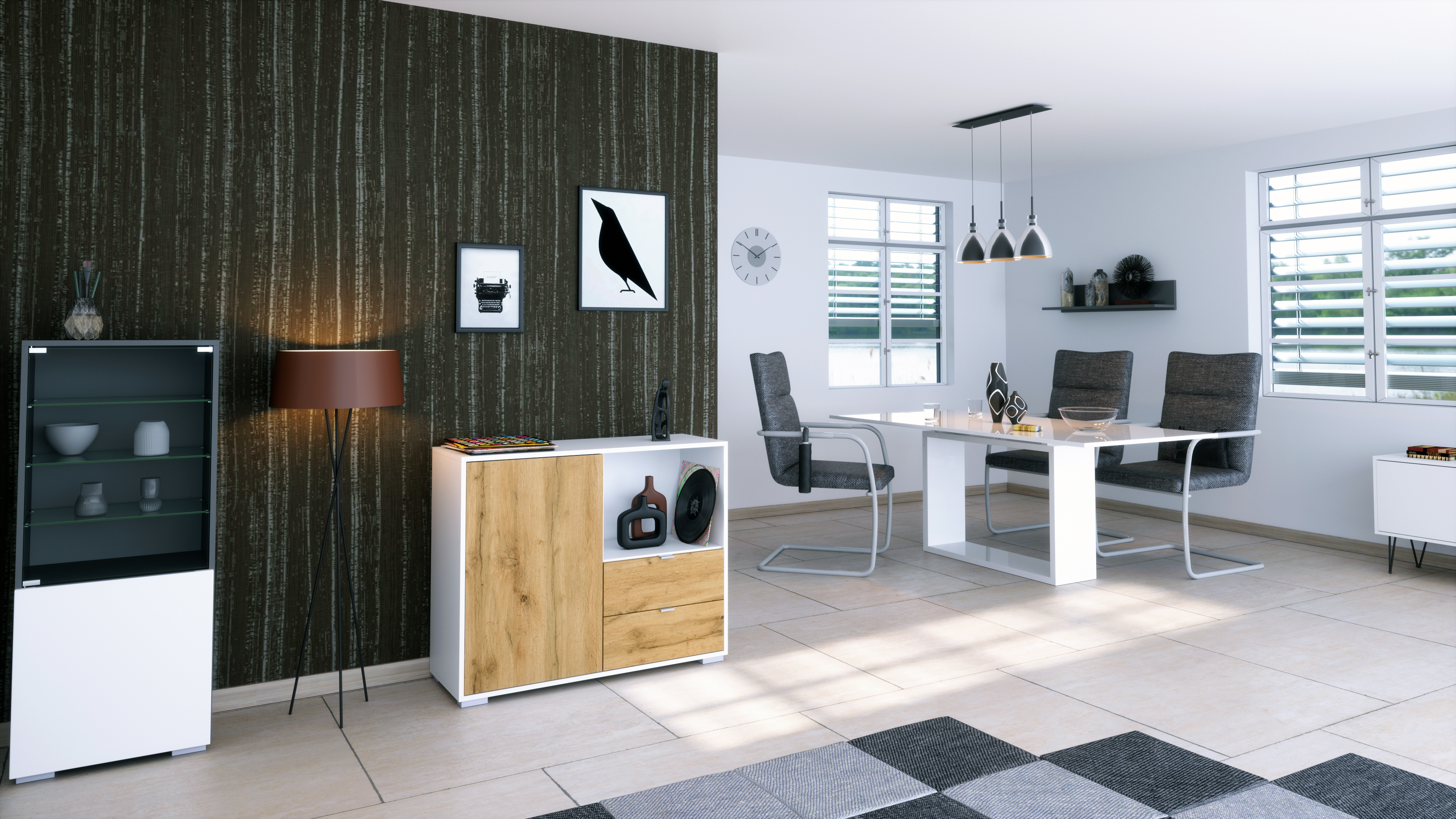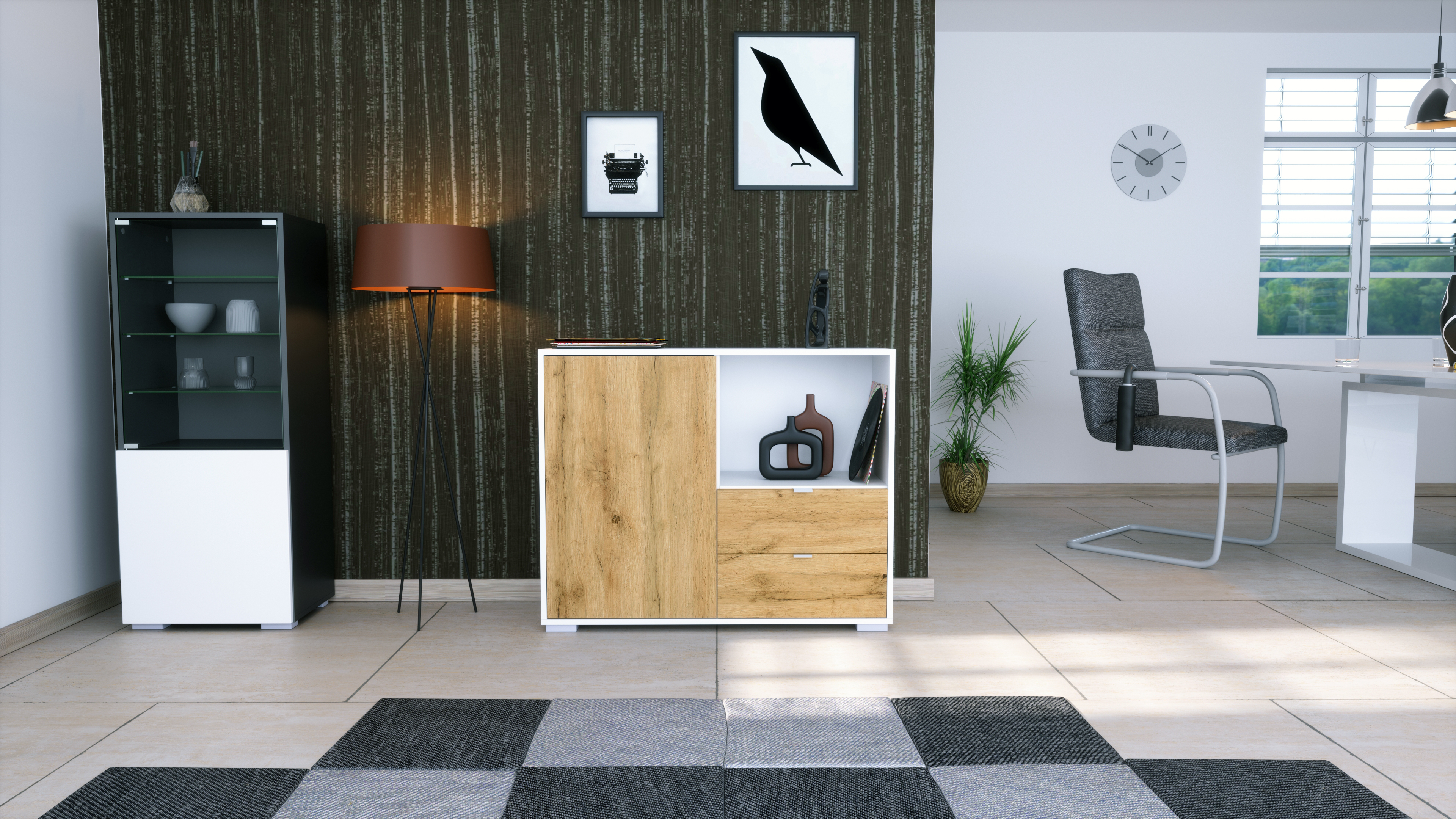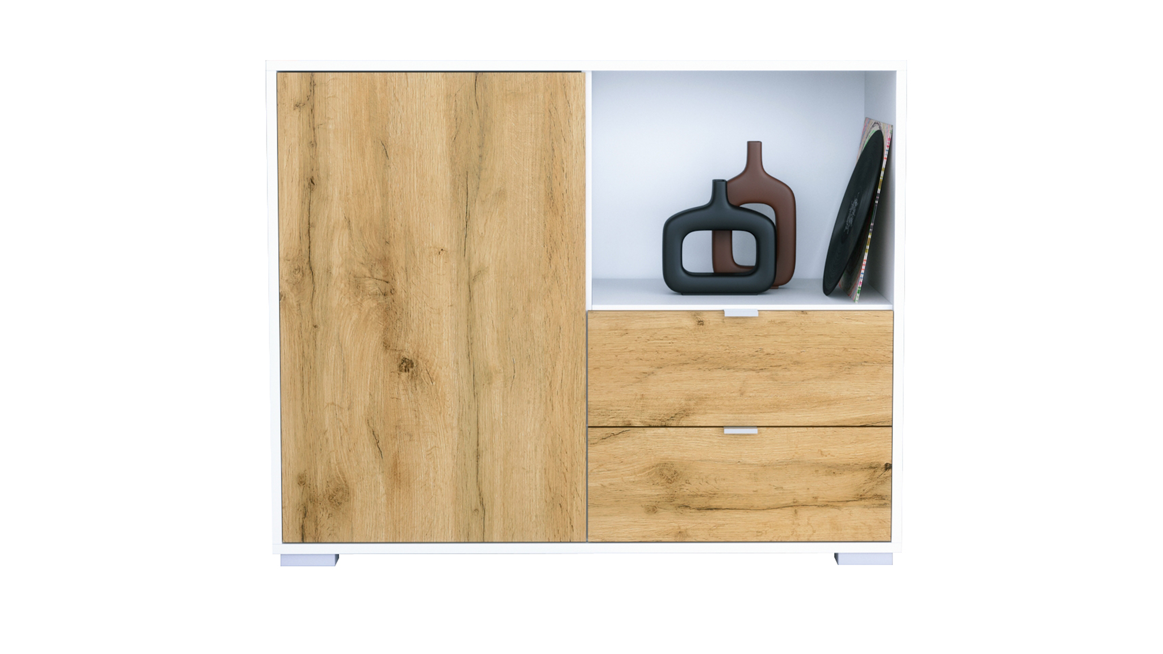 Hinter der einzigen Tür mit Push-to-Open-Funktion verbergen sich zwei praktische Innenfächer – ideal als Kommode, Schrank oder Aufbewahrungsschrank für Haushaltsgegenstände, Deko oder Geschirr. Auf der rechten Seite befindet sich ein offenes Fach, das sich ideal für Dekoration, Pflanzen oder Technik eignet. Direkt darunter liegen zwei geräumige Schubladen mit hochwertigen Metallgriffen, die viel Platz für Kleinteile, Besteck oder Dokumente bieten.