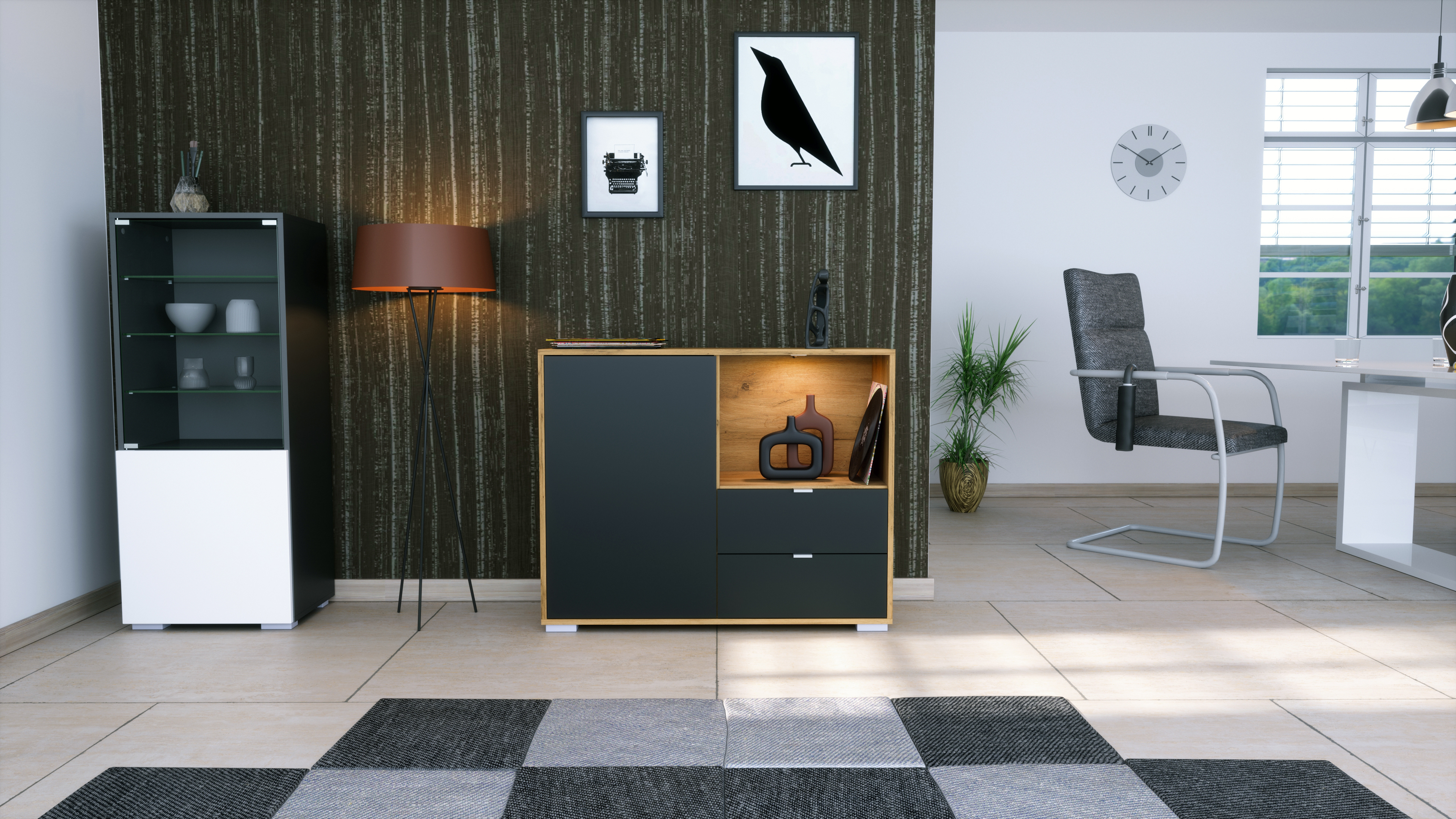 Produktinformationen "Kommode Milano mir LED 2 Schubladen Schwarz matt, inkl. LED, Made in Germany Korpus Eiche Evoke (103 x 83 x 37 cm) "