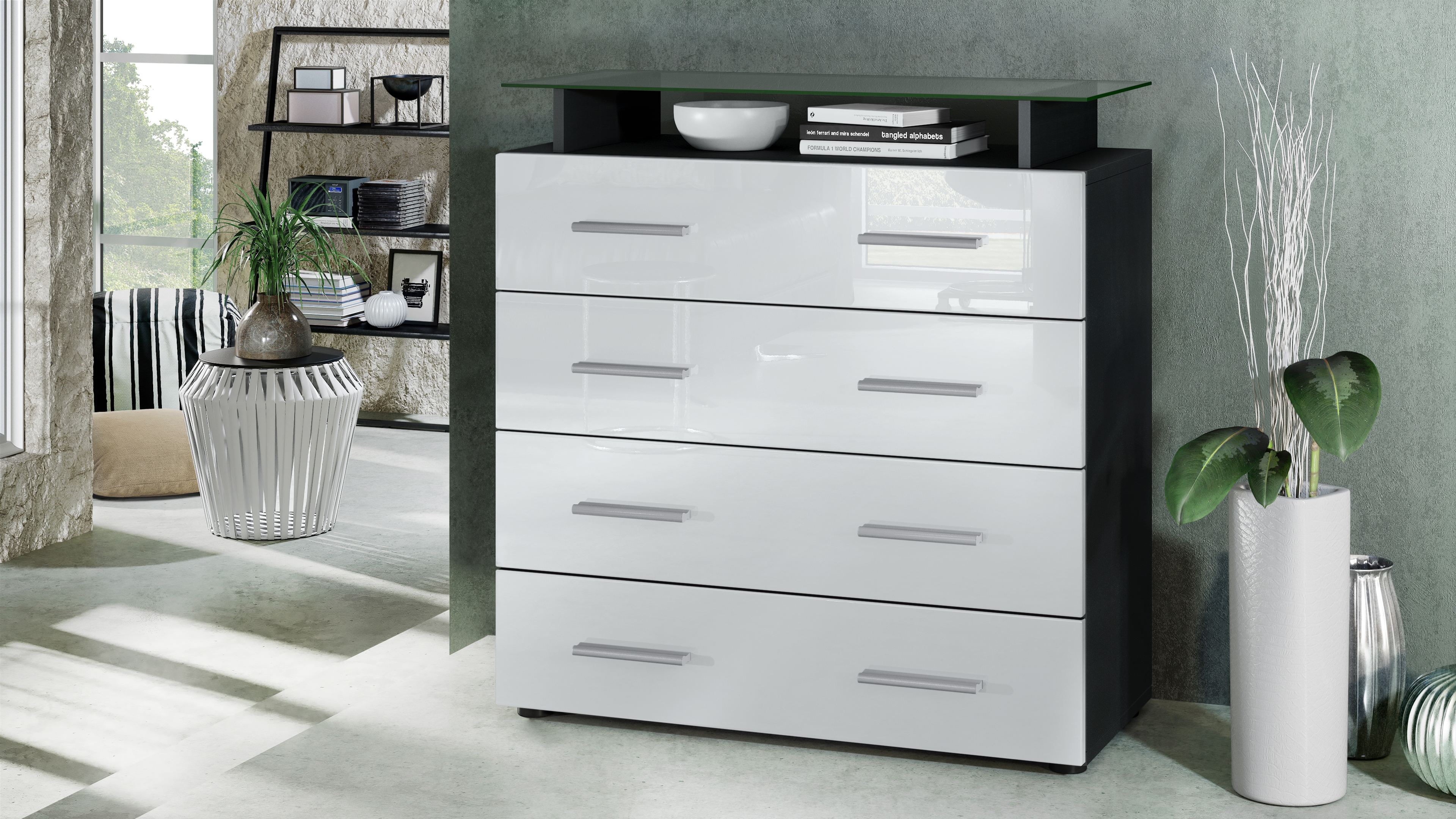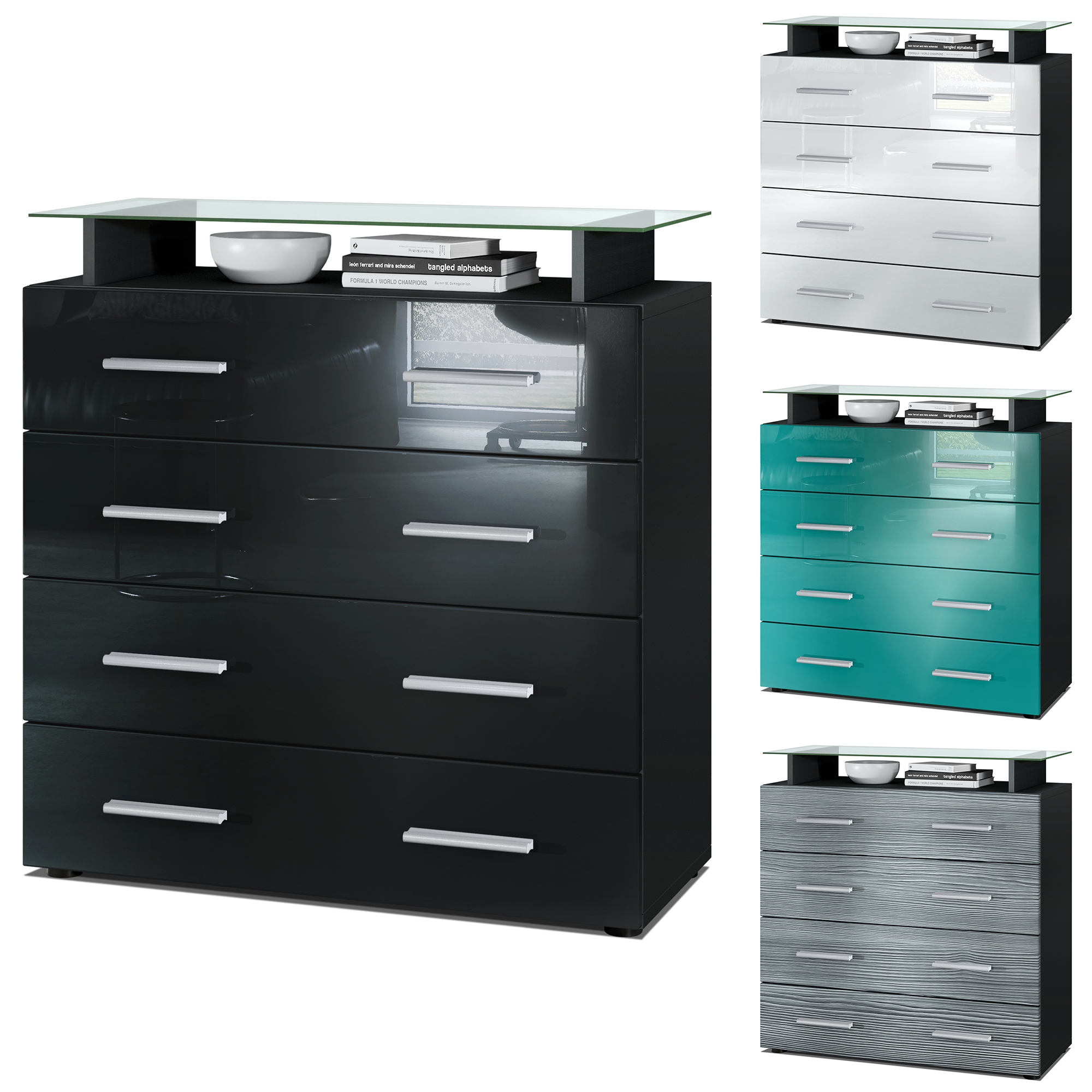 Produktinformationen "Kommode Pavos V2 mit 4 Schubladen und Glasablage Schwarz matt/Weiß Hochglanz (76 x 81 x 35 cm)"